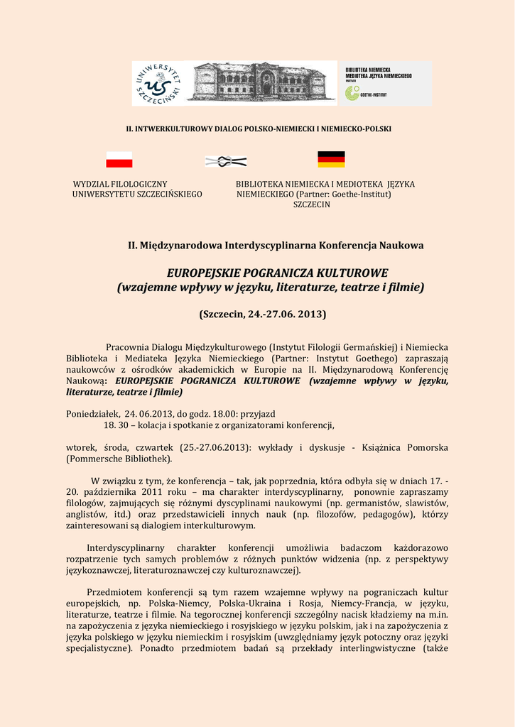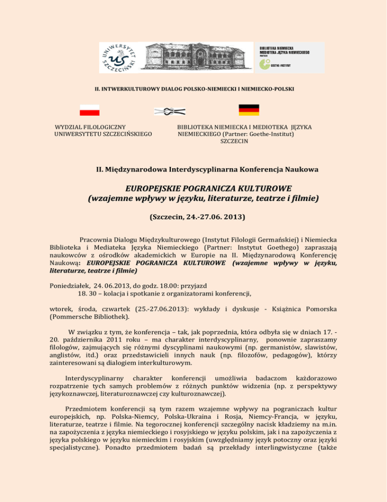 II. INTWERKULTUROWY DIALOG POLSKO-NIEMIECKI I NIEMIECKO-POLSKI WYDZIAL FILOLOGICZNY UNIWERSYTETU SZCZECIŃSKIEGO BIBLIOTEKA NIEMIECKA I MEDIOTEKA JĘZYKA NIEMIECKIEGO (Partner: Goethe-Institut) SZCZECIN II. Międzynarodowa Interdyscyplinarna Konferencja Naukowa EUROPEJSKIE POGRANICZA KULTUROWE (wzajemne wpływy w języku, literaturze, teatrze i filmie) (Szczecin, 24.-27.06. 2013) Pracownia Dialogu Międzykulturowego (Instytut Filologii Germańskiej) i Niemiecka Biblioteka i Mediateka Języka Niemieckiego (Partner: Instytut Goethego) zapraszają naukowców z ośrodków akademickich w Europie na II. Międzynarodową Konferencję Naukową: EUROPEJSKIE POGRANICZA KULTUROWE (wzajemne wpływy w języku, literaturze, teatrze i filmie) Poniedziałek, 24. 06.2013, do godz. 18.00: przyjazd 18. 30 – kolacja i spotkanie z organizatorami konferencji, wtorek, środa, czwartek (25.-27.06.2013): wykłady i dyskusje - Książnica Pomorska (Pommersche Bibliothek). W związku z tym, że konferencja – tak, jak poprzednia, która odbyła się w dniach 17. 20. października 2011 roku – ma charakter interdyscyplinarny, ponownie zapraszamy filologów, zajmujących się różnymi dyscyplinami naukowymi (np. germanistów, slawistów, anglistów, itd.) oraz przedstawicieli innych nauk (np. filozofów, pedagogów), którzy zainteresowani są dialogiem interkulturowym. Interdyscyplinarny charakter konferencji umożliwia badaczom każdorazowo rozpatrzenie tych samych problemów z różnych punktów widzenia (np. z perspektywy językoznawczej, literaturoznawczej czy kulturoznawczej). Przedmiotem konferencji są tym razem wzajemne wpływy na pograniczach kultur europejskich, np. Polska-Niemcy, Polska-Ukraina i Rosja, Niemcy-Francja, w języku, literaturze, teatrze i filmie. Na tegorocznej konferencji szczególny nacisk kładziemy na m.in. na zapożyczenia z języka niemieckiego i rosyjskiego w języku polskim, jak i na zapożyczenia z języka polskiego w języku niemieckim i rosyjskim (uwzględniamy język potoczny oraz języki specjalistyczne). Ponadto przedmiotem badań są przekłady interlingwistyczne (także literackie), wspólne konwencje transkulturowe konteksty w literaturze, teatrze i filmie, intertekstualność, Materiały z konferencji po uzyskaniu pozytywnej recenzji zostaną również tym razem opublikowane. Owo kompendium powinno dać wyraz temu, jak polska i niemiecka kultura przedstawia się w splocie wzajemnych zależności, np. językowych i literackich na tle całościowego europejskiego kontekstu. Proponowane obszary tematyczne: Przekłady interlingwistyczne (także literackie) z języków krajów sąsiadujących (np. asymetria językowa, obrazy świata, strategie tłumaczy) Wspólne konwencje w języku. literaturze, filmie i teatrze Literatura a muzyka lub sztuki plastyczne, względnie mit Intertekstualność („intertekst“ oznacza tutaj dzieło sztuki, np. literatura, muzyka, sztuki plastyczne) Wzajemne zapożyczenia z języków krajów sąsiadujących Wzajemna recepcja (literatura, teatr, muzyka, film, sztuki plastyczne). Kilka ważnych informacji dotyczących organizacji konferencji: 1. Miejsce konferencji: Szczecin, Książnica Pomorska (Pommersche Bibliothek), Sala im. Stefana Flukowskiego (Stefan-Flukowski-Saal), UL Podgórna 15-16, wejście: Ul. Podgórna 8 2. Języki konferencji: polski i niemiecki 3. Prezentacja referatu nie może przekraczać 20. Minut 4. Po wypełnieniu załączonego formularza należy nadsyłać zgłoszenia do 15. Maja 2013 roku na adres e-mail: [email protected] (Mobil. +48 604 346 137), Opłatę konferencyjną wysokości 450 złotych należy wpłacić na konto: ING Bank Śląski S.A. Nr BIC (SWIFT): INGBPLPW IBAN: PL 46 1050 1559 1000 0022 8790 4474 W tytule zapłaty należy podać numer subkonta: „0083” Dodatkowe atrakcje: przejażdżka statkiem, koncert, uroczysta kolacja w restauracji „Stary Szczecin”, wyżywienie i nocleg w hotelu „Victoria” (w pobliżu Dworca Głównego, UL. Dworcowa 16)). Cieszymy się, że wkrótce będziemy Państwa gościć ! Przewodnicząca Komitetu Organizacyjnego dr hab. Katarzyna Krasoń, prof. US Kierownik Pracowni Dialogu Międzykulturowego (US, Instytut Filologii Germańskiej) Komitet Organizacyjny: dr hab. Ulrich Drechsel, prof. US (Zakład Języka Niemieckiego – US, Instytut Filologii Germańskiej) dr Malgorzata Marciniak (US,) – Mobil. +48 609 673 167 (Pracownia Dialogu Międzykulturowego (US, Instytut Filologii Germańskiej ) mgr Barbara Sztark (kierownik Niemieckiej Biblioteki i Mediateki Języka Niemieckiego (Partner: Instytut Goethego) - Mobil. +48 510 161 781.