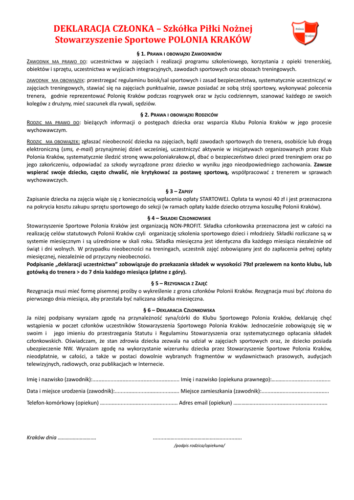 !! DEKLARACJA CZŁONKA – Szkółka !!! Piłki Nożnej Stowarzyszenie Sportowe POLONIA KRAKÓW ! ! ! § 1. PRAWA I OBOWIĄZKI ZAWODNIKÓW ZAWODNIK MA PRAWO DO: uczestnictwa w zajęciach i realizacji programu szkoleniowego, korzystania z opieki trenerskiej, obiektów i sprzętu, uczestnictwa w wyjściach integracyjnych, zawodach sportowych oraz obozach treningowych. ! ZAWODNIK MA OBOWIĄZEK: przestrzegać regulaminu boisk/sal sportowych i zasad bezpieczeństwa, systematycznie uczestniczyć w zajęciach treningowych, stawiać się na zajęciach punktualnie, zawsze posiadać ze sobą strój sportowy, wykonywać polecenia trenera, godnie reprezentować Polonię Kraków podczas rozgrywek oraz w życiu codziennym, szanować każdego ze swoich kolegów z drużyny, mieć szacunek dla rywali, sędziów. ! RODZIC MA PRAWO wychowawczym. ! DO: § 2. PRAWA I OBOWIĄZKI RODZICÓW bieżących informacji o postępach dziecka oraz wsparcia Klubu Polonia Kraków w jego procesie RODZIC MA OBOWIĄZEK: zgłaszać nieobecność dziecka na zajęciach, bądź zawodach sportowych do trenera, osobiście lub drogą elektroniczną (sms, e-‐mail) przynajmniej dzień wcześniej, uczestniczyć aktywnie w inicjatywach organizowanych przez Klub Polonia Kraków, systematycznie śledzić stronę www.poloniakrakow.pl, dbać o bezpieczeństwo dzieci przed treningiem oraz po jego zakończeniu, odpowiadać za szkody wyrządzone przez dziecko w wyniku jego nieodpowiedniego zachowania. Zawsze wspierać swoje dziecko, często chwalić, nie krytykować za postawę sportową, współpracować z trenerem w sprawach wychowawczych. ! § 3 – ZAPISY Zapisanie dziecka na zajęcia wiąże się z koniecznością wpłacenia opłaty STARTOWEJ. Opłata ta wynosi 40 zł i jest przeznaczona na pokrycia kosztu zakupu sprzętu sportowego do sekcji (w ramach opłaty każde dziecko otrzyma koszulkę Polonii Kraków). ! § 4 – SKŁADKI CZŁONKOWSKIE Stowarzyszenie Sportowe Polonia Kraków jest organizacją NON-‐PROFIT. Składka członkowska przeznaczona jest w całości na realizację celów statutowych Polonii Kraków czyli organizację szkolenia sportowego dzieci i młodzieży. Składki rozliczane są w systemie miesięcznym i są uśrednione w skali roku. Składka miesięczna jest identyczna dla każdego miesiąca niezależnie od świąt i dni wolnych. W przypadku nieobecności na treningach, uczestnik zajęć zobowiązany jest do zapłacenia pełnej opłaty miesięcznej, niezależnie od przyczyny nieobecności. Podpisanie „deklaracji uczestnictwa” zobowiązuje do przekazania składek w wysokości 79zł przelewem na konto klubu, lub gotówką do trenera > do 7 dnia każdego miesiąca (płatne z góry). ! § 5 – REZYGNACJA Z ZAJĘĆ Rezygnacja musi mieć formę pisemnej prośby o wykreślenie z grona członków Polonii Kraków. Rezygnacja musi być złożona do pierwszego dnia miesiąca, aby przestała być naliczana składka miesięczna. ! § 6 – DEKLARACJA CZŁONKOWSKA Ja niżej podpisany wyrażam zgodę na przynależność syna/córki do Klubu Sportowego Polonia Kraków, deklaruję chęć wstąpienia w poczet członków uczestników Stowarzyszenia Sportowego Polonia Kraków. Jednocześnie zobowiązuję się w swoim i jego imieniu do przestrzegania Statutu i Regulaminu Stowarzyszenia oraz systematycznego opłacania składek członkowskich. Oświadczam, że stan zdrowia dziecka zezwala na udział w zajęciach sportowych oraz, że dziecko posiada ubezpieczenie NW. Wyrażam zgodę na wykorzystanie wizerunku dziecka przez Stowarzyszenie Sportowe Polonia Kraków, nieodpłatnie, w całości, a także w postaci dowolnie wybranych fragmentów w wydawnictwach prasowych, audycjach telewizyjnych, radiowych, oraz publikacjach w Internecie. ! Imię i nazwisko (zawodnik):.......................................................... Imię i nazwisko (opiekuna prawnego):………............................... Data i miejsce urodzenia (zawodnik):........................................... Miejsce zamieszkania (zawodnik):............................................. Telefon-‐komórkowy (opiekun) …................................................. Adres email (opiekun) ……………................................................. ! ! ! Kraków dnia …………………….… .........…….......………………….…............... /podpis rodzica/opiekuna/