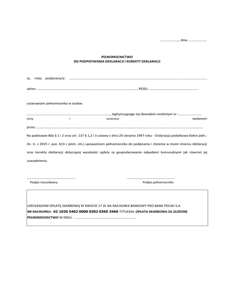...................., dnia .................... PEŁNOMOCNICTWO DO PODPISYWANIA DEKLARACJI I KOREKTY DEKLARACJI Ja, niżej podpisany/a: ……………………………………............................................................................................................ adres: ………………………………………...................................................................PESEL: ………………………………..….............. ustanawiam pełnomocnika w osobie: ……………………………………………………………………………………., legitymującego się dowodem osobistym nr ………………………. (imię i nazwisko) wydanym przez: …………………………..................................................................................................................................................... Na podstawie 80a § 1 i 2 oraz art. 137 § 1,2 i 3 ustawy z dnia 29 sierpnia 1997 roku - Ordynacja podatkowa (tekst jedn.: Dz. U. z 2015 r. poz. 613 z późn. zm.) upoważniam pełnomocnika do podpisania i złożenia w moim imieniu deklaracji oraz korekty deklaracji dotyczącej wysokości opłaty za gospodarowanie odpadami komunalnymi jak również jej uzasadnienia. ………………………………………………… …..…………………………………………… Podpis mocodawcy Podpis pełnomocnika UIŚCIŁEM/AM OPŁATĘ SKARBOWĄ W KWOCIE 17 ZŁ NA RACHUNEK BANKOWY PKO BANK POLSKI S.A. NR RACHUNKU: 62 1020 5402 0000 0302 0365 3466 TYTUŁEM: OPŁATA SKARBOWA ZA ZŁOŻONE PEŁNOMOCNICTWO W DNIU: …………………………………………………………….. JESTEM ZWOLNIONY/A Z OPŁATY SKARBOWEJ NA PODSTAWIE: ………..…………………………………………..……………… ….…………………………………………………………………………………… (NALEŻY PODAĆ PODSTAWĘ PRAWNĄ ZWOLNIENIA I/LUB W ZAŁĄCZENIU NALEŻY PRZEDSTAWIĆ DOKUMENTY ŚWIADCZĄCE O ZWOLNIENIU Z OPŁATY) Uwaga!! W przypadku pełnomocnictwa udzielanego osobie będącej małżonkiem, wstępnym (rodzice, dziadkowie, pradziadkowie), zstępnym (dzieci, wnuki, prawnuki) lub rodzeństwem mocodawcy, złożenie pełnomocnictwa dla tych osób nie podlega opłacie skarbowej, lecz należy poniżej podać rodzaj pokrewieństwa pełnomocnika: (np. matka, córka, babcia itp.) ……………………………………………………………………………………………………………………………………………………………... W załączeniu: - dowód wpłaty lub uwierzytelniona kopia dowodu zapłaty potwierdzający wniesienia opłaty, - dokumenty świadczące o zwolnieniu z opłaty skarbowej.