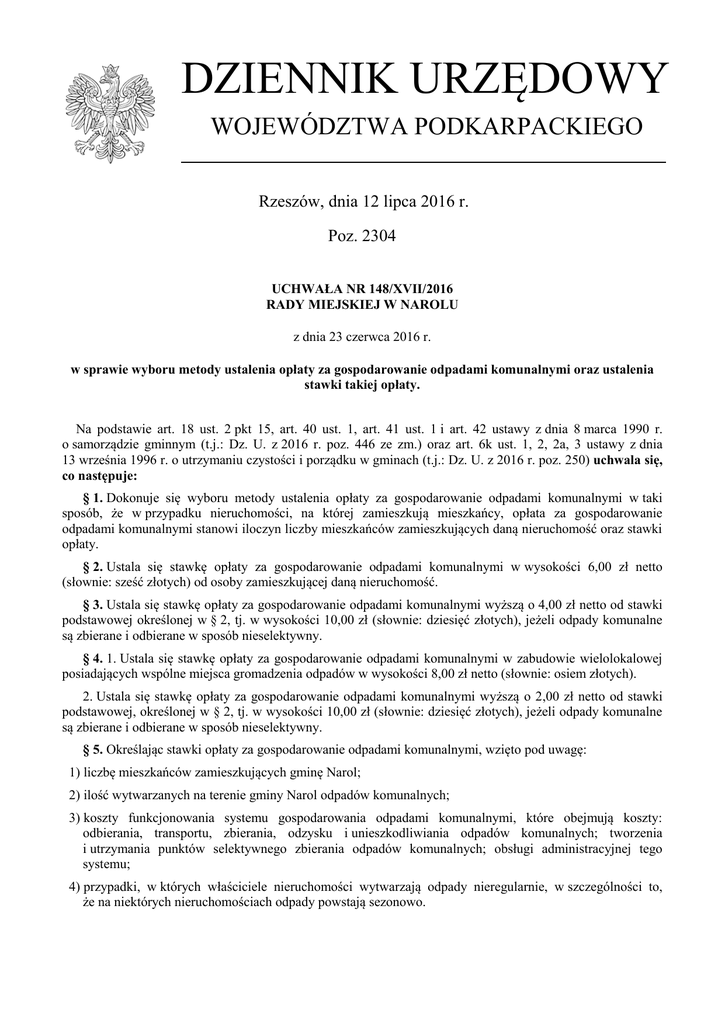 DZIENNIK URZĘDOWY WOJEWÓDZTWA PODKARPACKIEGO Rzeszów, dnia 12 lipca 2016 r. Poz. 2304 UCHWAŁA NR 148/XVII/2016 RADY MIEJSKIEJ W NAROLU z dnia 23 czerwca 2016 r. w sprawie wyboru metody ustalenia opłaty za gospodarowanie odpadami komunalnymi oraz ustalenia stawki takiej opłaty. Na podstawie art. 18 ust. 2 pkt 15, art. 40 ust. 1, art. 41 ust. 1 i art. 42 ustawy z dnia 8 marca 1990 r. o samorządzie gminnym (t.j.: Dz. U. z 2016 r. poz. 446 ze zm.) oraz art. 6k ust. 1, 2, 2a, 3 ustawy z dnia 13 września 1996 r. o utrzymaniu czystości i porządku w gminach (t.j.: Dz. U. z 2016 r. poz. 250) uchwala się, co następuje: § 1. Dokonuje się wyboru metody ustalenia opłaty za gospodarowanie odpadami komunalnymi w taki sposób, że w przypadku nieruchomości, na której zamieszkują mieszkańcy, opłata za gospodarowanie odpadami komunalnymi stanowi iloczyn liczby mieszkańców zamieszkujących daną nieruchomość oraz stawki opłaty. § 2. Ustala się stawkę opłaty za gospodarowanie odpadami komunalnymi w wysokości 6,00 zł netto (słownie: sześć złotych) od osoby zamieszkującej daną nieruchomość. § 3. Ustala się stawkę opłaty za gospodarowanie odpadami komunalnymi wyższą o 4,00 zł netto od stawki podstawowej określonej w § 2, tj. w wysokości 10,00 zł (słownie: dziesięć złotych), jeżeli odpady komunalne są zbierane i odbierane w sposób nieselektywny. § 4. 1. Ustala się stawkę opłaty za gospodarowanie odpadami komunalnymi w zabudowie wielolokalowej posiadających wspólne miejsca gromadzenia odpadów w wysokości 8,00 zł netto (słownie: osiem złotych). 2. Ustala się stawkę opłaty za gospodarowanie odpadami komunalnymi wyższą o 2,00 zł netto od stawki podstawowej, określonej w § 2, tj. w wysokości 10,00 zł (słownie: dziesięć złotych), jeżeli odpady komunalne są zbierane i odbierane w sposób nieselektywny. § 5. Określając stawki opłaty za gospodarowanie odpadami komunalnymi, wzięto pod uwagę: 1) liczbę mieszkańców zamieszkujących gminę Narol; 2) ilość wytwarzanych na terenie gminy Narol odpadów komunalnych; 3) koszty funkcjonowania systemu gospodarowania odpadami komunalnymi, które obejmują koszty: odbierania, transportu, zbierania, odzysku i unieszkodliwiania odpadów komunalnych; tworzenia i utrzymania punktów selektywnego zbierania odpadów komunalnych; obsługi administracyjnej tego systemu; 4) przypadki, w których właściciele nieruchomości wytwarzają odpady nieregularnie, w szczególności to, że na niektórych nieruchomościach odpady powstają sezonowo. Dziennik Urzędowy Województwa Podkarpackiego –2– Poz. 2304 § 6. Wykonanie uchwały powierza się Burmistrzowi Miasta i Gminy Narol. § 7. Uchwała wchodzi w życie po upływie 14 dni od ogłoszenia w Dzienniku Urzędowym Województwa Podkarpackiego i ma zastosowanie od 1 sierpnia 2016 r. Przewodniczący Rady Miejskiej w Narolu Krzysztof Szawara