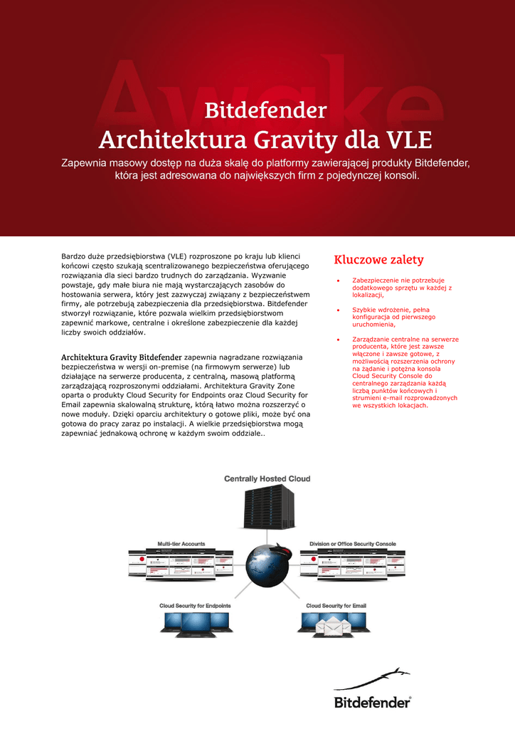 Bardzo duże przedsiębiorstwa (VLE) rozproszone po kraju lub klienci końcowi często szukają scentralizowanego bezpieczeństwa oferującego rozwiązania dla sieci bardzo trudnych do zarządzania. Wyzwanie powstaje, gdy małe biura nie mają wystarczających zasobów do hostowania serwera, który jest zazwyczaj związany z bezpieczeństwem firmy, ale potrzebują zabezpieczenia dla przedsiębiorstwa. Bitdefender stworzył rozwiązanie, które pozwala wielkim przedsiębiorstwom zapewnić markowe, centralne i określone zabezpieczenie dla każdej liczby swoich oddziałów. zapewnia nagradzane rozwiązania bezpieczeństwa w wersji on-premise (na firmowym serwerze) lub działające na serwerze producenta, z centralną, masową platformą zarządzającą rozproszonymi oddziałami. Architektura Gravity Zone oparta o produkty Cloud Security for Endpoints oraz Cloud Security for Email zapewnia skalowalną strukturę, którą łatwo można rozszerzyć o nowe moduły. Dzięki oparciu architektury o gotowe pliki, może być ona gotowa do pracy zaraz po instalacji. A wielkie przedsiębiorstwa mogą zapewniać jednakową ochronę w każdym swoim oddziale.. Zabezpieczenie nie potrzebuje dodatkowego sprzętu w każdej z lokalizacji, Szybkie wdrożenie, pełna konfiguracja od pierwszego uruchomienia, Zarządzanie centralne na serwerze producenta, które jest zawsze włączone i zawsze gotowe, z możliwością rozszerzenia ochrony na żądanie i potężna konsola Cloud Security Console do centralnego zarządzania każdą liczbą punktów końcowych i strumieni e-mail rozprowadzonych we wszystkich lokacjach. Bezpieczeństwo numer 1 w testach Procesy skanowania Bitdefender wykorzystują szereg najnowszych technologii i technik ochrony systemu. Wszystkie rozwiązania Bitdefender zawierają technologię B-Have, będącą w trakcie postępowania patentowego, która analizuje zachowanie potencjalnie szkodliwych kodów w komputerze wirtualnym, eliminując fałszywe wyniki, co zwiększa szanse wykrycia nowych i nieznanych typów takich kodów. Architektura Gravity Zone pozwala na zarządzanie funkcjami oferowanych rozwiązań Bitdefender na dwa sposoby: w chmurze (na serwerze producenta) oraz on-premise (na serwerze w firmie). Unikalna struktura pozwala na dostosowanie ochrony do wymagań firmy – rozszerzenie ochrony na żądanie, zarządzanie ochroną w wielu oddziałach firmy, nie tylko na stacjach roboczych, ale również na serwerach. Architektura Gravity Zone zawiera ochronę Cloud Security for Endpoints , której konsola zarządzająca znajduje się na serwerze proucenta. Oba te rozwiązania są zarządzane poprzez konsolę w chmurze, dzięki czemu można nimi zarządzać z każdego miejsca. Security for Endpoints z konsolą na serwerze producenta to technologia biznesowa tej samej klasy, co rozwiązanie w wersji on-premise. Siłą tego rozwiązania jest dostępność, ponieważ konsola zarządzająca znajduje się na chronionych serwerach producenta – dostępna jest z każdej przeglądarki www. Prostota i elastyczność zapewnia wytrzymałe i nieinwazyjne rozwiązanie, które po cichu chroni serwery i systemy użytkowników końcowych. Cloud Security for Endpoints zapewnia taką samą ochronę jak rozwiązania biznesowe dla przedsiębiorstw w wersji On- premise dla stacji roboczych jak i serwerów. Nie wymaga przy tym opieki IT oraz dodatkowego oprogramowania, sprzętu czy wykwalifikowanego administratora. Bitdefender jest globalną firmą, która dostarcza technologię bezpieczeństwa w ponad 200 krajach poprzez sieć dystrybutorów i partnerów handlowych, która ciągle rośnie. Od 2001 roku, Bitdefender nieustannie produkuje wielokrotnie nagradzaną technologię zabezpieczeń dla przedsiębiorstw i konsumentów oraz jest jednym z czołowych dostawców zabezpieczeń w technologii wirtualizacji i przetwarzania w chmurze. Poprzez badania i rozwój oraz partnerstwo, Bitdefender stworzył najwyższe standardy doskonałości bezpieczeństwa zarówno jako najlepsza technologia jak strategiczne umowy z niektórymi z największych dostawców technologii wirtualizacji na świecie.