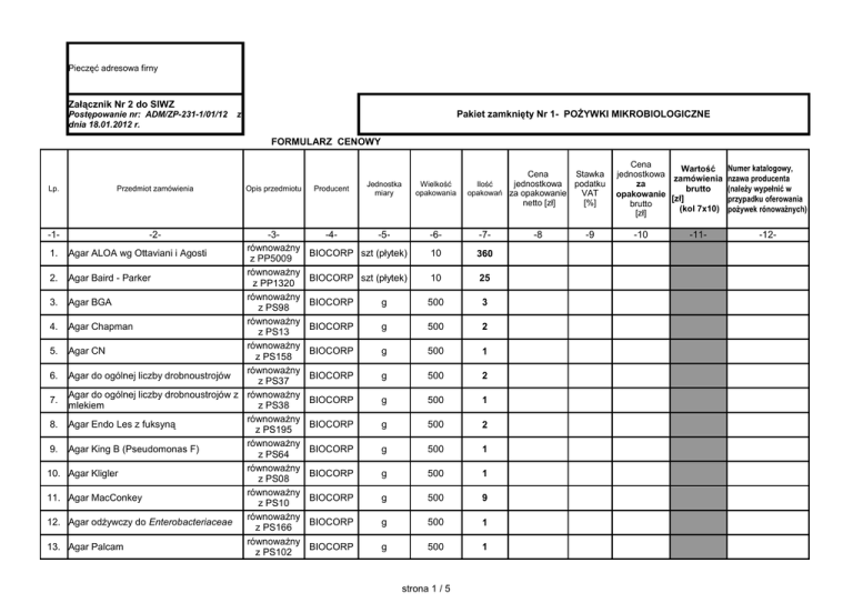 Pieczęć adresowa firny Załącznik Nr 2 do SIWZ Postępowanie nr: ADM/ZP-231-1/01/12 dnia 18.01.2012 r. Pakiet zamknięty Nr 1- POŻYWKI MIKROBIOLOGICZNE z FORMULARZ CENOWY Lp. Przedmiot zamówienia -1- -2- 1. 2. 3. 4. 5. 6. 7. 8. 9. 10. 11. 12. 13. Opis przedmiotu -3równoważny Agar ALOA wg Ottaviani i Agosti z PP5009 równoważny Agar Baird - Parker z PP1320 równoważny Agar BGA z PS98 równoważny Agar Chapman z PS13 równoważny Agar CN z PS158 równoważny Agar do ogólnej liczby drobnoustrojów z PS37 Agar do ogólnej liczby drobnoustrojów z równoważny mlekiem z PS38 równoważny Agar Endo Les z fuksyną z PS195 równoważny Agar King B (Pseudomonas F) z PS64 równoważny Agar Kligler z PS08 równoważny Agar MacConkey z PS10 równoważny Agar odżywczy do Enterobacteriaceae z PS166 równoważny Agar Palcam z PS102 Cena Stawka jednostkowa podatku Ilość opakowań za opakowanie VAT netto [zł] [%] Producent Jednostka miary Wielkość opakowania -4- -5- -6- -7- BIOCORP szt (płytek) 10 360 BIOCORP szt (płytek) 10 25 BIOCORP g 500 3 BIOCORP g 500 2 BIOCORP g 500 1 BIOCORP g 500 2 BIOCORP g 500 1 BIOCORP g 500 2 BIOCORP g 500 1 BIOCORP g 500 1 BIOCORP g 500 9 BIOCORP g 500 1 BIOCORP g 500 1 strona 1 / 5 -8 -9 Cena Wartość Numer katalogowy, jednostkowa zamówienia nzawa producenta za brutto (należy wypełnić w opakowanie [zł] przypadku oferowania brutto (kol 7x10) pożywek rónoważnych) [zł] -10 -11- -12- Cena Stawka jednostkowa podatku Ilość opakowań za opakowanie VAT netto [zł] [%] Lp. Przedmiot zamówienia Opis przedmiotu Producent Jednostka miary Wielkość opakowania -1- -2- -3równoważny z PS516 równoważny z PS170 równoważny z PS17 równoważny z PP0012 równoważny z PS01 równoważny z PS67 równoważny z PS135 równoważny z PS44 równoważny z PS22 równoważny z PS96 równoważny z PP1501 równoważny z PP1090 równoważny z PP0015 równoważny z PS106 równoważny z PS82 równoważny z PS73 równoważny z PS154 -4- -5- -6- -7- BIOCORP g 500 1 BIOCORP g 500 1 BIOCORP g 500 4 BIOCORP szt (płytek) 10 4 BIOCORP g 500 2 BIOCORP g 500 1 BIOCORP g 500 3 BIOCORP g 500 1 BIOCORP g 500 1 BIOCORP g 500 2 BIOCORP szt (płytek) 10 180 BIOCORP szt (płytek) 10 30 BIOCORP szt (płytek) 10 105 BIOCORP g 500 1 BIOCORP g 500 1 BIOCORP g 500 2 BIOCORP g 500 1 14. Agar półpłynny odżywczy 15. Agar Salmonella / Shigella SSDC 16. Agar Salmonella Shigella 17. Agar Schaedler z 5% krwią baranią 18. Agar siarczynowo-bizmutowy wg Wilson-Blaira 19. Agar Slanetz - Bartley 20. Agar TBX 21. Agar trójcukrowy z żelazem 22. Agar tryptozowo - sojowy 23. Agar TSC 24. Agar wg Mossela do izolacji B.cereus 25. Agar Yersina CIN 26. Agar z 5% krwią baranią 27. Agar z chloramfenikolem 28. Agar z ekstraktem drożdżowym 29. Agar z fioletem krystalicznym, czerwienią, solami żółci i glukozą 30. Agar z glukozą BCP strona 2 / 5 -8 -9 Cena Wartość Numer katalogowy, jednostkowa zamówienia nzawa producenta za brutto (należy wypełnić w opakowanie [zł] przypadku oferowania brutto (kol 7x10) pożywek rónoważnych) [zł] -10 -11- -12- Cena Stawka jednostkowa podatku Ilość opakowań za opakowanie VAT netto [zł] [%] Lp. Przedmiot zamówienia Opis przedmiotu Producent Jednostka miary Wielkość opakowania -1- -2- -3równoważny z PP1330 równoważny z PS211 równoważny z PS88 równoważny z PS214 równoważny z PS101 równoważny z PS169 równoważny z PS202 równoważny z PW3015 -4- -5- -6- -7- BIOCORP szt (płytek) 10 140 BIOCORP g 500 1 BIOCORP g 500 1 BIOCORP g 500 1 BIOCORP g 500 2 BIOCORP g 500 1 g 500 1 szt (probówki) 50 15 g 500 1 50x10ml 28 500 4 500 1 500 1 500 1 500 1 500 1 31. Agar z ksylozą i lizyną XLD 32. Agar wg Christensena z mocznikiem do badania aktywności ureazy 33. Agar z zółcią, eskuliną i azydkiem 34. Bulion z acetamidem 35. Bulion Fraser 36. Bulion ITC Bulion laurylotryptozowy z mannitolem i BIOCORP tryptofanem LST Bulion mózgowo - rdzeniowy (BHI) 38. BIOCORP probówki po 10ml Bulion Mueller-Kauffman z czterotionianem, nowobiocyną i zielenią równoważny 39. BIOCORP brylantową (MKTTn) (podłoże nie z PS540 wymagające suplementowania) 37. Bulion Mueller-Kauffman z czterotionianem, nowobiocyną i zielenią równoważny szt 40. BIOCORP brylantową (MKTTn) (podłoże gotowe w z PW6092 (probówki) probówkach) równoważny 41. Bulion seleninowo-fosforanowy BIOCORP g z PS68 równoważny 42. Bulion TSYEB BIOCORP g z PS209 Bulion z peptonem, sorbitolem i solami równoważny 43. BIOCORP g żółci (Bulion PSB) z PS63 Podłoże wg Christensena z cytrynianem równoważny 44. BIOCORP g sodowym z PS530 Pożywka płynna, zmodyfikowana wg równoważny 45. BIOCORP g Giolitti-Cantoni z PS148 równoważny 46. Pożywka laktozowo-żelatynowa BIOCORP g z PS112 strona 3 / 5 -8 -9 Cena Wartość Numer katalogowy, jednostkowa zamówienia nzawa producenta za brutto (należy wypełnić w opakowanie [zł] przypadku oferowania brutto (kol 7x10) pożywek rónoważnych) [zł] -10 -11- -12- Lp. Przedmiot zamówienia -1- -2Pożywka namnażająco-selektywna z 47. siarczanem laurylowym i peptonem tryptose 48. Pożywka RVS (probówki po 10ml) 49. Woda tryptonowa 50. Zbuforowana woda peptonowa 51. Ekstrakt wołowy 52. Pepton proteozowy 53. Pepton tryptozowy 54. Tryptone 55. Suplement 40% roztwór mocznika 56. Suplement cykloseryna Suplement do bulionu Frasera 57. (wydajność 1 fiolka suplementu na 500ml podłoża) Suplement do bulionu pół Frasera 58. (wydajność 1 fiolka suplementu na 500ml podłoża) 59. Suplement do podłoża ITC 60. Suplement do podłoża Palcam Płytki odciskowe z podłożem TSA i 61 dwoma neutralizatorami (lecytyna i tween) Cena Stawka jednostkowa podatku Ilość opakowań za opakowanie VAT netto [zł] [%] Opis przedmiotu Producent Jednostka miary Wielkość opakowania -3- -4- -5- -6- -7- g 500 1 BIOCORP szt (probówki) 50 28 BIOCORP g 500 1 BIOCORP g 500 13 BIOCORP g 500 1 BIOCORP g 500 1 BIOCORP g 500 1 BIOCORP g 500 1 BIOCORP ml 100 2 BIOCORP szt 1