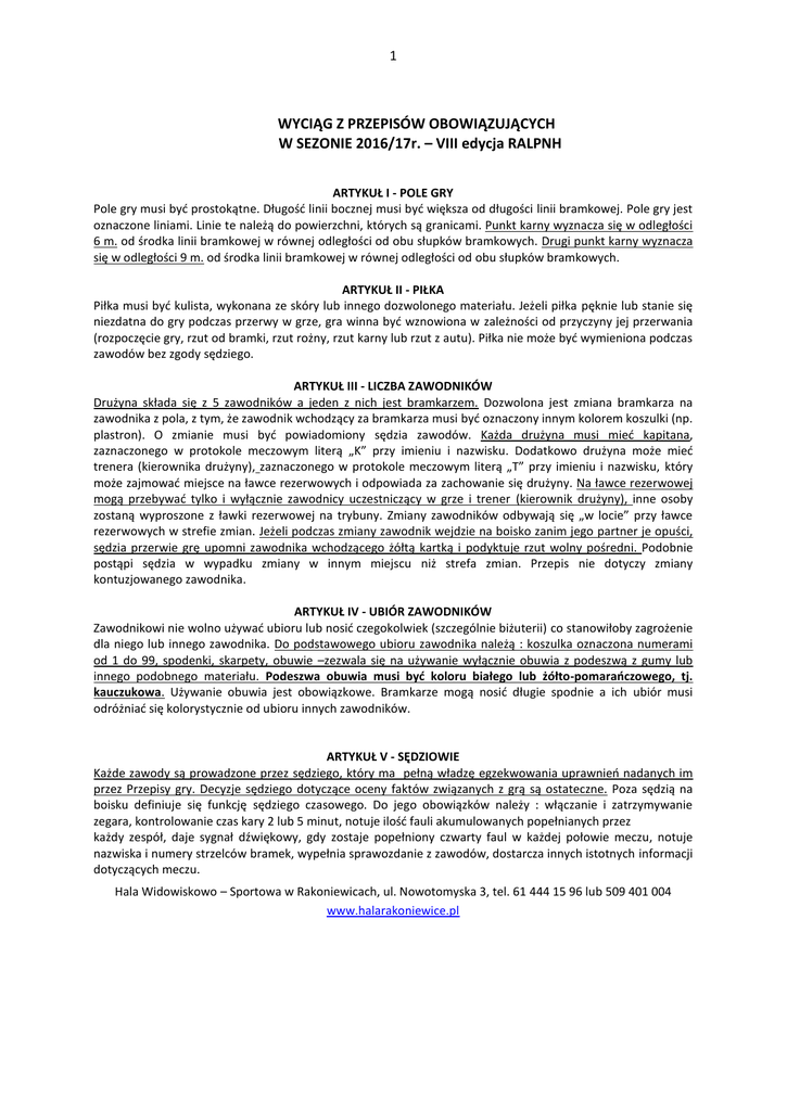 1 WYCIĄG Z PRZEPISÓW OBOWIĄZUJĄCYCH W SEZONIE 2016/17r. – VIII edycja RALPNH ARTYKUŁ I - POLE GRY Pole gry musi być prostokątne. Długość linii bocznej musi być większa od długości linii bramkowej. Pole gry jest oznaczone liniami. Linie te należą do powierzchni, których są granicami. Punkt karny wyznacza się w odległości 6 m. od środka linii bramkowej w równej odległości od obu słupków bramkowych. Drugi punkt karny wyznacza się w odległości 9 m. od środka linii bramkowej w równej odległości od obu słupków bramkowych. ARTYKUŁ II - PIŁKA Piłka musi być kulista, wykonana ze skóry lub innego dozwolonego materiału. Jeżeli piłka pęknie lub stanie się niezdatna do gry podczas przerwy w grze, gra winna być wznowiona w zależności od przyczyny jej przerwania (rozpoczęcie gry, rzut od bramki, rzut rożny, rzut karny lub rzut z autu). Piłka nie może być wymieniona podczas zawodów bez zgody sędziego. ARTYKUŁ III - LICZBA ZAWODNIKÓW Drużyna składa się z 5 zawodników a jeden z nich jest bramkarzem. Dozwolona jest zmiana bramkarza na zawodnika z pola, z tym, że zawodnik wchodzący za bramkarza musi być oznaczony innym kolorem koszulki (np. plastron). O zmianie musi być powiadomiony sędzia zawodów. Każda drużyna musi mieć kapitana, zaznaczonego w protokole meczowym literą „K” przy imieniu i nazwisku. Dodatkowo drużyna może mieć trenera (kierownika drużyny), zaznaczonego w protokole meczowym literą „T” przy imieniu i nazwisku, który może zajmować miejsce na ławce rezerwowych i odpowiada za zachowanie się drużyny. Na ławce rezerwowej mogą przebywać tylko i wyłącznie zawodnicy uczestniczący w grze i trener (kierownik drużyny), inne osoby zostaną wyproszone z ławki rezerwowej na trybuny. Zmiany zawodników odbywają się „w locie” przy ławce rezerwowych w strefie zmian. Jeżeli podczas zmiany zawodnik wejdzie na boisko zanim jego partner je opuści, sędzia przerwie grę upomni zawodnika wchodzącego żółtą kartką i podyktuje rzut wolny pośredni. Podobnie postąpi sędzia w wypadku zmiany w innym miejscu niż strefa zmian. Przepis nie dotyczy zmiany kontuzjowanego zawodnika. ARTYKUŁ IV - UBIÓR ZAWODNIKÓW Zawodnikowi nie wolno używać ubioru lub nosić czegokolwiek (szczególnie biżuterii) co stanowiłoby zagrożenie dla niego lub innego zawodnika. Do podstawowego ubioru zawodnika należą : koszulka oznaczona numerami od 1 do 99, spodenki, skarpety, obuwie –zezwala się na używanie wyłącznie obuwia z podeszwą z gumy lub innego podobnego materiału. Podeszwa obuwia musi być koloru białego lub żółto-pomarańczowego, tj. kauczukowa. Używanie obuwia jest obowiązkowe. Bramkarze mogą nosić długie spodnie a ich ubiór musi odróżniać się kolorystycznie od ubioru innych zawodników. ARTYKUŁ V - SĘDZIOWIE Każde zawody są prowadzone przez sędziego, który ma pełną władzę egzekwowania uprawnień nadanych im przez Przepisy gry. Decyzje sędziego dotyczące oceny faktów związanych z grą są ostateczne. Poza sędzią na boisku definiuje się funkcję sędziego czasowego. Do jego obowiązków należy : włączanie i zatrzymywanie zegara, kontrolowanie czas kary 2 lub 5 minut, notuje ilość fauli akumulowanych popełnianych przez każdy zespół, daje sygnał dźwiękowy, gdy zostaje popełniony czwarty faul w każdej połowie meczu, notuje nazwiska i numery strzelców bramek, wypełnia sprawozdanie z zawodów, dostarcza innych istotnych informacji dotyczących meczu. Hala Widowiskowo – Sportowa w Rakoniewicach, ul. Nowotomyska 3, tel. 61 444 15 96 lub 509 401 004 www.halarakoniewice.pl 2 ARTYKUŁ VI - CZAS TRWANIA GRY Czas gry wynosi 2 x 15 min. Czas gry upływa w momencie rozpoczęcia sygnału na zakończenie czasu gry. Przerwa pomiędzy I i II połową nie może być dłuższa niż 1 min. Decyzję o zatrzymaniu czasu w trakcie gry podejmuje sędzia, sygnalizując ten fakt sędziemu czasowemu. Czas trwania każdej połowy winien być przedłużony, aby umożliwić wykonanie ewentualnego rzutu karnego. O zatrzymaniu czasu na wykonanie rzutu karnego decyduje sędzia główny. ARTYKUŁ VII - ROZPOCZĘCIE GRY Przed rozpoczęciem gry sędzia przeprowadza losowanie stron. Drużyna wygrywająca losowanie wybiera, na którą bramkę atakuje podczas pierwszej połowy meczu. Drużyna wygrywająca losowanie rozpoczyna drugą połowę meczu. Wszyscy zawodnicy znajdują się na własnej połowie boiska. Zawodnicy drużyny przeciwnej znajdują się w odległości minimum 3 metrów od piłki, aż do chwili gdy ta znajdzie się w grze. Piłka leży nieruchomo na punkcie środkowym pola gry. Piłka jest w grze, gdy zostanie kopnięta i porusza się do przodu. Wykonawca nie może jej zagrać zanim nie zostanie dotknięta przez innego zawodnika. ARTYKUŁ VIII - PIŁKA W GRZE I POZA GRĄ Piłka jest w grze, gdy znajduje się w obrębie boiska a sędzia nie przerwie gry. Przy wyrzucie od bramki, rzucie wolnym z pola karnego, wykonywanym przez drużynę, do której to pole „należy” – piłka jest w grze po przekroczeniu linii pola karnego. Piłka, która uderzy w przeszkodę nad polem gry zostanie wznowiona rzutem z atu w miejscu gdzie uderzyła w przeszkodę ARTYKUŁ IX - JAK ZDOBYWA SIĘ BRAMKĘ Bramka jest zdobyta jeżeli piłka całym obwodem przekroczy linię bramkową. Bramkarz nie może zdobyć bramki rzutem ręką. Bramki nie można zdobyć bezpośrednio z rzutu autowego. Jeżeli piłka znajdzie się w bramce po zagraniu ręką zawodnika drużyny broniącej – sędzia bramkę uzna, a zawodnika ukarze żółtą kartką. Bramka samobójcza zostanie zaliczona zawodnikowi drużyny atakującej, który był ostatnio przy piłce lub najbliżej piłki. ARTYKUŁ X - GRA NIEDOZWOLONA I NIESPORTOWE ZACHOWANIE Drużyna zostanie ukarana rzutem wolnym bezpośrednim, jeżeli jeden z jej zawodników popełnił następujące przewinienie : - kopnie lub próbuje kopnąć przeciwnika, - podstawi nogę 