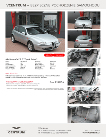 Alfa Romeo 147 2.0 T.Spark SalonPL Marka: Model: Rok Produkcji: Pojemność silnika : Kolor Nadwozia: Skrzynia biegów: Alfa Romeo 147 2004 1970 cm3 Srebrny Manual Przebieg : Moc silnika : Kolor Wnętrza: Rodzaj nadwozia: Ilość drzwi: Rodzaj paliwa: 47000 km 150 KM Czarny Hatchback 2/3 Benzyna OPIS POJAZDU: Data pierwszej rejestracji: 28.02.2005 Dokument sprzedaży: Faktura VAT-Marża Rok produkcji: 2004 Przebieg: 47000There are no features available FINANSOWANIE I UBEZPIECZENIA: Cena: 9 900 PLN Przykładowa rata miesięczna, wpłata 20%, okres leasingu/kredytu 48 miesięcy, 10% wykupu. Rata leasingu jest wartością netto bez vat. Niniejsza treść nie stanowi oferty w rozumieniu przepisów Kodeksu Cywilnego oraz opisu towaru ani zapewnienia w rozumieniu art. 4 Ustawy z dnia 27 lipca 2002r o szczególnych warunkach sprzedaży konsumenckiej. Powered by TCPDF (www.tcpdf.org)