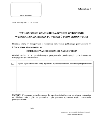 Załącznik nr 6 Pieczęć Wykonawcy Znak sprawy: ZP-TLiA/1/2014 WYKAZ CZĘŚCI ZAMÓWIENIA, KTÓREJ WYKONANIE WYKONAWCA ZAMIERZA POWIERZYĆ PODWYKONAWCOM Składając ofertę w postępowaniu o udzielenie zamówienia publicznego prowadzonym w trybie przetarg nieograniczony na: KOMPLEKSOWĄ MODERNIZACJĘ NAGŁOŚNIENIA Oświadczam(y), iż w przedmiotowym postępowaniu powierzę(my) podwykonawcom następujące części zamówienia : L.p. Wykaz części zamówienia, której wykonanie wykonawca zamierza powierzyć podwykonawcom UWAGA! Wykonawca jest zobowiązany do wypełnienia i dołączenia niniejszego załącznika do składanej oferty tylko w przypadku , gdy powierzy wykonanie części zamówienia podwykonawcom. dnia podpis osoby uprawnionej do składania oświadczeń woli w imieniu Wykonawcy