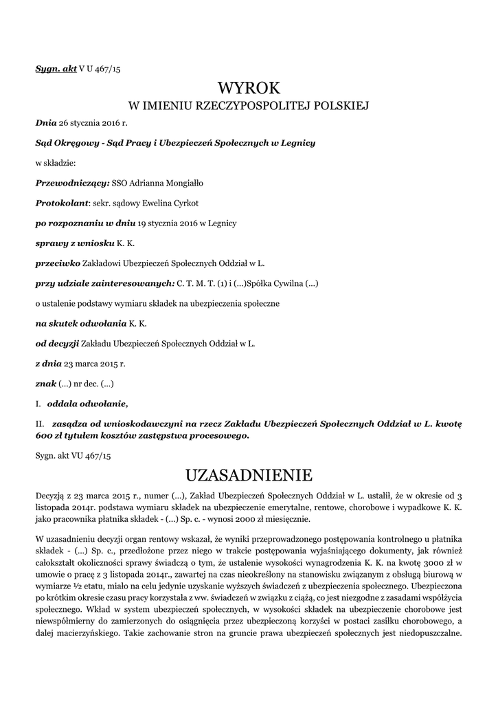 Sygn. akt V U 467/15 WYROK W IMIENIU RZECZYPOSPOLITEJ POLSKIEJ Dnia 26 stycznia 2016 r. Sąd Okręgowy - Sąd Pracy i Ubezpieczeń Społecznych w Legnicy w składzie: Przewodniczący: SSO Adrianna Mongiałło Protokolant: sekr. sądowy Ewelina Cyrkot po rozpoznaniu w dniu 19 stycznia 2016 w Legnicy sprawy z wniosku K. K. przeciwko Zakładowi Ubezpieczeń Społecznych Oddział w L. przy udziale zainteresowanych: C. T. M. T. (1) i (...)Spółka Cywilna (...) o ustalenie podstawy wymiaru składek na ubezpieczenia społeczne na skutek odwołania K. K. od decyzji Zakładu Ubezpieczeń Społecznych Oddział w L. z dnia 23 marca 2015 r. znak (...) nr dec. (...) I. oddala odwołanie, II. zasądza od wnioskodawczyni na rzecz Zakładu Ubezpieczeń Społecznych Oddział w L. kwotę 600 zł tytułem kosztów zastępstwa procesowego. Sygn. akt VU 467/15 UZASADNIENIE Decyzją z 23 marca 2015 r., numer (...), Zakład Ubezpieczeń Społecznych Oddział w L. ustalił, że w okresie od 3 listopada 2014r. podstawa wymiaru składek na ubezpieczenie emerytalne, rentowe, chorobowe i wypadkowe K. K. jako pracownika płatnika składek - (...) Sp. c. - wynosi 2000 zł miesięcznie. W uzasadnieniu decyzji organ rentowy wskazał, że wyniki przeprowadzonego postępowania kontrolnego u płatnika składek - (...) Sp. c., przedłożone przez niego w trakcie postępowania wyjaśniającego dokumenty, jak również całokształt okoliczności sprawy świadczą o tym, że ustalenie wysokości wynagrodzenia K. K. na kwotę 3000 zł w umowie o pracę z 3 listopada 2014r., zawartej na czas nieokreślony na stanowisku związanym z obsługą biurową w wymiarze ½ etatu, miało na celu jedynie uzyskanie wyższych świadczeń z ubezpieczenia społecznego. Ubezpieczona po krótkim okresie czasu pracy korzystała z ww. świadczeń w związku z ciążą, co jest niezgodne z zasadami współżycia społecznego. Wkład w system ubezpieczeń społecznych, w wysokości składek na ubezpieczenie chorobowe jest niewspółmierny do zamierzonych do osiągnięcia przez ubezpieczoną korzyści w postaci zasiłku chorobowego, a dalej macierzyńskiego. Takie zachowanie stron na gruncie prawa ubezpieczeń społecznych jest niedopuszczalne. Ponadto organ rentowy podniósł, że wynagrodzenie ustalone przez pracodawcę było nieadekwatne do zakresu faktycznie wykonywanych czynności przez wnioskodawczynię oraz do jej kwalifikacji zawodowych, a nadto było rażąco wyższe od wynagrodzenia księgowej, na której spoczywało znacznie więcej obowiązków i wykonywała je na pełen etat za wynagrodzeniem 4000 zł brutto. Wobec tego organ uznał za słuszne ustalenie podstawy wymiaru składek wnioskodawczyni na poziomie połowy wynagrodzenia księgowej, stosunkowo do ½ etatu. Odwołanie od decyzji złożyła wnioskodawczyni K. K., domagając się jej zmiany i ustalenia podstawy wymiaru składek w wysokości otrzymywanego wynagrodzenia. Zarzuciła, że wynagrodzenie za pracę na poziomie 3000 zł miesięcznie nie jest w jej przypadku wygórowane, czy ustalone bez poszanowania zasad współżycia społecznego, zważywszy na realia miejscowego rynku pracy i obiektywną wysokość średniego wynagrodzenia za pracę. Przeciwnie - zdaniem wnioskodawczyni - wysokość taka odpowiada postulatom odnośnie wysokości wynagrodzenia godziwego, jakie wynikają z treści art. 13 k.p. w zw. z art. 78 k.p. Odnosząc się w tym kontekście do wynagrodzeń innych pracowników płatnika, w tym księgowej, podniosła, że są one zaniżone, a nadto sam stan jej ciąży i związane z tym korzystanie z zasiłków chorobowego i macierzyńskiego nie powinien prowadzić do zaniżenia podstawy składek na jej ubezpieczenia, bez poszanowania autonomii woli stron przy określaniu wynagrodzenia w umowie o pracę. W odpowiedzi na odwołanie Zakład Ubezpieczeń Społecznych wniósł o jego oddalenie oraz podtrzymał argumentację przedstawioną w zaskarżonej decyzji. Sąd ustalił następujący stan faktyczny: Płatnik składek - (...) Sp. c. z siedzibą w T. zajmuje się działalnością rolniczą na obszarze około 800 hektarów. Dodatkowym źródłem przychodów spółki jest dzierżawa gruntów pod farmę wiatrową. Wspólnikami spółki cywilnej jest rodzeństwo – M., C. i R. T.. Osobiście wykonują oni obowiązki związane z prowadzeniem gospodarstwa, w tym planowaniem zasiewów i prac polowych, bezpośrednimi kontaktami z kontrahentami. Spółka zatrudnia od 8 do 10 pracowników na stanowiskach robotniczych – traktorzystów i mechaników. Ich wynagrodzenie kształtowane jest w oparciu o stawki godzinowe w granicach 15-19 zł za godzinę. Spółka zatrudnia również kierowcę-zaopatrzeniowca – M. T. (2) – za wynagrodzeniem minimalnym. Do 3 listopada 2014 r. sprawy z zakresu kadrowości, księgowości, BHP, obsługi sekretariatu były wykonywane przez jednego pracownika – Z. G., za stałym wynagrodzeniem miesięcznym 4000 zł brutto. Z. G. posiada wykształcenie ekonomiczne i doświadczenie zawodowe na zajmowanym stanowisku od 1975 r., gdy rozpoczęła pracę księgowej w (...) w T., a od 1995 r. jest zatrudniona na stałe u płatnika, który przejął gospodarstwo rolne. Kondycja finansowa płatnika jest bardzo dobra. Każdy ze wspólników osiąga dochód w wysokości ok. 20.000 zł netto miesięcznie, w tym 15.000 zł z tytułu czynszu dzierżawnego pól pod farmę wiatrową. Oprócz tego po rozliczeniu roku wspólnicy dokonują podziału zysku za dany rok. Z uwagi na znaczny zakres obowiązków księgowej oraz jej planów przejścia w najbliższych latach na emeryturę, zasugerowała ona wspólnikom spółki cywilnej, by zatrudnić osobę, która wdrażałaby się do pracy na jej stanowisku i z czasem przejęła jej obowiązki. Ponieważ założeniem płatnika było utrzymanie rodzinnego charakteru firmy, zatrudnienie w zakresie pomocy biurowej zaproponowano córce jednego ze wspólników – M. T. (1), a bratanicy pozostałych dwóch wspólników - K. K