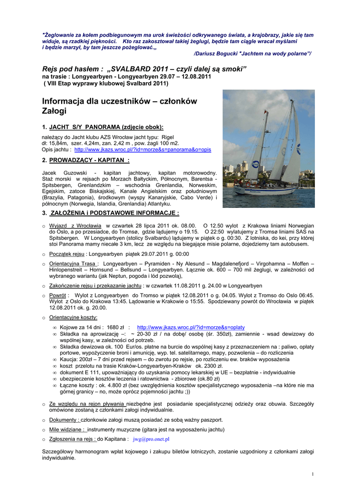 "Żeglowanie za kołem podbiegunowym ma urok świeżości odkrywanego świata, a krajobrazy, jakie się tam widuje, są rzadkiej piękności. Kto raz zakosztował takiej żeglugi, będzie tam ciągle wracał myślami i będzie marzył, by tam jeszcze pożeglować.„ /Dariusz Bogucki "Jachtem na wody polarne”/ Rejs pod hasłem : „SVALBARD 2011 – czyli dalej są smoki” na trasie : Longyearbyen - Longyearbyen 29.07 – 12.08.2011 ( VIII Etap wyprawy klubowej Svalbard 2011) Informacja dla uczestników – członków Załogi 1. JACHT S/Y PANORAMA (zdjęcie obok): należący do Jacht klubu AZS Wrocław jacht typu: Rigel dł: 15,84m, szer. 4,24m, zan. 2,42 m , pow. żagli 100 m2. Opis jachtu : http://www.jkazs.wroc.pl/?id=morze&s=panorama&o=opis 2. PROWADZĄCY - KAPITAN : Jacek Guzowski - kapitan jachtowy, kapitan motorowodny. Staż morski w rejsach po Morzach Bałtyckim, Północnym, Barentsa Spitsbergen, Grenlandzkim – wschodnia Grenlandia, Norweskim, Egejskim, zatoce Biskajskiej, Kanale Angielskim oraz południowym (Brazylia, Patagonia), środkowym (wyspy Kanaryjskie, Cabo Verde) i północnym (Norwegia, Islandia, Grenlandia) Atlantyku. 3. ZAŁOŻENIA i PODSTAWOWE INFORMACJE : o Wyjazd z Wrocławia w czwartek 28 lipca 2011 ok. 08.00. O 12.50 wylot z Krakowa liniami Norwegian do Oslo, a po przesiadce, do Tromsø, gdzie lądujemy o 19.15. O 22:50 wylatujemy z Tromsø liniami SAS na Spitsbergen. W Longyearbyen (stolicy Svalbardu) lądujemy w piątek o g. 00:30. Z lotniska, do kei, przy której stoi Panorama mamy niecałe 3 km, lecz ze względu na biegające misie polarne, dojedziemy tam autobusem. o Początek rejsu : Longyearbyen piątek 29.07.2011 g. 00:00 o Orientacyjna Trasa : Longyearbyen – Pyramiden - Ny Alesund – Magdalenefjord – Virgohamna – Moffen – Hinlopenstreit – Hornsund – Bellsund – Longyearbyen. Łącznie ok. 600 – 700 mil żeglugi, w zależności od wybranego wariantu (jak Neptun, pogoda i lód pozwolą), o Zakończenie rejsu i przekazanie jachtu : w czwartek 11.08.2011 g. 24.00 w Longyearbyen o Powrót : Wylot z Longyearbyen do Tromso w piątek 12.08.2011 o g. 04.05. Wylot z Tromso do Oslo 06:45. Wylot z Oslo do Krakowa 13:45. Lądowanie w Krakowie o 15:55. Spodziewany powrót do Wrocławia w piątek 12.08.2011 ok. g. 20.00. o Orientacyjne koszty: • Kojowe za 14 dni : 1680 zł : http://www.jkazs.wroc.pl/?id=morze&s=oplaty • Składka na aprowizację –: ~ 20-30 zł / na dobę/ osobę (śr. 350zł), zamiennie - wsad dewizowy do wspólnej kasy, w zależności od potrzeb. • Składka dewizowa ok. 100 Eur/os. płatne na burcie do wspólnej kasy z przeznaczeniem na : paliwo, opłaty portowe, wypożyczenie broni i amunicję, wyp. tel. satelitarnego, mapy, pozwolenia – do rozliczenia • Kaucja: 200zł – 7 dni przed rejsem – do zwrotu po rejsie, po rozliczeniu ew. braków wyposażenia • koszt przelotu na trasie Kraków-Longyearbyen-Kraków ok. 2300 zł. • dokument E 111, upoważniający do uzyskania pomocy lekarskiej w UE – bezpłatnie - indywidualnie • ubezpieczenie kosztów leczenia i ratownictwa - zbiorowe (ok.80 zł) • Łączne koszty : ok. 4.800 zł (bez uwzględnienia kosztów specjalistycznego wyposażenia –na które nie ma górnej granicy – no, może oprócz pojemności jachtu ;)) o Ze względu na rejon pływania niezbędne jest posiadanie specjalistycznej odzieży oraz obuwia. Szczegóły omówione zostaną z członkami załogi indywidualnie. o Dokumenty : członkowie załogi muszą posiadać ze sobą ważny paszport. o Mile widziane : instrumenty muzyczne (gitara jest na wyposażeniu jachtu) o Zgłoszenia na rejs : do Kapitana : [email protected] Szczegółowy harmonogram wpłat kojowego i zakupu biletów lotniczych, zostanie uzgodniony z członkami załogi indywidualnie. 1 Do obowiązków Uczestników należy czynny udział w wyznaczanych przez Kapitana jachtu czynnościach związanych z prowadzeniem jachtu, takich jak: wachty, przygotowywanie posiłków, utrzymanie porządku. Po zakończeniu rejsu Kapitan wystawi Członkowi Załogi, na życzenie, Opinię, wraz z Wyciągiem z Dziennika Jachtowego, które stanowić będą dokument potwierdzający odbycie stażu. 4. Rejs : Po zaokrętowaniu, zasztauowaniu zakupów, tankowaniu wody i paliwa oraz przejrzeniu jachtu robimy wspólny spacer po Longyearbyen, połączony z wizytą u Sysselmanna – Gubernatora Svalbardu, gdzie odbierzemy pozwolenie na lądowanie i eksplorację parku narodowego. Zaopatrzymy się też w broń i amunicję. Następnego dnia, wczesnym rankiem (ranek jest pojęciem umownym ponieważ jest dzień polarny), wyruszymy w drogę. Trasa będzie zależeć od warunków lodowych a jej orientacyjny przebieg ilustruje zdjęcie poniżej. 5. Informacja – zarys tego co prawdopodobnie uda się zobaczyć na trasie rejsu : Gdy dawni kartografowie docierali na kraj świata pisali na skraju mapy : „dalej są smoki”. Podczas tego rejsu dotrzemy na kraj świata – na skraj pola lodowego biegnącego aż do bieguna północnego, odległego o ok. 550 mil. Popłyniemy na północ tak daleko, jak tylko pozwoli nam lód. Wielu podróżników pragnących zdobyć biegun północny, jak choćby Edward Parry, czy Fridtjof Nansen, dotarło mniej więcej w te okolice i zawróciło… Archipelag Svalbard (norw. zimne wybrzeże), leży w połowie drogi między norweskim Tromsø a biegunem północnym, rozciągając się od wyspy Kvitøya na skraju wschodnim po Prins Karl Foreland na zachodnim oraz od wyspy Rosøya na skraju północnym do wyspy Sorkappoya na południowym. Svalbard na mocy traktatu spitsbergeńskiego z 1920r oddany został w administrację norweską. Spitsbergen (norw. Ostre Góry), jest częścią - największą i jedyną zamieszkałą przez ludzi wyspą archipelagu Svalbard. Odkryty został oficjalnie w 1596r przez holenderską ekspedycję pod kierunkiem Willema Barentsa. Spitsbergen zamieszkuje ok. 3000 osób - przeważnie Norwegów i Rosjan. Powierzchnia wysp ma