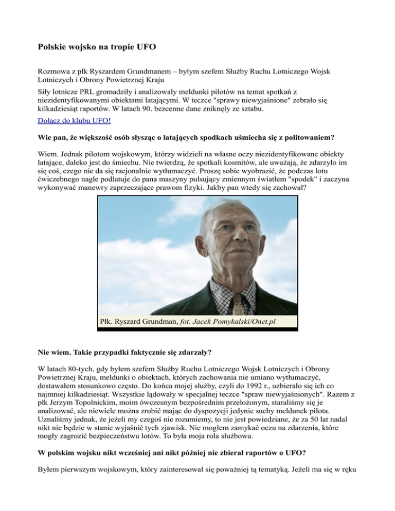 Polskie wojsko na tropie UFO Rozmowa z płk Ryszardem Grundmanem – byłym szefem Służby Ruchu Lotniczego Wojsk Lotniczych i Obrony Powietrznej Kraju Siły lotnicze PRL gromadziły i analizowały meldunki pilotów na temat spotkań z niezidentyfikowanymi obiektami latającymi. W teczce "sprawy niewyjaśnione" zebrało się kilkadziesiąt raportów. W latach 90. bezcenne dane zniknęły ze sztabu. Dołącz do klubu UFO! Wie pan, że większość osób słysząc o latających spodkach uśmiecha się z politowaniem? Wiem. Jednak pilotom wojskowym, którzy widzieli na własne oczy niezidentyfikowane obiekty latające, daleko jest do śmiechu. Nie twierdzą, że spotkali kosmitów, ale uważają, że zdarzyło im się coś, czego nie da się racjonalnie wytłumaczyć. Proszę sobie wyobrazić, że podczas lotu ćwiczebnego nagle podlatuje do pana maszyny pulsujący zmiennym światłem "spodek" i zaczyna wykonywać manewry zaprzeczające prawom fizyki. Jakby pan wtedy się zachował? Płk. Ryszard Grundman, fot. Jacek Pomykalski/Onet.pl Nie wiem. Takie przypadki faktycznie się zdarzały? W latach 80-tych, gdy byłem szefem Służby Ruchu Lotniczego Wojsk Lotniczych i Obrony Powietrznej Kraju, meldunki o obiektach, których zachowania nie umiano wytłumaczyć, dostawałem stosunkowo często. Do końca mojej służby, czyli do 1992 r., uzbierało się ich co najmniej kilkadziesiąt. Wszystkie lądowały w specjalnej teczce "spraw niewyjaśnionych". Razem z płk Jerzym Topolnickim, moim ówczesnym bezpośrednim przełożonym, staraliśmy się je analizować, ale niewiele można zrobić mając do dyspozycji jedynie suchy meldunek pilota. Uznaliśmy jednak, że jeżeli my czegoś nie rozumiemy, to nie jest powiedziane, że za 50 lat nadal nikt nie będzie w stanie wyjaśnić tych zjawisk. Nie mogłem zamykać oczu na zdarzenia, które mogły zagrozić bezpieczeństwu lotów. To była moja rola służbowa. W polskim wojsku nikt wcześniej ani nikt później nie zbierał raportów o UFO? Byłem pierwszym wojskowym, który zainteresował się poważniej tą tematyką. Jeżeli ma się w ręku meldunek doświadczonego pilota wojskowego, oficera, którego trudno podejrzewać o brak kompetencji w ocenie zjawisk atmosferycznych i wyglądu ziemskich pojazdów latających, to nie należy wyrzucać go do kosza. Wojskowe instrukcje nie obejmowały oczywiście UFO, bo wprowadzenie takiego terminu do oficjalnego dokumentu byłoby równoznaczne z tym, że istnienie obiektów latających pochodzenia pozaziemskiego jest uznane nie tylko przez Wojsko Polskie, ale też przez siły zbrojne całego Układu Warszawskiego. Przepisy instrukcji wojskowych były bowiem znormalizowane w całym Układzie. Nikt nie zabraniał jednak gromadzenia danych na temat dziwnych zjawisk przestrzeni powietrznej. Robiłem to i miałem nadzieję, że moja praca będzie kontynuowana. A była kontynuowana? Niestety nie. Nikt w polskim wojsku nie zajmuje się dziś niezidentyfikowanymi obiektami latającymi. Ufolodzy czasami mówią, że nasza armia ukrywa informacje o UFO. Nie ukrywa, bo ich nie ma. Po moim odejściu ze sztabu zaprzestano systematycznego zbierania raportów na ten temat. Szkoda. Armie państw zachodnich badają niezwykłe zjawiska, robią to także Rosjanie. A co stało się z zebranymi przez pana raportami? Po moim odejściu ze sztabu teczka z meldunkami zniknęła. Zniknęła? Zniknęła. Nie ma jej. A co się z nią stało? Nie wiem. Może ktoś zabrał sobie meldunki na pamiątkę. Nie potraktowano tej sprawy poważnie. Żałuję, bo gdyby nadal zbierano tego typu sygnały, to mielibyśmy do dyspozycji dane obejmujące okres ponad 20 lat. Można by się pokusić o ich analizę i próbować wyłapać prawidłowości dotyczące pojawiania się i zachowania niezidentyfikowanych obiektów latających. A tak, skoro nie ma materiału, to nie ma czego analizować. Kiedy po raz pierwszy dostał pan meldunek o spotkaniu samolotu wojskowego z niezidentyfikowanym obiektem latającym? Nie pamiętam dokładnej daty, ale najwięcej sygnałów dotyczyło wydarzeń z 11 grudnia 1982 r. W nocy stacje radiolokacyjne w różnych częściach Polski zaczęły meldować o wykryciu poruszających się z ogromną prędkością obiektów. W sumie nad naszym terytorium zaobserwowano ich aż 16. Samoloty myśliwskie dostały rozkaz startu i zestrzelenia przeciwnika, ale żadnej z maszyn nie udało się zlokalizować celów. Dziwne obiekty pojawiły się wtedy także nad NRD, Czechosłowacją i wschodnią częścią ZSRR. Obawiano się nawet, że rozpoczął się atak NATO. W tym przypadku nie mamy do czynienia z obserwacją jednego pilota, tylko zdarzeniem, które uruchomiło całą machinę wojskową i zaangażowało setki osób. Wszyscy nie mogli ulec złudzeniu. A tym bardziej złudzeniu nie mógł ulec radar. Stacje radiolokacyjne często wykrywały tego typu obiekty? Nie. Najczęściej nie wykrywały niczego. Radary tylko kilka razy dały pełny obraz sytuacji. Dysponuję relacją z 1955 r. Podczas ćwiczeń Układu Warszawskiego stacja radiolokacyjna w rejonie Warszawy namierzyła dwa cele nad Zatoką Gdańską. Poruszały się z prędkością 2300 km/h na wysokości 20 tys. metrów. W tych czasach nie istniał żaden samolot o takich osiągach. Co jeszcze dziwniejsze, w pewnym momencie oba obiekty zrobiły zwrot o 90 stopni. Dosłownie w miejscu, bez żadnego promienia skrętu. Takiego manewru na tak dużej prędkości nie da się wykonać. Nie są w stanie zrobić tego nawet współczesne, najnowocześniejsze samoloty. A co dopiero 50 lat temu. I co się stało z tymi obiektami? Poleciały na Litwę, potem przemieściły się w okolice Lwowa i wtedy zniknęły z ekranów stacji. Wtedy nikt nie wysłał myśliwców w celu podjęcia próby przechwycenia obiektu. Ale np. jesienią 1983 r. obiekt w kształcie "cygara" był ścigany najpierw przez dwa śmigłowce, a potem przez myśliwiec Su-20. Co wtedy się stało? W jednostce w Łęczycy