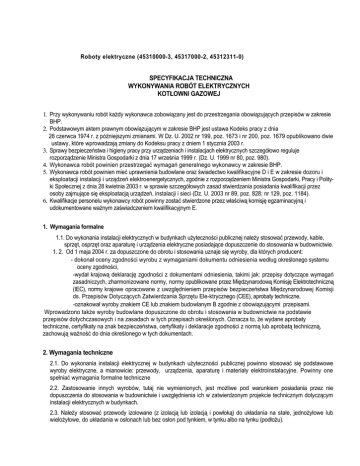 Roboty elektryczne (45310000-3, 45317000-2, 45312311-0) SPECYFIKACJA TECHNICZNA WYKONYWANIA ROBÓT ELEKTRYCZNYCH KOTŁOWNI GAZOWEJ 1. Przy wykonywaniu robót każdy wykonawca zobowiązany jest do przestrzegania obowiązujących przepisów w zakresie BHP. 2. Podstawowym aktem prawnym obowiązującym w zakresie BHP jest ustawa Kodeks pracy z dnia 26 czerwca 1974 r. z późniejszymi zmianami. W Dz. U. 2002 nr 199, poz. 1673 i nr 200, poz. 1679 opublikowano dwie ustawy, które wprowadzają zmiany do Kodeksu pracy z dniem 1 stycznia 2003 r. 3. Sprawy bezpieczeństwa i higieny pracy przy urządzeniach i instalacjach elektrycznych szczegółowo reguluje rozporządzenie Ministra Gospodarki z dnia 17 września 1999 r. (Dz. U. 1999 nr 80, poz. 980). 4. Wykonawca robót powinien przestrzegać wymagań generalnego wykonawcy w zakresie BHP. 5. Wykonawca robót powinien mieć uprawnienia budowlane oraz świadectwo kwalifikacyjne D i E w zakresie dozoru i eksploatacji instalacji i urządzeń elektroenergetycznych, zgodnie z rozporządzeniem Ministra Gospodarki, Pracy i Polityki Społecznej z dnia 28 kwietnia 2003 r. w sprawie szczegółowych zasad stwierdzania posiadania kwalifikacji przez osoby zajmujące się eksploatacją urządzeń, instalacji i sieci (Dz. U. 2003 nr 89, poz. 828; nr 129, poz. 1184). 6. Kwalifikacje personelu wykonawcy robót powinny zostać stwierdzone przez właściwą komisję egzaminacyjną i udokumentowane ważnym zaświadczeniem kwalifikacyjnym E. 1. Wymagania formalne 1.1. Do wykonania instalacji elektrycznych w budynkach użyteczności publicznej należy stosować przewody, kable, sprzęt, osprzęt oraz aparaturę i urządzenia elektryczne posiadające dopuszczenie do stosowania w budownictwie. 1. 2. Od 1 maja 2004 r. za dopuszczone do obrotu i stosowania uznaje się wyroby, dla których producent: - dokonał oceny zgodności wyrobu z wymaganiami dokumentu odniesienia według określonego systemu oceny zgodności, -wydał krajową deklarację zgodności z dokumentami odniesienia, takimi jak: przepisy dotyczące wymagań zasadniczych, zharmonizowane normy, normy opublikowane przez Międzynarodową Komisję Elektrotechniczną (IEC), normy krajowe opracowane z uwzględnieniem przepisów bezpieczeństwa Międzynarodowej Komisji ds. Przepisów Dotyczących Zatwierdzania Sprzętu Ele-ktrycznego (CEE), aprobaty techniczne, -oznakował wyroby znakiem CE lub znakiem budowlanym B zgodnie z obowiązującymi przepisami. Wprowadzono także wyroby budowlane dopuszczone do obrotu i stosowania w budownictwie na podstawie przepisów dotychczasowych i na zasadach w tych przepisach określonych. Oznacza to, że wydane aprobaty techniczne, certyfikaty na znak bezpieczeństwa, certyfikaty i deklaracje zgodności z normą lub aprobatą techniczną, zachowują ważność do dnia określonego w tych dokumentach. 2. Wymagania techniczne 2.1. Do wykonania instalacji elektrycznej w budynkach użyteczności publicznej powinno stosować się podstawowe wyroby elektryczne, a mianowicie: przewody, urządzenia, aparaturę i materiały elektroinstalacyjne. Powinny one spełniać wymagania formalne techniczne 2.2. Zastosowanie innych wyrobów, tutaj nie wymienionych, jest możliwe pod warunkiem posiadania przez nie dopuszczenia do stosowania w budownictwie i uwzględnienia ich w zatwierdzonym projekcie technicznym dotyczącym instalacji elektrycznych w budynkach. 2.3. Należy stosować przewody izolowane (z izolacją lub izolacją i powłoką) do układania na stałe, jednożyłowe lub wielożyłowe, do układania w osłonach lub bez osłon pod tynkiem, w tynku albo na tynku (podłożu). 3. Układanie przewodów i rozprowadzenie instalacji w budynku 3.1. Rury instalacyjne – do przepustów w ścianach stosować rury RVS średnicy 26; 3. 2. Konstrukcje wsporcze - do układania przewodów stosować korytka siatkowe mocowane do ścian i stropów. 3.3. Osprzęt instalacyjny (wyłączniki instalacyjne, gniazda wtykowe) – stosować osprzęt natynkowy szczelny. Wszystkie gniazda wtykowe 230V z zestykiem ochronnym. 3.4. Przewody – WLZ od szafki przyłącza do tablicy rozdzielczej wykonać przewodem kabelkowym typu YDYżo 5x10 z żyłą ochronną ułożonym w listwie instalacyjnej PCV. - Obwody siłowe wykonać przewodem typu YDYżo 5x2,5 układanym w korytkach siatkowych. - Obwody gniazd wtykowych wykonać przewodem typu YDYp 3x2,5 układanym w listwie instalacyjnej PCV. - Obwody oświetlenia wykonać przewodem YDYp 3x1,5 układanym w listwach instalacyjnych PCV. - Oznaczenia przewodów -przewody ochronne, ochronno-neutralne, uziemienia ochronnego, ochronno- funkcjonalnego i połączeń wyrównawczych powinny być oznaczone dwubarwnie, kolorem zielono-żółtym, przy zachowaniu następujących postanowień: - barwa zielono-żółta może służyć tylko do oznaczenia i identyfikacji przewodów mających udział w ochronie przeciwporażeniowej, - zaleca się, aby oznaczenie stosować na całej długości przewodu; dopuszcza się stosowanie oznaczeń nie na całej długości, ale powinny one znajdować się we wszystkich dostępnych i widocznych miejscach, - przewód ochronno-neutralny powinien być oznaczony barwą zielono-żółtą, a na końcach jasnoniebieską; dopuszcza się, aby przewód ten oznaczano barwą jasnoniebieską, a na końcach zielono-żółtą. Oznaczenia przewodów i zacisków urządzeń powinny być takie, jak podano w tablicy. 5. Oznaczenia przewodów i zacisków urządzeń Przeznaczenie Faza 1 Faza2 Faza 3 Neutralny Ochronny Oznaczenie zacisku urządzenia przewodu (żyły) Przewody prądu przemiennego: L1 L2 L3 N PE U V W N Z 3.4. Oprawy oświetleniowe - oświetlenie wykonać oprawami świetlówkowymi szczelnymi mocowanymi na stropie. 3.5. Tablica Rozdzielcza Tablicę rozdzielczą dla poszczególnych obwodów wykonać w obudowie szczelnej o IP min 40 Do zabezpieczeń poszczególnych obwodów stosować aparaty modułowe typu S-300 Na zasilaniu całość tablice zabezpieczyć wyłącznikiem 