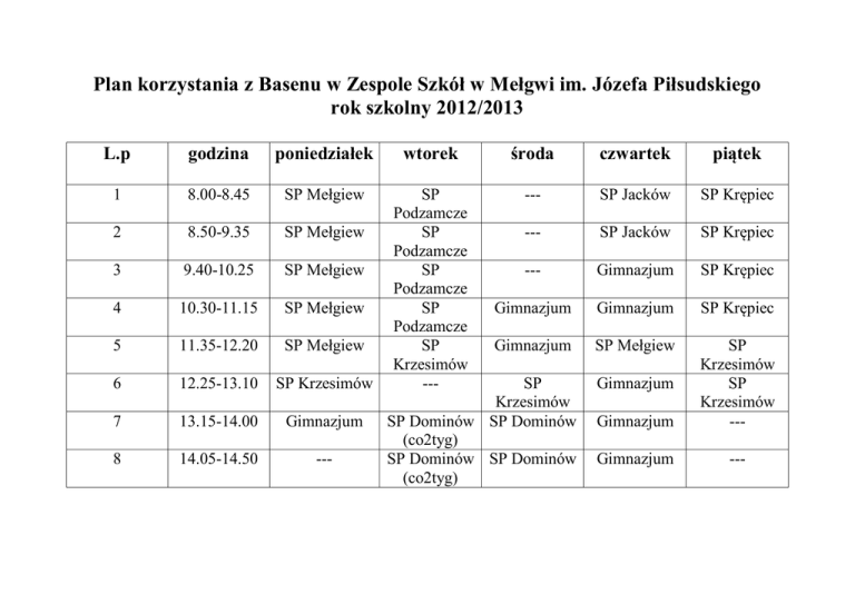 Plan korzystania z Basenu w Zespole Szkół w Mełgwi im. Józefa Piłsudskiego rok szkolny 2012/2013 L.p godzina poniedziałek wtorek środa czwartek piątek 1 8.00-8.45 SP Mełgiew --- SP Jacków SP Krępiec 2 8.50-9.35 SP Mełgiew --- SP Jacków SP Krępiec 3 9.40-10.25 SP Mełgiew --- Gimnazjum SP Krępiec 4 10.30-11.15 SP Mełgiew Gimnazjum Gimnazjum SP Krępiec 5 11.35-12.20 SP Mełgiew Gimnazjum SP Mełgiew 6 12.25-13.10 SP Krzesimów SP Podzamcze SP Podzamcze SP Podzamcze SP Podzamcze SP Krzesimów --- 7 13.15-14.00 Gimnazjum Gimnazjum SP Krzesimów SP Krzesimów --- 8 14.05-14.50 --- Gimnazjum --- SP Krzesimów SP Dominów SP Dominów (co2tyg) SP Dominów SP Dominów (co2tyg) Gimnazjum