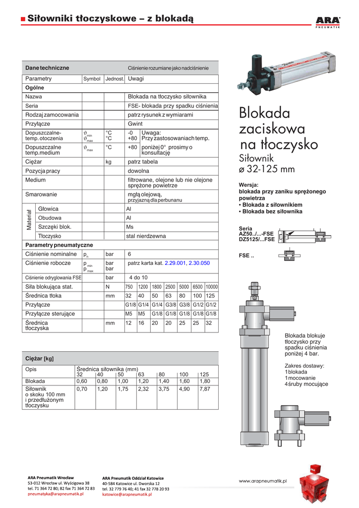 Siłowniki tłoczyskowe – z blokadą Dane techniczne CiÊnienie rozumiane jako nadciÊnienie Parametry Symbol Jednost. Uwagi Ogólne Nazwa Blokada na t∏oczysko si∏ownika Seria FSE- blokada przy spadku ciÊnienia Rodzaj zamocowania patrz rysunek z wymiarami Przy∏àcze Gwint Dopuszczalnetemp. otoczenia ϑmin ϑmax °C °C -0 Uwaga: +80 Przy zastosowaniach temp. Dopuszczalne temp.medium ϑmax °C +80 poni˝ej 0° prosimy o konsultacj´ kg patrz tabela Ci´˝ar Si∏ownik ø 32-125 mm Pozycja pracy dowolna Medium filtrowane, olejone lub nie olejone spr´˝one powietrze Smarowanie mg∏à olejowà, Materia∏ przyjaznà dla perbunanu G∏owica Al Obudowa Al Szcz´ki blok. Ms T∏oczysko stal nierdzewna Blokada zaciskowa na t∏oczysko Wersja: blokada przy zaniku spr´˝onego powietrza • Blokada z si∏ownikiem • Blokada bez si∏ownika Seria AZ50../...-FSE DZ5125/...FSE Parametry pneumatyczne CiÊnienie nominalne pn bar 6 CiÊnienie robocze p min p max bar bar patrz karta kat. 2.29.001, 2.30.050 CiÊnienie odryglowania FSE bar 4 do 10 Si∏a blokujàca stat. N 750 1200 1800 2500 5000 6500 10000 Ârednica t∏oka mm 32 40 FSE .. 50 63 80 100 125 Przy∏àcze G1/8 G1/4 G1/4 G3/8 G3/8 G1/2 G1/2 Przy∏àcze sterujàce M5 M5 G1/8 G1/8 G1/8 G1/8 G1/8 12 16 20 Ârednica t∏oczyska mm 20 25 25 32 Blokada blokuje t∏oczysko przy spadku ciÊnienia poni˝ej 4 bar. Ci´˝ar [kg] Opis Blokada Si∏ownik o skoku 100 mm i przed∏u˝onym t∏oczysku Ârednica si∏ownika (mm) 32 40 50 63 0,60 0,80 1,00 1,20 0,70 1,20 1,75 2,32 80 1,40 3,75 100 1,60 4,90 Zakres dostawy: 1blokada 1mocowanie 4Êruby mocujàce 125 1,80 7,87 Siłowniki tłoczyskowe – z blokadą Zasada dzia∏ania Uwaga! P Blokada t∏oczyska nast´puje za pomocà 2 szcz´k przy zaniku ciÊnienia. T∏ok (1) pod ciÊnieniem naciska na szcz´ki (3) i (4), Êciskajàc je ze sobà. T∏oczysko porusza si´. Je˝eli ciÊnienie w komorze (5) spadnie, spr´˝yna rozpiera szcz´ki 3 i 4, które na zasadzie klina podnoszà t∏ok 1 do góry i równoczeÊnie t∏oczysko jest blokowane. • Monta˝ blokady na t∏oczysku mo˝liwy jest tylko pod ciÊnienim lub po odblokowaniu za pomocà odpowiedniej Êruby. • T∏oczyska po zablokowaniu nie wolno skr´caç oraz nie mo˝e byç ono nara˝one na ekstremalne uderzenia. 5 1 2 3 4 Przyk∏ady sterowania si∏ownikiem z blokadà FSE-... Przyk∏ad 1: praca pozioma z zaworem 5/3- RFB Przyk∏ad 3: praca pozioma z 2 zaworami 3/2 Przyk∏ad 4: praca pionowa z zaworem 5/3 - RFE D1 D1 D1 D2 Ausfahren wysuw 2 Einfahren wsuw 2 2 2 1 3 1 3 1 3 Ausfahren Einfahren wysuw wsuw 4 2 14 12 wysuw 14 1 3 D2 D2 (1 Einfahren wsuw 4 2 12 2 51 3 1 3 (1 5 3 1 (1 zalecany zawór = empfohlener Rückschlagventileinbau zwrotny Przyk∏ad 1: praca pozioma z zaworem 5/3- RFE D1 Przyk∏ad 3: Zawór 5/3 z przyk∏. 1 i 2 zastàpiony jest tutaj 2 zaworami 3/2. Funkcja jest podobna. D1 D2 Ausfahren wysuw 2 2 wysuw Ausfahren 14 4 2 Przyk∏ad 5: praca pionowa z 2 zaworami 3/2 12 1 3 1 3 wsuw Einfahren ( D2 Einfahren wsuw 2 2 1 3 1 3 1 51 3 (1 zalecany zawór = empfohlener Rückschlagventileinbau zwrotny Przyk∏ad 1 i 2: Przy istniejàcym ciÊnieniu zasilania wy∏àcznik ciÊnieniowy jest zamkni´ty i zawór 3/2 daje sygna∏ spr´˝onego powietrza na blokad´ (blokada jest odryglowana i si∏ownik pracuje). Przy spadku ciÊnienia zasilania (wy∏. ciÊnieniowy prze∏àcza) zawór 3/2 odcina (odpowietrza) blokad´ i blokuje ona t∏oczysko. Zawór 5/3 (przyk∏. 1 i 2) napowietrza obydwie strony t∏oka i si∏ownik zatrzymuje si´ w zadanej pozycji. Jest to wystarczajàce tylko w si∏owniku z blokadà; bez FSE, z powodu ró˝nych powierzchni t∏oka po obu stronach, t∏oczysko b´dzie wysuwaç si´ dalej. Blokada zatrzymuje t∏oczysko w wymaganej pozycji. Zabudowa zaworów zwrotnych zwi´ksza pewnoÊç uk∏adu. Wp∏yw ró˝nicy powierzchni po obu stronach t∏oka, a tym samym brak stabilnoÊci uk∏adu, mo˝na skompensowaç dodatkowym reduktorem (przyk∏ad 3, 4, 5), który wyrówna si∏y nacisku na obie powierzchnie t∏oka. Przyk∏ad 4 i 5: Przyk∏ad sterowania podobny jak w poprzednich, jednak si∏ownik pracuje pionowo. (1 Uwaga: bez zaworu P/E: tylko przy zaniku ciÊnienia z zaworem P/E: przy zaniku ciÊnienia i zaniku napi´cia Siłowniki tłoczyskowe – z blokadą Wymiary - blokada zaciskowa typ FSE-... L8 L7 E SW1 G3 H2 øD3 L9 SL C A1 L10 F øT * øD1 øD1 G1 H1 øD4 øD2 L3 L1 L2 A2 G2 A4 A3 L5 A1 L6 B Wymiary monta˝owe si∏ownika ∏àcznie z zamocowaniem FSE-... L4 + Hub skok L11 + skok Hub Pozosta∏e wymiary dla si∏ownika i zamocowania patrz karta katalogowa-Nr. 2.29.001-1 do 6 oraz 2.30.050-1 do 6 Tabela wymiarów (mm) blokady zaciskowej FSE-... oraz wymiary monta˝owe ∏àcznie z si∏ownikiem Si∏. ø 32 40 50 63 80 100 125 A1 A2 A3 A4 B C øD1 øD2 øD3 øD4 E F G1 G2 G3 32,5 38 46,5 56,5 72 89 110 40 46 54 64 70 70 95 4,2 4,5 11,5 9,5 10 10 11 16 21 24 32 44 60 75 48 56 68 82 100 120 140 50 58 70 85 105 130 150 30 35 40 45 45 55 60 20 24 30 38 40 48 65 10 10 15 15 19 19 19 6,6 6,6 8,5 8,5 11 11 13 22,7 27,7 32,7 41 49,7 54,7 64,9 25 29 35 42,5 52,5 65 75 M6 M6 M8 M8 M10 M10 M12 M5 M5 M6 M8 M8 M8 M10 M5 M5 G1/8 G1/8 G1/8 G1/8 G1/8 Si∏. ø 32 40 50 63 80 100 125 H1 L11 SL SW1 øT 20 20 30 30 35 35 50 8 8 13 13 17 17 17 34 42 50 50 60 60 80 H2 L1 L2 L3 L4 L5 L6 L7 L8 L9 L10 + skok 96 102 127 151,5 181,5 207 227 4 4 4 4 4 4 4 8 10 15 15 16 16 25 28 33 39 50 58 58 70 12 12 16 16 17,5 20,5 25 152 170 188 214 238 253 312 +skok 48 55 70 81 91,5 94,5 120 58 65 82 93 110 115 152 34,5 38,5 51 55 63 67 83 13,5 16,5 19 26 28,5 27,5 37 20,5 22,5 29,5 29,5 35,5 38,5 45,5 8 10 12 16 16 16 20 180 203,6 231 257 292 307 367 Siłowniki tłoczyskowe – z blokadą Sposób zamawiania Wersja Symbol Si∏. -Ø Typ dwustronnego dzia∏ania, z magnesem, z obustronnym t∏umieniem Sposób zamawiania Nr kat. 32 AZ5032/....-FSE PA 58347-.... 40 AZ5040/....-FSE PA 59267-.... 50 AZ5050/....-FSE PA 60347-.... 63 AZ5063