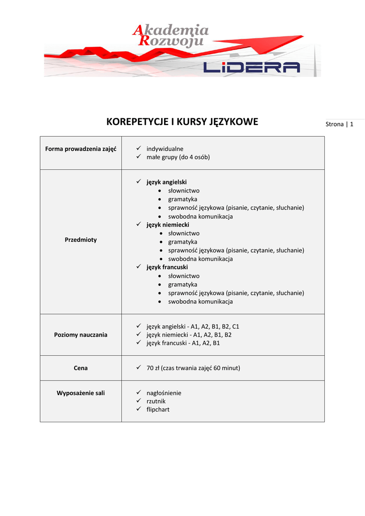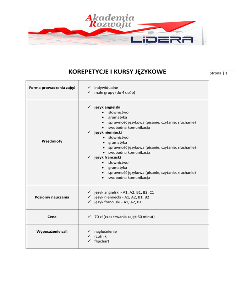 KOREPETYCJE I KURSY JĘZYKOWE Forma prowadzenia zajęć Przedmioty indywidualne małe grupy (do 4 osób) język angielski słownictwo gramatyka sprawność językowa (pisanie, czytanie, słuchanie) swobodna komunikacja język niemiecki słownictwo gramatyka sprawność językowa (pisanie, czytanie, słuchanie) swobodna komunikacja język francuski słownictwo gramatyka sprawność językowa (pisanie, czytanie, słuchanie) swobodna komunikacja Poziomy nauczania język angielski - A1, A2, B1, B2, C1 język niemiecki - A1, A2, B1, B2 język francuski - A1, A2, B1 Cena 70 zł (czas trwania zajęć 60 minut) Wyposażenie sali nagłośnienie rzutnik flipchart Strona | 1