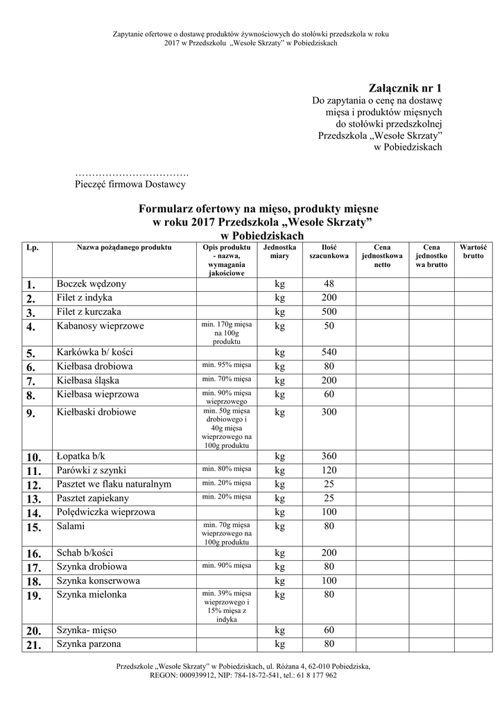 Zapytanie ofertowe o dostawę produktów żywnościowych do stołówki przedszkola w roku 2017 w Przedszkolu „Wesołe Skrzaty” w Pobiedziskach Załącznik nr 1 Do zapytania o cenę na dostawę mięsa i produktów mięsnych do stołówki przedszkolnej Przedszkola „Wesołe Skrzaty” w Pobiedziskach ……………………………. Pieczęć firmowa Dostawcy Formularz ofertowy na mięso, produkty mięsne w roku 2017 Przedszkola „Wesołe Skrzaty” w Pobiedziskach Lp. Nazwa pożądanego produktu 1. 2. 3. 4. Boczek wędzony Filet z indyka Filet z kurczaka Kabanosy wieprzowe 5. 6. 7. 8. Karkówka b/ kości Kiełbasa drobiowa Kiełbasa śląska Kiełbasa wieprzowa 9. Kiełbaski drobiowe 10. 11. 12. 13. 14. 15. Łopatka b/k Parówki z szynki Pasztet we flaku naturalnym Pasztet zapiekany Polędwiczka wieprzowa Salami 16. 17. 18. 19. Schab b/kości Szynka drobiowa Szynka konserwowa Szynka mielonka 20. 21. Szynka- mięso Szynka parzona Opis produktu - nazwa, wymagania jakościowe min. 170g mięsa na 100g produktu min. 95% mięsa min. 70% mięsa min. 90% mięsa wieprzowego min. 50g mięsa drobiowego i 40g mięsa wieprzowego na 100g produktu min. 80% mięsa min. 20% mięsa min. 20% mięsa min. 70g mięsa wieprzowego na 100g produktu min. 90% mięsa min. 39% mięsa wieprzowego i 15% mięsa z indyka Jednostka miary Ilość szacunkowa kg kg kg kg 48 200 500 50 kg kg kg kg 540 80 200 60 kg 300 kg kg kg kg kg kg 360 120 25 25 100 80 kg kg kg kg 200 80 100 80 kg kg 60 80 Cena jednostkowa netto Przedszkole „Wesołe Skrzaty” w Pobiedziskach, ul. Różana 4, 62-010 Pobiedziska, REGON: 000939912, NIP: 784-18-72-541, tel.: 61 8 177 962 Cena jednostko wa brutto Wartość brutto Zapytanie ofertowe o dostawę produktów żywnościowych do stołówki przedszkola w roku 2017 w Przedszkolu „Wesołe Skrzaty” w Pobiedziskach 22. 23. Szynka wiejska Szynka wieprzowa 24. 25. Udka z kurczaka Wątróbka min. 102g mięsa wieprzowego na 100g produktu kg kg 60 60 kg kg 120 100 SUMA BRUTTO: ……………….. dn…………………… …………………………………. Podpis (y) i pieczęć imienna osób uprawnionych do reprezentowania Wykonawcy w przypadku oferty wspólnej – podpis każdego z Wykonawców składających ofertę wspólną Przedszkole „Wesołe Skrzaty” w Pobiedziskach, ul. Różana 4, 62-010 Pobiedziska, REGON: 000939912, NIP: 784-18-72-541, tel.: 61 8 177 962