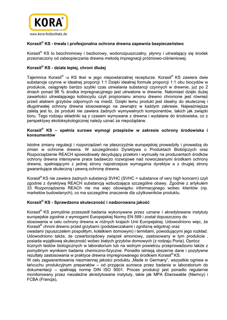 Korasit® KS - trwała i profesjonalna ochrona drewna zapewnia bezpieczeństwo Korasit® KS to bezchromowy i bezborowy, wodorozpuszczalny, płynny i utrwalający się środek przeznaczony od zabezpieczania drewna metodą impregnacji próżniowo-ciśnieniowej. Korasit® KS - działa lepiej, chroni dłużej Tajemnica Korasit® -u KS tkwi w jego niepowtarzalnej recepturze. Korasit® KS zawiera dwie substancje czynne w idealnej proporcji 1:1 Dzięki idealnej formule proporcji 1:1 obu biocydów w produkcie, osiągnięto bardzo szybki czas utrwalania substancji czynnych w drewnie, już po 2 dniach ponad 98 % środka impregnacyjnego jest utrwalone w drewnie. Natomiast dzięki dużej zawartości utrwalającego kobiocydu czyli propionianu amonu drewno chronione jest również przed atakiem grzybów odpornych na miedź. Dzięki temu produkt jest idealny do skutecznej i długotrwałej ochrony drewna stosowanego na zewnątrz w każdym zakresie. Najważniejsza zaletą jest to, że produkt nie zawiera żadnych wymywalnych komponentów, takich jak związki boru. Tego rodzaju składniki są z czasem wymywane z drewna i wydalane do środowiska, co z perspektywy ekotoksykologicznej należy uznać za niepożądane. Korasit® KS – spełnia surowe wymogi przepisów w zakresie ochrony środowiska i konsumentów Istotne zmiany regulacji i rozporządzeń na płaszczyźnie europejskiej prowadziły i prowadzą do zmian w ochronie drewna. W szczególności Dyrektywa o Produktach Biobójczych oraz Rozporządzenie REACH spowodowały decydujący przełom i wymusiły na producentach środków ochrony drewna intensywne prace badawczo rozwojowe nad nowoczesnymi środkami ochrony drewna, spełniającymi z jednej strony najostrzejsze wymagania dyrektyw a z drugiej strony gwarantujące skuteczną i pewną ochronę drewna. Korasit® KS nie zawiera żadnych substancji SVHC (SVHC = substance of very high koncern) czyli zgodnie z dyrektywą REACH substancją wzbudzająca szczególne obawy. Zgodnie z artykułem 33 Rozporządzenia REACh nie ma więc obowiązku informacyjnego wobec klientów (np. marketów budowlanych), co ma szczególne znaczenie dla użytkowników produktu. Korasit® KS - Sprawdzona skuteczność i nadzorowana jakość Korasit® KS pomyślnie przeszedł badania wykonywane przez uznane i akredytowane instytuty europejskie zgodnie z wymogami Europejskiej Normy EN 599 i został dopuszczony do stosowania w celu ochrony drewna w różnych krajach Unii Europejskiej. Udowodniono więc, że Korasit® chroni drewno przed grzybami (podstawczakami i zgnilizną wilgotną) oraz owadami (spuszczelem pospolitym, kołatkiem domowym) i termitami, powodującymi jego rozkład. Udowodniono także, że czwartorzędowy związek amoniowy, zastosowany w tym produkcie , posiada wyjątkową skuteczność wobec białych grzybów domowych (z rodzaju Poria). Oprócz licznych testów biologicznych w laboratorium lub na wolnym powietrzu przeprowadzono także z pomyślnym wynikiem badania chemiczno-fizyczne. Ponadto istnieją obszerne dane i pozytywne rezultaty zastosowania w praktyce drewna impregnowanego środkiem Korasit® KS. W celu zagwarantowania niezmiennej jakości produktu „Made in Germany”, wszystkie ogniwa w łańcuchu produkcyjnym preparatów – od przyjęcia surowca przez badania w laboratorium do dokumentacji – spełniają normę DIN ISO 9001. Proces produkcji jest ponadto regularnie monitorowany przez niezależne akredytowane instytuty, takie jak MPA Eberswalde (Niemcy) i FCBA (Francja),