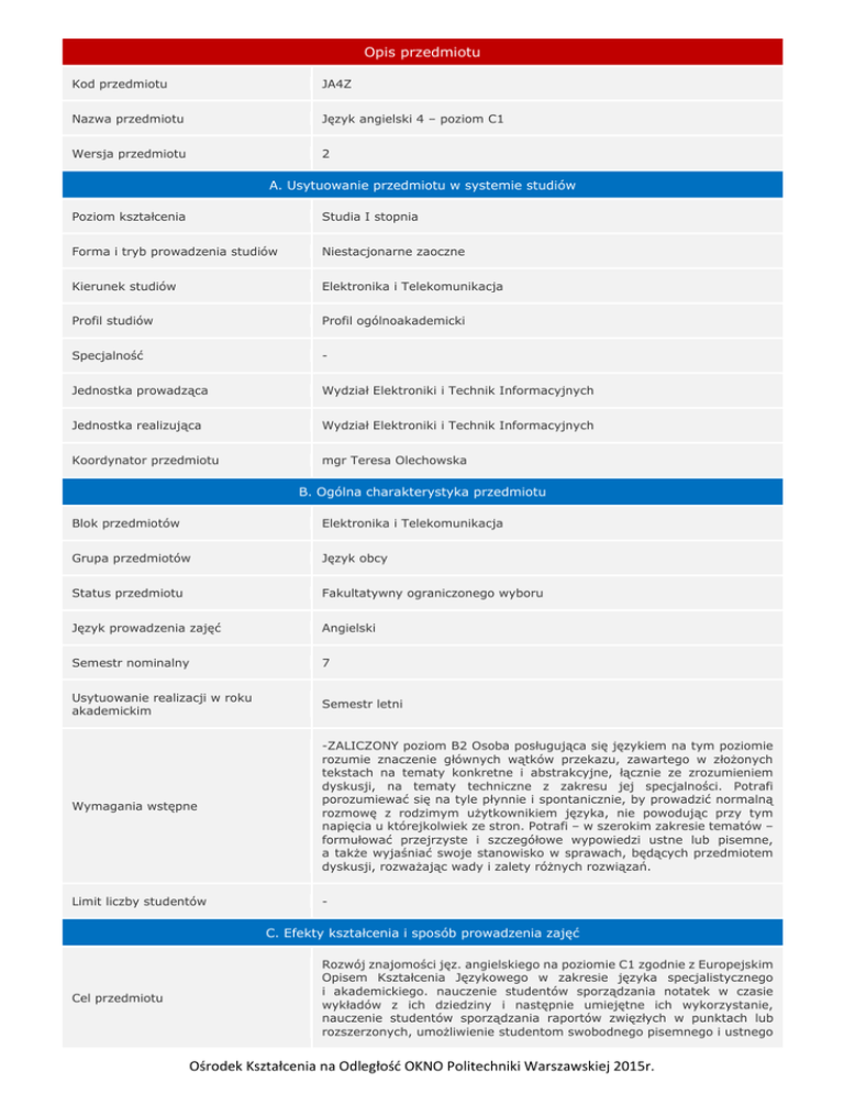 Opis przedmiotu Kod przedmiotu JA4Z Nazwa przedmiotu Język angielski 4 – poziom C1 Wersja przedmiotu 2 A. Usytuowanie przedmiotu w systemie studiów Poziom kształcenia Studia I stopnia Forma i tryb prowadzenia studiów Niestacjonarne zaoczne Kierunek studiów Elektronika i Telekomunikacja Profil studiów Profil ogólnoakademicki Specjalność - Jednostka prowadząca Wydział Elektroniki i Technik Informacyjnych Jednostka realizująca Wydział Elektroniki i Technik Informacyjnych Koordynator przedmiotu mgr Teresa Olechowska B. Ogólna charakterystyka przedmiotu Blok przedmiotów Elektronika i Telekomunikacja Grupa przedmiotów Język obcy Status przedmiotu Fakultatywny ograniczonego wyboru Język prowadzenia zajęć Angielski Semestr nominalny 7 Usytuowanie realizacji w roku akademickim Semestr letni Wymagania wstępne -ZALICZONY poziom B2 Osoba posługująca się językiem na tym poziomie rozumie znaczenie głównych wątków przekazu, zawartego w złożonych tekstach na tematy konkretne i abstrakcyjne, łącznie ze zrozumieniem dyskusji, na tematy techniczne z zakresu jej specjalności. Potrafi porozumiewać się na tyle płynnie i spontanicznie, by prowadzić normalną rozmowę z rodzimym użytkownikiem języka, nie powodując przy tym napięcia u którejkolwiek ze stron. Potrafi – w szerokim zakresie tematów – formułować przejrzyste i szczegółowe wypowiedzi ustne lub pisemne, a także wyjaśniać swoje stanowisko w sprawach, będących przedmiotem dyskusji, rozważając wady i zalety różnych rozwiązań. Limit liczby studentów - C. Efekty kształcenia i sposób prowadzenia zajęć Cel przedmiotu Rozwój znajomości jęz. angielskiego na poziomie C1 zgodnie z Europejskim Opisem Kształcenia Językowego w zakresie języka specjalistycznego i akademickiego. nauczenie studentów sporządzania notatek w czasie wykładów z ich dziedziny i następnie umiejętne ich wykorzystanie, nauczenie studentów sporządzania raportów zwięzłych w punktach lub rozszerzonych, umożliwienie studentom swobodnego pisemnego i ustnego Ośrodek Kształcenia na Odległość OKNO Politechniki Warszawskiej 2015r. porozumiewania się na tematy naukowe, nauczenie studentów czytania literatury fachowej (strony internetowe, artykuły prasowe, książki) w języku angielskim; przygotowanie studentów do uczestniczenia w wykładach, zajęciach i seminariach na uczelniach zagranicznych; nauczenie studentów krytycznego wypowiadania się na piśmie, nauczenie studentów wypełniania formularzy, nauczenie studentów pisania instrukcji, nauczenie studentów przygotowywania projektów w formie pisemnej zgłaszanych do grantów, nauczenie studentów pisania artykułów naukowych, w tym włączania do nich diagramów, tabel, odnośników, itp. Efekty kształcenia Patrz tabela 37. Wykład 0 Ćwiczenia 3 Laboratorium 0 Projekt 0 Formy zajęć i ich wymiar Treści kształcenia Tematy: Leksyka, struktury gramatyczne, oraz składnia z następujących dziedzin + ćwiczenie umiejętności posługiwania się nimi; rozwijanie umiejętności studiowania - szybkie czytanie ze zrozumieniem, samoocena, metody powtarzania materiału, zarządzanie czasem, radzenie sobie ze stresem; proces badawczy – biblioteka i Internet, seminaria i konferencje; granty – pisanie projektów, zgłaszanie projektu; praca – europejskie c.v., portfolio, formularze, etyka zawodowa; osobowość; udział w konkursach, itp. własność intelektualna – etyka, copyright, patenty; język zarządzania, marketingu, komunikacji, podejmowania decyzji i negocjacji, praca w zespole; matematyka – skomplikowane równania, terminologia, macierze, funkcje, teza i przeprowadzenie dowodu; informatyka – systemy operacyjne, diagramy, wykresy, schematy; instrukcja działania; zabezpieczanie danych, zjawisko hackerów; robienie notatek, pisanie raportów, opis procesu, opis doświadczenia; język mediów – umiejętność wyboru, radzenie sobie z nieznanym słownictwem, skróty; wyłapywanie najważniejszych informacji w czasie słuchania/oglądania; manipulacja; wyszukiwanie i zastosowanie informacji; słowotwórstwo; pisanie artykułów naukowych; parafrazowanie, pisanie streszczeń; tło kulturowe – wymiana naukowa, kontakty ze światem naukowym i akademickim z innych państw; różnice kulturowe; rejestry językowe; Metody oceny Kontakty raz na 3 tygodnie i sprawozdanie z zadanego materiału z prowadzącą przedmiot; rozmowy via SKYPE na zadany temat; zaliczenie tzw. PORTFOLIA z wszystkim zadaniami; zaliczenie egzaminu na poziomie C1 Academic w formie pisemnej na ogłoszonym wczesniej zjeździe. Metody sprawdzania efektów kształcenia Patrz tabela 37. Egzamin Tak Literatura Autorskie materiały prowadzącej przedmiot z ESP i EAP oraz jej autorski skrypt umieszczony i 132 / 200Program studiów - Elektronika i Telekomunikacja Katalog ECTS Politechniki Warszawskiej Opis przedmiotu dostępny na stronie OKNA; wybrane ćwiczenia z Oxford English for Information Technology, Eric H. Glendinning, John McEwan, OUP; materiały video z ESP i Eap z TEDx/YouTube z opracowanymi do nich zadaniami autorstwa prowadzącej przedmiot; autorskie strony internetowe; linki docelowe podawane razem z zadaniami w trakcie kursu. Witryna www przedmiotu https://red.okno.pw.edu.pl/witryna/home.php dostęp dla zalogowanych studentów D. Nakład pracy studenta Liczba punktów ECTS 4 Ośrodek Kształcenia na Odległość OKNO Politechniki Warszawskiej 2015r. Liczba godzin pracy studenta związanych z osiągnięciem efektów kształcenia 50 + 45 (minimum) Zna słownictwo i struktury gramatyczne, pozwalające mu na tworzenie klarownych, dobrze skonstruowanych wypowiedzi. Zna właściwe funkcjonalnie wyrażenia aby zabrać głos w dyskusji i wypowiadać się na temat studiowanej dziedziny. Słuchanie: Rozumie dłuższe wypowiedzi, nawet, jeśli nie są one jasno skonstruowane i kiedy związki logiczne są w nich jedynie implikowane, a nie wyrażone bezpośrednio. Rozumie programy 