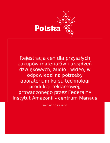 Rejestracja cen dla przyszłych zakupów materiałów i urządzeń dźwiękowych, audio i wideo, w odpowiedzi na potrzeby laboratorium kursu technologii produkcji reklamowej, prowadzonego przez Federalny Instytut Amazonii - centrum Manaus 2017-02-20 13:18:27 2 3 Segment: Audiowizualny - Audio Video Dźwięk - materiały i wyposażenie - materiały elektroniczne, Audiowizualny - Audio Video Dźwięk - Sprzęt - Materiał, Informatyka - osprzet, Laboratorium Chemiczne, Sprzęt telekomunikacyjny oraz telefonia (Radia, urządzenia nadawczo-odbiorcze, centrale telefoniczne itd ..) - Sprzęt materiał Avenida Sete de Setembro, 1975 Centro - Manaus (92) 3621-6707 site http://www.ifam.edu.br email [email protected] AM PRZETARG 6/2017 Przedmiot: Rejestracja cen dla przyszłych zakupów materiałów i urządzeń dźwiękowych, audio i wideo, w odpowiedzi na potrzeby laboratorium kursu technologii produkcji reklamowej, prowadzonego przez Federalny Instytut Amazonii - centrum Manaus Segment: Audiowizualny - Audio Video Dźwięk - materiały i wyposażenie - materiały elektroniczne, Audiowizualny - Audio Video Dźwięk - Sprzęt - Materiał, Informatyka - osprzet, Laboratorium Chemiczne, Sprzęt telekomunikacyjny oraz telefonia (Radia, urządzenia nadawczo-odbiorcze, centrale telefoniczne itd ..) - Sprzęt materiał Otwarcie: 06.03.2017 10:00 Informacja: Źródło ComprasNet 16/02/2017 Komplementarne: Kod UASG: 158445 ID Universum: 2812742 4