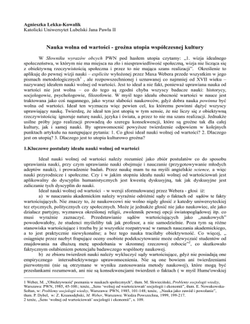 Agnieszka Lekka-Kowalik Katolicki Uniwersytet Lubelski Jana Pawła II Nauka wolna od wartości - groźna utopia współczesnej kultury W Słowniku wyrazów obcych PWN pod hasłem utopia czytamy: „1. wizja idealnego społeczeństwa, w którym nie ma miejsca na zło i niesprawiedliwość społeczną, wizja nie licząca się z obiektywną rzeczywistością społeczna i przez to nie mająca szans realizacji”. Określenie to aplikuję do pewnej wizji nauki – explicite wyłożonej przez Maxa Webera przede wszystkim w jego pismach metodologicznych1 , ale rozpowszechnionej i uznawanej co najmniej od XVII wieku – nazywanej ideałem nauki wolnej od wartości. Jest to ideał a nie fakt, ponieważ uprawiana nauka od wartości nie jest wolna – co do tego są zgodni chyba wszyscy badacze nauki: historycy, socjologowie, psychologowie, filozofowie. W myśl tego ideału obecność wartości w nauce jest traktowana jako coś nagannego, jako wyraz słabości naukowców, gdyż dobra nauka powinna być wolna od wartości. Ideał ten wyznacza więc pewien cel, ku któremu powinni dążyć wszyscy uprawiający naukę. Twierdzę, że ideał ten jest utopią w tym sensie, że nie liczy się z obiektywną rzeczywistością: ignoruje naturę nauki, języka i świata, a przez to nie ma szans realizacji. Jednakże usilne próby jego realizacji prowadzą do szeregu konsekwencji, które są groźne tak dla całej kultury, jak i samej nauki. By uprawomocnić powyższe twierdzenie odpowiem w kolejnych punktach artykułu na następujące pytania: 1. Co głosi ideał nauki wolnej od wartości? 2. Dlaczego jest on utopią? 3. Dlaczego jest to utopia kulturowo groźna? 1.Kluczowe postulaty ideału nauki wolnej od wartości Ideał nauki wolnej od wartości należy rozumieć jako zbiór postulatów co do sposobu uprawiania nauki, przy czym uprawianie nauki obejmuje i nauczanie (przygotowywanie młodych adeptów nauki), i prowadzenie badań. Przez naukę mam tu na myśli angielskie science, a więc nauki przyrodnicze i społeczne. Czy i w jakim stopniu ideału nauki wolnej od wartościowań jest aplikowalny do dyscyplin humanistycznych jest kwestią dyskusyjną, tak jak dyskusyjne jest zaliczanie tych dyscyplin do nauki. Ideał nauki wolnej od wartości - w wersji sformułowanej przez Webera - głosi iż: a) w nauczaniu akademickim należy wyraźnie odróżnić sądy o faktach od sądów te fakty wartościujących. Nie znaczy to, że naukowcowi nie wolno nigdy głosić z katedry uniwersyteckiej tez etycznych, politycznych czy społecznych. Może je jednakże głosić nie jako naukowiec, ale jako działacz partyjny, wyznawca określonej religii, zwolennik pewnej opcji światopoglądowej itp. co musi wyraźnie zaznaczyć. Przedstawianie sądów wartościujących jako „naukowych” powodowałoby, że studenci myśleliby tak jak profesor, a nie samodzielnie. Poza tym są różne stanowiska wartościujące i trzeba by je wszystkie rozpatrywać w ramach nauczania akademickiego, a to jest praktycznie niewykonalne; a bez tego nauka traciłaby obiektywność. Co więcej, „ osiągnięte przez nazbyt frapujące oceny osobiste podekscytowanie może odzwyczaić studentów od znajdowania na dłuższą metę upodobania w skromnej rzeczowej robocie”2, co skutkowało faktycznym osłabieniem potencjału badawczego wspólnoty naukowej. b) ze zbioru twierdzeń nauki należy wykluczyć sądy wartościujące, gdyż nie posiadają one empirycznego intersubiektywnego uprawomocnienia. Nie są one bowiem ani twierdzeniami pierwotnymi (nie są otrzymane w wyniku zastosowania metody naukowej), które mogą być przesłankami rozumowań, ani nie są konsekwencjami twierdzeń o faktach ( w myśl Hume'owskiej 1 Weber, M. „'Obiektywność' poznania w naukach społecznych”, tłum. M. Skwieciński, Problemy socjologii wiedzy, Warszawa: PWN, 1985, 45-100.; tenże, „Sens ‘wolnej od wartościowań’ socjologii i ekonomii”, tłum. E. NowakowskaSołtan, w: Problemy socjologii wiedzy, Warszawa: PWN, 1985, 101-148; tenże, „Nauka jako zawód i powołanie”, tłum. P. Dybel, w: Z. Krasnodębski, M. Weber, Warszawa: Wiedza Powszechna, 1999, 199-217. 2 tenże, „Sens ‘wolnej od wartościowań’ socjologii i ekonomii”, s. 109. zasady „nie ma przejścia od 'jest' do 'powinien'”). Nauka jest w stanie zaoferować jedynie naukową krytykę sądów wartościujących tj. wykrycie „ostatecznych aksjomatów wartościujących” , pokazanie ich konsekwencji teoretycznych, oraz praktycznych razie gdyby stały się podstawą działania, a także ewentualnie punkty niespójności między zbiorami takich ostatecznych aksjomatów. c) nie wolno uprawomocniać celów działania za pomocą procedur naukowych. Nauka może dostarczyć środków, ale nie wskaże celów. Wskazanie środków to nic innego, jak ustalenie, że po stanie x zawsze następuje stan y, który z jakiegoś powodu jest pożądany. Weber twierdzi: „dyscyplina empiryczna za pomocą właściwych sobie środków może wskazać jedynie na: 1 ) konieczne środki, 2) nieuchronne skutki uboczne, 3) praktyczne konsekwencje wynikającej z dwóch pierwszych punktów konkurencyjności wielu możliwych wartościowań. Dyscypliny filozoficzne natomiast mogą za pomocą właściwych sobie intelektualnych środków ustalić ponadto 'sens' wartościowań, a więc ich ostateczną strukturę znaczeniową i ich znaczeniowe konsekwencje, czyli wskazać ich 'miejsce' w obrębie zbioru wszystkich w ogóle możliwych 'ostatecznych' wartości oraz wytyczyć odpowiadające ich znaczeniu granice sfer ich ważności (ihre sinnhaften Geltungssphären). Już jednak tak proste kwestie jak takie oto: Jak dalece cel uświęcać ma konieczne do jego osiągnięcia środki? Czy też inna: Jak dalece godzić się należy z niepożądanymi skutkami ubocznymi? Albo: Jak łagodzić konflikty pomiędzy rozlicznymi, kolidującymi ze sobą in concreto, pożądanymi bądź mającymi charakter powinności (gesollten) ce