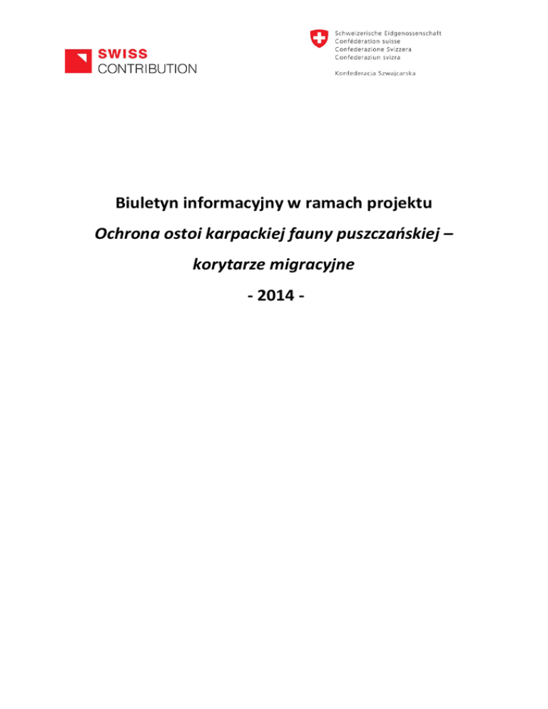 Biuletyn informacyjny w ramach projektu Ochrona ostoi karpackiej fauny puszczańskiej – korytarze migracyjne - 2014 - Spis treści Podstawowe informacje o projekcie ....................................................................................................... 3 Działanie 1. .............................................................................................................................................. 7 ZARZĄDZANIE PROJEKTEM (administracyjne i finansowe koszty zarządzania) ...................................... 7 Działanie II ............................................................................................................................................... 8 INWESTYCJE i WYPOSAŻENIE (wszystkie działania) ................................................................................ 8 Działanie III .............................................................................................................................................. 9 Weryfikacja i waloryzacja korytarzy ekologicznych ................................................................................ 9 Działanie IV ............................................................................................................................................ 11 Działania informacyjno-edukacyjne, włączając podnoszenie świadomości.......................................... 11 Działanie V ............................................................................................................................................. 14 Wizyty studyjne ..................................................................................................................................... 14 Działanie VI ............................................................................................................................................ 15 Informacja i promocja ........................................................................................................................... 15 Działanie VII ........................................................................................................................................... 16 Audyt ..................................................................................................................................................... 16 Działania planowane w następnym okresie sprawozdawczym: ........................................................... 16 Spis wykresów, tabel ............................................................................................................................. 18 2 Podstawowe informacje o projekcie • Projekt „Ochrona ostoi karpackiej fauny puszczańskiej – korytarze migracyjne” – realizowany w ramach Szwajcarsko-Polskiego Programu Współpracy • Okres realizacji: 01/01/2012 – 31/12/2015 • 17 Partnerów: • Stowarzyszenie "Pro Carpathia" (IR) • Bieszczadzki Park Narodowy (PP1) • Magurski Park Narodowy (PP2) • Regionalna Dyrekcja Lasów Państwowych w Krośnie (PP3) • Nadleśnictwo Baligród (PP4) • Nadleśnictwo Bircza (PP5) • Nadleśnictwo Cisna (PP6) • Nadleśnictwo Dukla (PP7) • Nadleśnictwo Komańcza (PP8) • Nadleśnictwo Lesko z/s w Łączkach (PP9) • Nadleśnictwo Lutowiska (PP10) • Nadleśnictwo Rymanów (PP11) • Nadleśnictwo Stuposiany (PP12) • Nadleśnictwo Ustrzyki Dolne (PP13) • Zespół Karpackich Parków Krajobrazowych w Krośnie (PP14) • Szwajcarski Park Narodowy (PP15) • Nadleśnictwo Kołaczyce (PP16) • Całkowita wartość projektu: 1 579 686 CHF (4 740 638,42 PLN) • Cel projektu: ochrona ostoi fauny puszczańskiej w Karpatach (teren województwa podkarpackiego) poprzez wyznaczenie oraz ochronę istniejących korytarzy ekologicznych, gwarantujących zachowanie spójności środowiska dla populacji tych zwierząt oraz podniesienie poziomu wiedzy i świadomości władz, mieszkańców regionu na temat znaczenia korytarzy ekologicznych ich roli oraz zagrożeń związanych z rozwojem cywilizacyjnym i niewłaściwą polityką rozbudowy siedlisk ludzkich. 3 Główne zagrożenie dla fauny puszczańskiej, której siedliskiem są duże i w miarę zwarte kompleksy leśne, to wylesienia oraz tworzenie antropogenicznych barier, co prowadzi do powstawania coraz bardziej przekształconych, mniejszych i izolowanych fragmentów lasów, uniemożliwiających prawidłowe funkcjonowanie populacji zwierząt. Obszar objęty projektem charakteryzuje się stosunkowo dużą lesistością oraz niskim stopniem fragmentacji obszarów leśnych. Obszary leżące w bezpośredniej bliskości głównego łuku Karpat charakteryzuje niskie zaludnienie oraz zagęszczenie dróg utwardzanych, antropopresja wydaje się jednak czynnikiem kluczowym i ograniczającym dla populacji zwierząt. Konsekwencje fragmentacji siedlisk dla gatunków można osłabić, zachowując lub odtwarzając połączenia między poszczególnymi płatami siedlisk, zasiedlanymi przez te gatunki, czyli korytarze migracyjne. Głównym celem projektu jest ochrona ostoi fauny puszczańskiej w Karpatach (teren województwa podkarpackiego) poprzez wyznaczenie oraz ochronę istniejących korytarzy ekologicznych, gwarantujących zachowanie spójności środowiska dla populacji tych zwierząt oraz podniesienie poziomu wiedzy i świadomości władz, mieszkańców regionu na temat znaczenia korytarzy ekologicznych ich roli oraz zagrożeń związanych z rozwojem cywilizacyjnym i niewłaściwą polityką rozbudowy siedlisk ludzkich. Ze względu na fakt, iż nie jest możliwe jednoczesne uwzględnienie wymagań wszystkich gatunków fauny puszczańskiej dla których istnienie korytarzy migracyjnych jest szczególnie istotne wyznaczenie ich będzie oparte na monitoringu wybranych gatunków wskaźnikowych, o szczególnie dużych wymaganiach siedliskowych (tzw. umbrella species), tj. drapieżników (wilki, rysie, niedźwiedzie), zwierząt kopytnych (jelenie, dziki, żubry, łosie) oraz ptaków dr