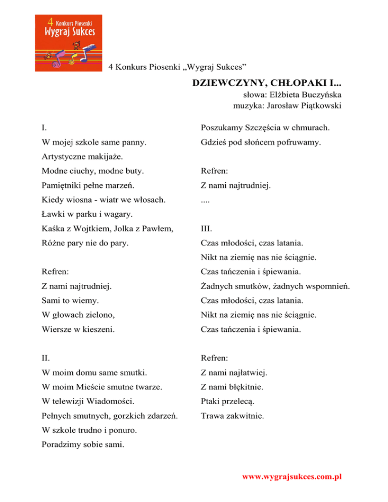 4 Konkurs Piosenki „Wygraj Sukces” DZIEWCZYNY, CHŁOPAKI I... słowa: Elżbieta Buczyńska muzyka: Jarosław Piątkowski I. Poszukamy Szczęścia w chmurach. W mojej szkole same panny. Gdzieś pod słońcem pofruwamy. Artystyczne makijaże. Modne ciuchy, modne buty. Refren: Pamiętniki pełne marzeń. Z nami najtrudniej. Kiedy wiosna - wiatr we włosach. .... Ławki w parku i wagary. Kaśka z Wojtkiem, Jolka z Pawłem, III. Różne pary nie do pary. Czas młodości, czas latania. Nikt na ziemię nas nie ściągnie. Refren: Czas tańczenia i śpiewania. Z nami najtrudniej. Żadnych smutków, żadnych wspomnień. Sami to wiemy. Czas młodości, czas latania. W głowach zielono, Nikt na ziemię nas nie ściągnie. Wiersze w kieszeni. Czas tańczenia i śpiewania. II. Refren: W moim domu same smutki. Z nami najłatwiej. W moim Mieście smutne twarze. Z nami błękitnie. W telewizji Wiadomości. Ptaki przelecą. Pełnych smutnych, gorzkich zdarzeń. Trawa zakwitnie. W szkole trudno i ponuro. Poradzimy sobie sami. www.wygrajsukces.com.pl