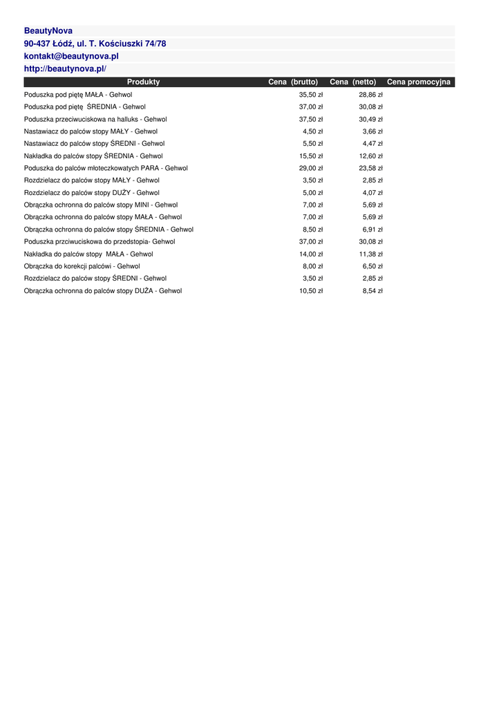 BeautyNova 90-437 Łódź, ul. T. Kościuszki 74/78 [email protected] http://beautynova.pl/ Produkty Cena (brutto) Cena (netto) Poduszka pod piętę MAŁA - Gehwol 35,50 zł 28,86 zł Poduszka pod piętę ŚREDNIA - Gehwol 37,00 zł 30,08 zł Poduszka przeciwuciskowa na halluks - Gehwol 37,50 zł 30,49 zł Nastawiacz do palców stopy MAŁY - Gehwol 4,50 zł 3,66 zł Nastawiacz do palców stopy ŚREDNI - Gehwol 5,50 zł 4,47 zł Nakładka do palców stopy ŚREDNIA - Gehwol 15,50 zł 12,60 zł Poduszka do palców młoteczkowatych PARA - Gehwol 29,00 zł 23,58 zł Rozdzielacz do palców stopy MAŁY - Gehwol 3,50 zł 2,85 zł Rozdzielacz do palców stopy DUŻY - Gehwol 5,00 zł 4,07 zł Obrączka ochronna do palców stopy MINI - Gehwol 7,00 zł 5,69 zł Obrączka ochronna do palców stopy MAŁA - Gehwol 7,00 zł 5,69 zł Obrączka ochronna do palców stopy ŚREDNIA - Gehwol 8,50 zł 6,91 zł Poduszka przciwuciskowa do przedstopia- Gehwol 37,00 zł 30,08 zł Nakładka do palców stopy MAŁA - Gehwol 14,00 zł 11,38 zł Obrączka do korekcji palcówi - Gehwol 8,00 zł 6,50 zł Rozdzielacz do palców stopy ŚREDNI - Gehwol 3,50 zł 2,85 zł 10,50 zł 8,54 zł Obrączka ochronna do palców stopy DUŻA - Gehwol Cena promocyjna