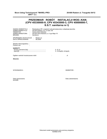 Biuro Usług Technicznych "MAREL-PROJEKT" s.c. 26-600 Radom ul. Traugutta 54/12 PRZEDMIAR ROBÓT INSTALACJI WOD.-KAN. (CPV 45330000-9, CPV 45343000-3, CPV 45000000-7, S.S.T. sanitarna nr I) NAZWA INWESTYCJI ADRES INWESTYCJI INWESTOR ADRES INWESTORA BRANŻA : : : : : Rozbudowa SP o segment sali gimnastycznej z adaptacją łącznika 05-530 Dobiesz, dz. nr ewid. 59 Gmina Góra Kalwaria 05-530 Góra Kalwaria, ul. 3-go Maja 10 Sanitarna SPORZĄDZIŁ KALKULACJE : DATA OPRACOWANIA : Marek Lis 08.2009 Stawka roboczogodziny : Poziom cen : NARZUTY Koszty pośrednie [Kp] ............................................ Zysk [Z] .................................................................. Ogółem wartość kosztorysowa robót % R, S % R+Kp(R), S+Kp(S) : zł Słownie: WYKONAWCA : INWESTOR : Data opracowania 08.2009 Data zatwierdzenia Dokument został opracowany przy pomocy programu NORMA STD OGÓLNA CHARAKTERYSTYKA OBIEKTU Przedmiotem inwestycji jest budowa instalacji wod.-kan. dla rozbudowy Szkoły Podstawowej w Dobieszu o segment sali gimnastycznej wraz z adaptacją łącznika oraz zmianą sposobu ogrzewania obiektu Kosztorys swym zakresem obejmuje następujące prace: 1. roboty demontażowe istniejącej instalacji wod.-kan. w łączniku 2. roboty montażowe projektowanej instalacji wodociągowej - rurociągi wodociągowe stalowe - poziomy i piony - rurociągi wodociągowe polietylenowe - podejścia do przyborów - armatura instalacji wodociągowej - próby i izolacja przewodow wodociągowych 3. roboty montażowe projektowanej instalacji kanalizacyjnej - przykanaliki kanalizacyjne - prowadzone w ziemi - rurociągi kanalizacyjne z PCV - poziomy, piony i podejścia do przyborów - uzbrojenie i urządzenia instalacji kanalizacyjnej 4. roboty budowlane wynikające z montażu instalacji wodno-kanalizacyjnej 5. roboty budowlane ścienne i posadzkowe w łączniku Kosztorys wykonano zgodnie i w oparciu o: - Ustawa z dnia 29.01.2004 r. Prawo Zamówień Publicznych - Rozporządzenie Ministra Infrastruktury z dnia 18.05.2004 r. w sprawie określenia metod i podstaw sporządzania kosztorysu inwestorskiego (Dz.U. z 2004 r. poz. 172) - Kosztorysowe Normy Rzeczowe - Projekt Budowlano-Wykonawczy Wszystkie materiały i urządzenia instalacyjne określonych producentów, wymienione w kosztorysie, należy traktować jako przykładowe. Dopuszcza się wykorzystanie innych materiałów i urządzeń lecz o podobnej charakterystyce, nie gorszej jakości oraz posiadające niezbędne dopuszczenia i atesty. -2- Norma STD Wersja 4.21 Licencja: 6753 dla Marel Projekt Dobiesz-wod.-kan.Przedmiar.KST PRZEDMIAR Lp. Podst Opis i wyliczenia j.m. Poszcz Kosztorys inwestorski instalacji wod.-kan. dla sali gimnastycznej przy SP w Dobieszu 1 Instalacja wodociągowa - roboty demontażowe (CPV 45330000-9, S.S.T. cz. sanitarna nr I) 1 KNR-W 4-02 Demontaż instalacji wodociągowej w łączniku kpl. d.1 0145-07 Krotność = 5 analogia 1 kpl. 1,000 RAZEM 2 KNR 2-31 Transp.mat.sztukowych o masie 200-1000 kg na odl.do 0.5 km z załad.i t d.1 1507-02 wyład.mechanicznym samochodem do 5 t analogia 1 t 1,000 RAZEM 3 KNR 2-31 Dod.do tabl. 1507 za każde 0.5 km transportu samochodem skrzyniowym do 5 t d.1 1508-01 t (4,5 km) analogia Krotność = 9 1 t 1,000 RAZEM 2 Instalacja wodociągowa - rurociągi stalowe (CPV 45330000-9, S.S.T. cz. sanitarna nr I) 4 KNR-W 2-15 Rurociągi w instalacjach wodociągowych ze stali cienkościennej typ Kanm d.2 0106-01 therm Inox o śr. zewnętrznej 15 mm o połączeniach zaciskowych w budynkach analogia niemieszkalnych 78 m 78,000 RAZEM 5 KNR-W 2-15 Rurociągi w instalacjach wodociągowych ze stali cienkościennej typ Kanm d.2 0106-01 therm Inox o śr. zewnętrznej 18 mm o połączeniach zaciskowych w budynkach analogia niemieszkalnych 47 m 47,000 RAZEM 6 KNR-W 2-15 Rurociągi w instalacjach wodociągowych ze stali cienkościennej typ Kanm d.2 0106-02 therm Inox o śr. zewnętrznej 22 mm o połączeniach zaciskowych w budynkach analogia niemieszkalnych 27 m 27,000 RAZEM 7 KNR-W 2-15 Rurociągi w instalacjach wodociągowych ze stali cienkościennej typ Kanm d.2 0106-03 therm Inox o śr. zewnętrznej 28 mm o połączeniach zaciskowych w budynkach analogia niemieszkalnych 19 m 19,000 RAZEM 8 KNR-W 2-15 Rurociągi w instalacjach wodociągowych ze stali cienkościennej typ Kanm d.2 0106-04 therm Inox o śr. zewnętrznej 35 mm o połączeniach zaciskowych w budynkach analogia niemieszkalnych 66 m 66,000 RAZEM 9 KNR-W 2-15 Rurociągi w instalacjach wodociągowych ze stali cienkościennej typ Kanm d.2 0106-05 therm Inox o śr. zewnętrznej 42 mm o połączeniach zaciskowych w budynkach analogia niemieszkalnych 35 m 35,000 RAZEM 10 KNR-W 2-15 Rurociągi w instalacjach wodociągowych ze stali cienkościennej typ Kanm d.2 0106-06 therm Inox o śr. zewnętrznej 54 mm o połączeniach zaciskowych w budynkach analogia niemieszkalnych 36 m 36,000 RAZEM 11 KNR-W 2-15 Dodatki za podejścia dopływowe w rurociągach stalowych do hydrantów i za- szt. d.2 0115-03 worów ze złączką do węża o połączeniu sztywnym o śr. nominalnej 25 mm 5 szt. 5,000 RAZEM 3 Instalacja wodociągowa - rurociągi polietylenowe (CPV 45330000-9, S.S.T. cz. sanitarna nr I) 12 KNR-W 2-15 Rurociągi w instalacjach wodociągowych z PE typ Kan-therm Press o śr. zem d.3 0112-01 wnętrznej 16x2 mm o połączeniach zaciskowych w budynkach niemieszkalanalogia nych 123 m 123,000 RAZEM 13 KNR-W 2-15 Rurociągi w instalacjach wodociągowych z PE typ Kan-therm Press o śr. zem d.3 0112-01 wnętrznej 20x2 mm o połączeniach zaciskowych w budynkach niemieszkalanalogia nych 42 m 42,000 RAZEM 14 KNR-W 2-15 Rurociągi w instalacjach wodociągowych z PE typ Kan-therm Press o śr. zem d.3 0112-02 wnętrznej 26x3 mm o połączeniach zaciskowych w budynkach niemieszkalanalogia nych 29 m 29,000 RAZEM -3- Norma STD Wersja 4.21 Licencja: 6753 dla Marel Projekt Razem 1,000 1,000 1,000 78,000 47,000 27,000 19,000 66,000 35,000 36,000 5,000 123,000 42,000 29,000 Dobiesz-wod.-