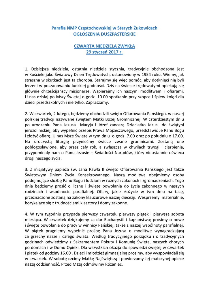 Parafia NMP Częstochowskiej w Starych Żukowicach OGŁOSZENIA DUSZPASTERSKIE CZWARTA NIEDZIELA ZWYKŁA 29 styczeń 2017 r. 1. Dzisiejsza niedziela, ostatnia niedziela stycznia, tradycyjnie obchodzona jest w Kościele jako Światowy Dzień Trędowatych, ustanowiony w 1954 roku. Wiemy, jak straszna w skutkach jest ta choroba. Starajmy się więc pomóc, aby dotknięci nią byli leczeni w poszanowaniu ludzkiej godności. Dziś na świecie trędowatymi opiekują się głównie chrześcijańscy misjonarze. Wspierajmy ich naszymi modlitwami i ofiarami. U nas dzisiaj po Mszy Świętej o godz. 10.00 spotkanie przy szopce i śpiew kolęd dla dzieci przedszkolnych i nie tylko. Zapraszamy. 2. W czwartek, 2 lutego, będziemy obchodzili święto Ofiarowania Pańskiego, w naszej polskiej tradycji nazywane świętem Matki Bożej Gromnicznej. W czterdziestym dniu po urodzeniu Pana Jezusa Maryja i Józef zanoszą Dzieciątko Jezus do świątyni jerozolimskiej, aby wypełnić przepis Prawa Mojżeszowego, przedstawić Je Panu Bogu i złożyć ofiarę. U nas Msze Święte w tym dniu o godz. 7.00 oraz po południu o 17.00. Na uroczystą liturgię przynieśmy świece zwane gromnicami. Zostaną one pobłogosławione, aby przez cały rok, a zwłaszcza w chwilach trwogi i cierpienia, przypominały nam o Panu Jezusie – Światłości Narodów, który nieustannie oświeca drogi naszego życia. 3. Z inicjatywy papieża św. Jana Pawła II święto Ofiarowania Pańskiego jest także Światowym Dniem Życia Konsekrowanego. Naszą modlitwą obejmiemy osoby podejmujące służbę Panu Bogu i ludziom w różnych zakonach i zgromadzeniach. Tego dnia będziemy prosić o liczne i święte powołania do życia zakonnego w naszych rodzinach i wspólnocie parafialnej. Ofiary, jakie złożycie w tym dniu na tacę, przeznaczone zostaną na zakony klauzurowe naszej diecezji. Wesprzemy materialnie, borykające się z trudnościami klasztory i domy zakonne. 4. W tym tygodniu przypada pierwszy czwartek, pierwszy piątek i pierwsza sobota miesiąca. W czwartek dziękujemy za dar Eucharystii i kapłaństwa; prosimy o nowe i święte powołania do pracy w winnicy Pańskiej, także z naszej wspólnoty parafialnej. W piątek pragniemy wypełnić prośbę Pana Jezusa o modlitwę wynagradzającą za grzechy nasze i całego świata. Według tradycyjnego porządku i o tradycyjnych godzinach odwiedzimy z Sakramentem Pokuty i Komunią Świętą, naszych chorych po domach i w Domu Opieki. Dla wszystkich okazja do spowiedzi świętej w czwartek i piątek od godziny 16.00 . Dzieci i młodzież gimnazjalną prosimy, aby wyspowiadali się w czwartek. W sobotę czcimy Matkę Najświętszą i powierzamy Jej matczynej opiece naszą codzienność. Przed Mszą odmówimy Różaniec. 5. W tym tygodniu patronują nam: 31 I wtorek – św. Jan Bosko (1815-1888), wielki pedagog i apostoł młodzieży; 3 II piątek – św. Błażej, biskup i męczennik z IV wieku, jego pomocy wzywamy w chorobach gardła. Z tej racji, że w tym roku jest to pierwszy piątek miesiąca i większa liczba wiernych w kościele, po Mszach Świętych będzie ogólna modlitwa z błogosławieństwem naszych gardeł. 6. Wszystkim Solenizantom nowego tygodnia oraz obchodzącym takie czy inne rocznice, życzymy Bożego Błogosławieństwa oraz opieki Matki Bożej i świętych Patronów. ks. Kita Stanisław