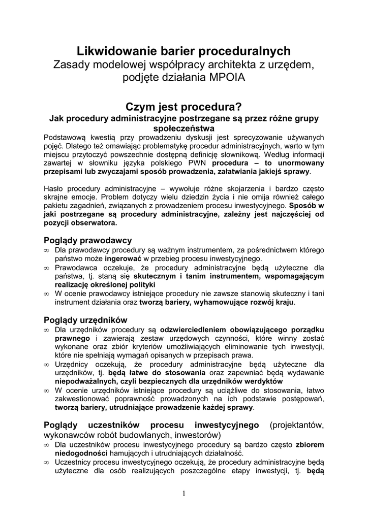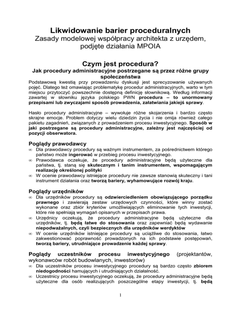 Likwidowanie barier proceduralnych Zasady modelowej współpracy architekta z urzędem, podjęte działania MPOIA Czym jest procedura? Jak procedury administracyjne postrzegane są przez różne grupy społeczeństwa Podstawową kwestią przy prowadzeniu dyskusji jest sprecyzowanie używanych pojęć. Dlatego też omawiając problematykę procedur administracyjnych, warto w tym miejscu przytoczyć powszechnie dostępną definicję słownikową. Według informacji zawartej w słowniku języka polskiego PWN procedura – to unormowany przepisami lub zwyczajami sposób prowadzenia, załatwiania jakiejś sprawy. Hasło procedury administracyjne – wywołuje różne skojarzenia i bardzo często skrajne emocje. Problem dotyczy wielu dziedzin życia i nie omija również całego pakietu zagadnień, związanych z prowadzeniem procesu inwestycyjnego. Sposób w jaki postrzegane są procedury administracyjne, zależny jest najczęściej od pozycji obserwatora. Poglądy prawodawcy • • • Dla prawodawcy procedury są ważnym instrumentem, za pośrednictwem którego państwo może ingerować w przebieg procesu inwestycyjnego. Prawodawca oczekuje, że procedury administracyjne będą użyteczne dla państwa, tj. staną się skutecznym i tanim instrumentem, wspomagającym realizację określonej polityki W ocenie prawodawcy istniejące procedury nie zawsze stanowią skuteczny i tani instrument działania oraz tworzą bariery, wyhamowujące rozwój kraju. Poglądy urzędników • • • Dla urzędników procedury są odzwierciedleniem obowiązującego porządku prawnego i zawierają zestaw urzędowych czynności, które winny zostać wykonane oraz zbiór kryteriów umożliwiających eliminowanie tych inwestycji, które nie spełniają wymagań opisanych w przepisach prawa. Urzędnicy oczekują, że procedury administracyjne będą użyteczne dla urzędników, tj. będą łatwe do stosowania oraz zapewniać będą wydawanie niepodważalnych, czyli bezpiecznych dla urzędników werdyktów W ocenie urzędników istniejące procedury są uciążliwe do stosowania, łatwo zakwestionować poprawność prowadzonych na ich podstawie postępowań, tworzą bariery, utrudniające prowadzenie każdej sprawy. Poglądy uczestników procesu inwestycyjnego wykonawców robót budowlanych, inwestorów) • • (projektantów, Dla uczestników procesu inwestycyjnego procedury są bardzo często zbiorem niedogodności hamujących i utrudniających działalność. Uczestnicy procesu inwestycyjnego oczekują, że procedury administracyjne będą użyteczne dla osób realizujących poszczególne etapy inwestycji, tj. będą 1 • skutecznie wspomagać realizację inwestycji, czyniąc je ekonomicznie opłacalnymi. W ocenie uczestników procesu inwestycyjnego istniejące procedury nie zapewniają odpowiedniego wsparcia w postaci informacji o istotnych dla inwestycji uwarunkowaniach, opóźniają wszystkie etapy prowadzenia inwestycji zmniejszając ich ekonomiczną opłacalność, tworzą bariery utrudniając prowadzenie procesu inwestycyjnego. Poglądy pozostałej części społeczeństwa (w tym użytkowników obiektów budowlanych oraz właścicieli gruntów przylegających do terenów, na których realizowane będą inwestycje) • • • Dla pozostałej części społeczeństwa procedury są najczęściej mało skutecznym trybem działania, nie chroniącym w wystarczający sposób istotnych dla tej grupy społecznej, wartości. Ta część społeczeństwa oczekuje, że procedury administracyjne będą użyteczne dla tej grupy społeczeństwa, tj. zapewnią maksymalnie pełną ochronę interesów tej grupy. W ocenie tej części społeczeństwa istniejące procedury nie zapewniają ochrony interesów osób trzecich, szczególnie w zakresie tych interesów faktycznych, których ochrona nie została jednoznacznie określona przepisami prawa, tworzą barierę utrudniającą realizację uprawnień osób trzecich, przedłużając i komplikując postępowania odwoławcze. Przyczyny tworzenia barier proceduralnych Dlaczego procedury administracyjne stają się barierami procesu inwestycyjnego? W ocenie wszystkich grup społeczeństwa - procedury administracyjne są barierami procesu inwestycyjnego. W związku z powyższym, podstawowym problemem staje się odpowiedź na pytanie - jakie są przyczyny tworzenia barier proceduralnych? Ponieważ procedury administracyjne opracowywane są na bazie systemu prawnego oraz interpretacji przepisów – to przyczyny tworzenia barier proceduralnych związane są z pewnością zarówno z jakością systemu prawa jak i z trafnością przyjętych interpretacji. W celu pełniejszego rozpoznania problemu barier proceduralnych, konieczna jest analiza: • mechanizmu działania procedur • cech współczesnego systemu prawnego • charakteru przyjmowanych interpretacji Mechanizm działania procedur Zamierzenia inwestycyjne poddawane są wieloaspektowemu procesowi kontroli, weryfikacja obejmuje badanie zgodności inwestycji z założeniami, przyjmowane są różne kryteria oceny inwestycji (w tym wynikające z przepisów prawa), w toku działania stosowane są różne metody prowadzenia sprawy, w tym różne metody komunikacji pomiędzy organami administracji publicznej i stronami postępowania. • Procedura określa sposób, w jaki zamierzenie inwestycyjne badane jest przy pomocy układu filtrów, które weryfikują i mogą modyfikować inwestycję. 2 • • Na rodzaj filtrów oraz na sposób badania istotny wpływ mają przepisy prawa oraz przyjęte interpretacje. Jeżeli charakter i sposób działania filtrów jest nieodpowiedni to procedury stają się barierami. Schemat działania procedur zamierzenie inwestycyjne zamierzenie inwestycyjne wersja pierwotna wersja zmodyfikowana filtry wychwytujące niezgodne z założeniami cechy zamierzenia inwestycyjnego (korekty autorskie projektantów, sprawdzenie projektu przez osoby sprawdzające, opiniowanie i uzgadnianie zamierzenia inwestycyjnego 