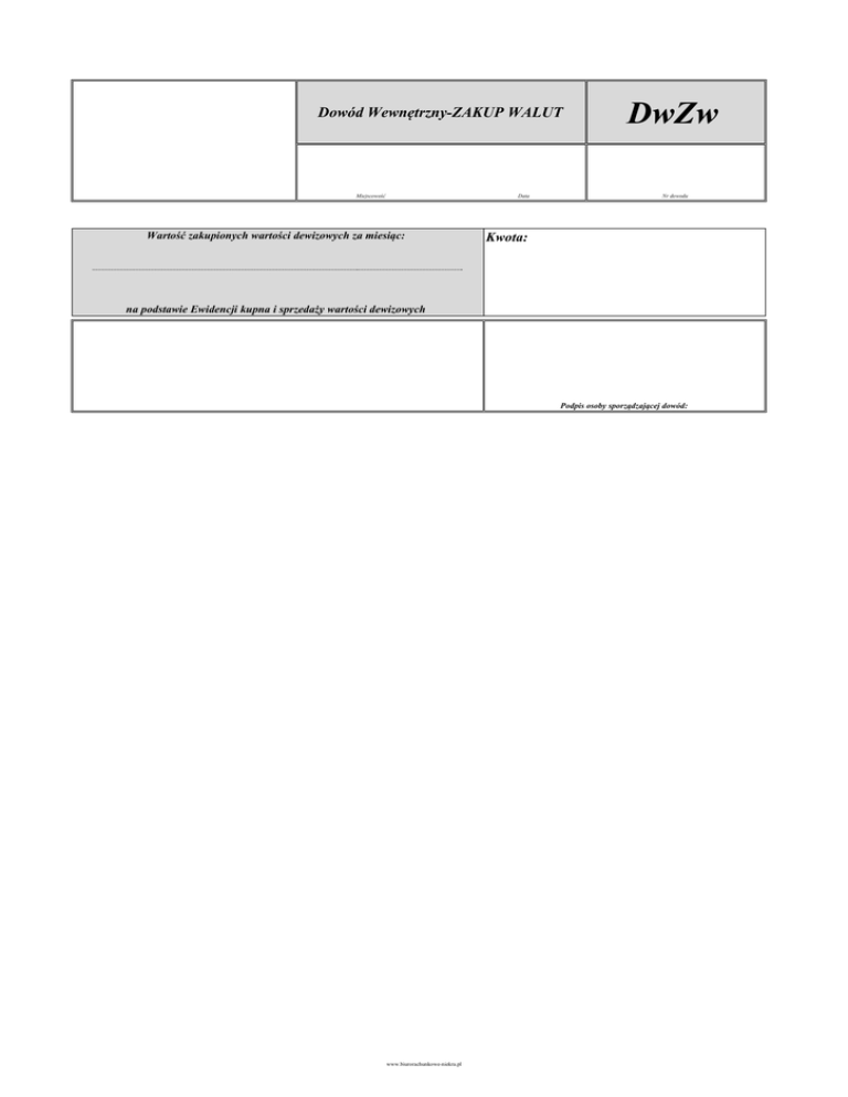 Dowód Wewnętrzny-ZAKUP WALUT Miejscowość Data Wartość zakupionych wartości dewizowych za miesiąc: DwZw Nr dowodu Kwota: ……………………………………………………………………………………………………………………………..………………………………………………. na podstawie Ewidencji kupna i sprzedaży wartości dewizowych Podpis osoby sporządzającej dowód: www.biurorachunkowe-niekra.pl