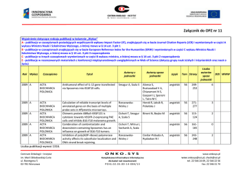 Załącznik do OPZ nr 11 Wyjaśnienie dotyczące rodzaju publikacji w kolumnie „Wykaz” A - publikacje w czasopismach posiadających współczynnik wpływu Impact Factor (IF), znajdujących się w bazie Journal Citation Reports (JCR) i wymienionych w części A wykazu Ministra Nauki i Szkolnictwa Wyższego, o której mowa w § 14 ust. 3 pkt 1 B - publikacje w czasopismach znajdujących się w bazie European Reference Index for the Humanities (ERIH) i wymienionych w części C wykazu Ministra Nauki i Szkolnictwa Wyższego, o której mowa w § 14 ust. 3 pkt 3 rozporządzenia C - publikacje w innych czasopismach wymienionych w części B wykazu ministra, o której mowa w § 14 ust. 3 pkt 2 rozporządzenia E - publikacje w recenzowanych materiałach z konferencji międzynarodowych uwzględnionych w Web of Science (dotyczy grupy nauk ścisłych i inżynierskich oraz nauk o życiu) Rok Wykaz Czasopismo Autorzy z jednostki Tytuł 2009 A ACTA BIOCHIMICA POLONICA Antitumoral effect of IL-12 gene transfected via liposomes into B16F10 cells. Smagur A, Szala S 2009 A ACTA BIOCHIMICA POLONICA ACTA BIOCHIMICA POLONICA ACTA BIOCHIMICA POLONICA ACTA BIOCHIMICA POLONICA Calculation of reliable transcript levels of annotated genes on the basis of multiple probe-sets in Affymetrix microarrays. Chimeric protein ABRaA-VEGF121 is cytotoxic towards VEGFR-2-expressing PAE cells and inhibits B16-F10 melanoma growth. Combination of combretastatin and doxorubicin-containing liposomes has an influence on growth of B16-F10 tumors. Inhibition of poly(ADP-ribose) polymerase activity affects its subcellular localization and DNA strand break rejoining. RzeszowskaWolny J 2009 A 2009 A 2009 A Autorzy spoza jednostki Język Tom Strony Liczba autorów spoza jednostki Alonso S, Bustuoabad V A, Chiaramoni N S, Gasparri J, Speroni L, Taira M C Herok R, Jaksik R, Polańska J angielski 56 249253 6 angielski 56 271277 3 Biront N, Boyko M angielski 56 115124 2 Cichoń T, Mitrus I, Sochanik A, Szala S RzeszowskaCieślar-Pobuda A, Wolny J Ryabokon N I angielski 56 161165 0 angielski 56 243248 2 Cichoń T, Smagur A, Szala S DOI WWW Liczba publikacji wynosi 1316. Centrum Onkologii – Instytut im. Marii Skłodowskiej-Curie ul. Roentgena 5 02-781 Warszawa ONKO.SYS Kompleksowa infrastruktura informatyczna dla badań nad nowotworami P O I G . 0 2. 0 3. 00- 1 4- 0 84/ 1 3 www.onkosys.pl [email protected]; [email protected] tel. 22 546 24 69, 22 546 22 56 fax: 22 546 31 74