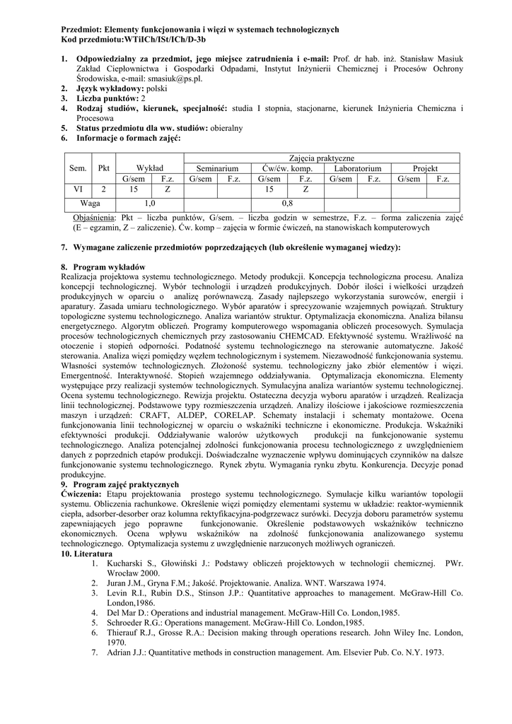 Przedmiot: Elementy funkcjonowania i więzi w systemach technologicznych Kod przedmiotu:WTiICh/ISt/ICh/D-3b 1. 2. 3. 4. 5. 6. Odpowiedzialny za przedmiot, jego miejsce zatrudnienia i e-mail: Prof. dr hab. inŜ. Stanisław Masiuk Zakład Ciepłownictwa i Gospodarki Odpadami, Instytut InŜynierii Chemicznej i Procesów Ochrony Środowiska, e-mail: [email protected]. Język wykładowy: polski Liczba punktów: 2 Rodzaj studiów, kierunek, specjalność: studia I stopnia, stacjonarne, kierunek InŜynieria Chemiczna i Procesowa Status przedmiotu dla ww. studiów: obieralny Informacje o formach zajęć: Sem. Pkt VI 2 Waga Wykład G/sem F.z. 15 Z 1,0 Seminarium G/sem F.z. Zajęcia praktyczne Ćw/ćw. komp. Laboratorium G/sem F.z. G/sem F.z. 15 Z Projekt G/sem F.z. 0,8 Objaśnienia: Pkt – liczba punktów, G/sem. – liczba godzin w semestrze, F.z. – forma zaliczenia zajęć (E – egzamin, Z – zaliczenie). Ćw. komp – zajęcia w formie ćwiczeń, na stanowiskach komputerowych 7. Wymagane zaliczenie przedmiotów poprzedzających (lub określenie wymaganej wiedzy): 8. Program wykładów Realizacja projektowa systemu technologicznego. Metody produkcji. Koncepcja technologiczna procesu. Analiza koncepcji technologicznej. Wybór technologii i urządzeń produkcyjnych. Dobór ilości i wielkości urządzeń produkcyjnych w oparciu o analizę porównawczą. Zasady najlepszego wykorzystania surowców, energii i aparatury. Zasada umiaru technologicznego. Wybór aparatów i sprecyzowanie wzajemnych powiązań. Struktury topologiczne systemu technologicznego. Analiza wariantów struktur. Optymalizacja ekonomiczna. Analiza bilansu energetycznego. Algorytm obliczeń. Programy komputerowego wspomagania obliczeń procesowych. Symulacja procesów technologicznych chemicznych przy zastosowaniu CHEMCAD. Efektywność systemu. WraŜliwość na otoczenie i stopień odporności. Podatność systemu technologicznego na sterowanie automatyczne. Jakość sterowania. Analiza więzi pomiędzy węzłem technologicznym i systemem. Niezawodność funkcjonowania systemu. Własności systemów technologicznych. ZłoŜoność systemu. technologiczny jako zbiór elementów i więzi. Emergentność. Interaktywność. Stopień wzajemnego oddziaływania. Optymalizacja ekonomiczna. Elementy występujące przy realizacji systemów technologicznych. Symulacyjna analiza wariantów systemu technologicznej. Ocena systemu technologicznego. Rewizja projektu. Ostateczna decyzja wyboru aparatów i urządzeń. Realizacja linii technologicznej. Podstawowe typy rozmieszczenia urządzeń. Analizy ilościowe i jakościowe rozmieszczenia maszyn i urządzeń: CRAFT, ALDEP, CORELAP. Schematy instalacji i schematy montaŜowe. Ocena funkcjonowania linii technologicznej w oparciu o wskaźniki techniczne i ekonomiczne. Produkcja. Wskaźniki efektywności produkcji. Oddziaływanie walorów uŜytkowych produkcji na funkcjonowanie systemu technologicznego. Analiza potencjalnej zdolności funkcjonowania procesu technologicznego z uwzględnieniem danych z poprzednich etapów produkcji. Doświadczalne wyznaczenie wpływu dominujących czynników na dalsze funkcjonowanie systemu technologicznego. Rynek zbytu. Wymagania rynku zbytu. Konkurencja. Decyzje ponad produkcyjne. 9. Program zajęć praktycznych Ćwiczenia: Etapu projektowania prostego systemu technologicznego. Symulacje kilku wariantów topologii systemu. Obliczenia rachunkowe. Określenie więzi pomiędzy elementami systemu w układzie: reaktor-wymiennik ciepła, adsorber-desorber oraz kolumna rektyfikacyjna-podgrzewacz surówki. Decyzja doboru parametrów systemu zapewniających jego poprawne funkcjonowanie. Określenie podstawowych wskaźników techniczno ekonomicznych. Ocena wpływu wskaźników na zdolność funkcjonowania analizowanego systemu technologicznego. Optymalizacja systemu z uwzględnienie narzuconych moŜliwych ograniczeń. 10. Literatura 1. Kucharski S., Głowiński J.: Podstawy obliczeń projektowych w technologii chemicznej. PWr. Wrocław 2000. 2. Juran J.M., Gryna F.M.; Jakość. Projektowanie. Analiza. WNT. Warszawa 1974. 3. Levin R.I., Rubin D.S., Stinson J.P.: Quantitative approaches to management. McGraw-Hill Co. London,1986. 4. Del Mar D.: Operations and industrial management. McGraw-Hill Co. London,1985. 5. Schroeder R.G.: Operations management. McGraw-Hill Co. London,1985. 6. Thierauf R.J., Grosse R.A.: Decision making through operations research. John Wiley Inc. London, 1970. 7. Adrian J.J.: Quantitative methods in construction management. Am. Elsevier Pub. Co. N.Y. 1973.