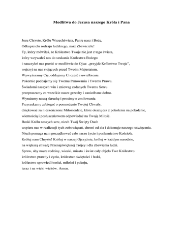 Modlitwa do Jezusa naszego Króla i Pana Jezu Chryste, Królu Wszechświata, Panie nasz i Boże, Odkupicielu rodzaju ludzkiego, nasz Zbawicielu! Ty, który mówiłeś, że Królestwo Twoje nie jest z tego świata, który wzywałeś nas do szukania Królestwa Bożego i nauczyłeś nas prosić w modlitwie do Ojca: „przyjdź Królestwo Twoje”, wejrzyj na nas stojących przed Twoim Majestatem. Wywyższamy Cię, oddajemy Ci cześć i uwielbienie. Pokornie poddajemy się Twemu Panowaniu i Twemu Prawu. Świadomi naszych win i zniewag zadanych Twemu Sercu przepraszamy za wszelkie nasze grzechy i zaniedbane dobro. Wyrażamy naszą skruchę i prosimy o zmiłowanie. Przyrzekamy zabiegać o pomnożenie Twojej Chwały, dziękować za nieskończone Miłosierdzie, które okazujesz z pokolenia na pokolenie, wiernością i posłuszeństwem odpowiadać na Twoją Miłość. Boski Królu naszych serc, niech Twój Święty Duch wspiera nas w realizacji tych zobowiązań, chroni od zła i dokonuje naszego uświęcenia. Niech pomaga nam porządkować całe nasze życie i posłannictwo Kościoła. Króluj nam Chryste! Króluj w naszej Ojczyźnie, króluj w każdym narodzie, na większą chwałę Przenajświętszej Trójcy i dla zbawienia ludzi. Spraw, aby nasze rodziny, wioski, miasta i świat cały objęło Twe Królestwo: królestwo prawdy i życia, królestwo świętości i łaski, królestwo sprawiedliwości, miłości i pokoju, teraz i na wieki wieków. Amen.