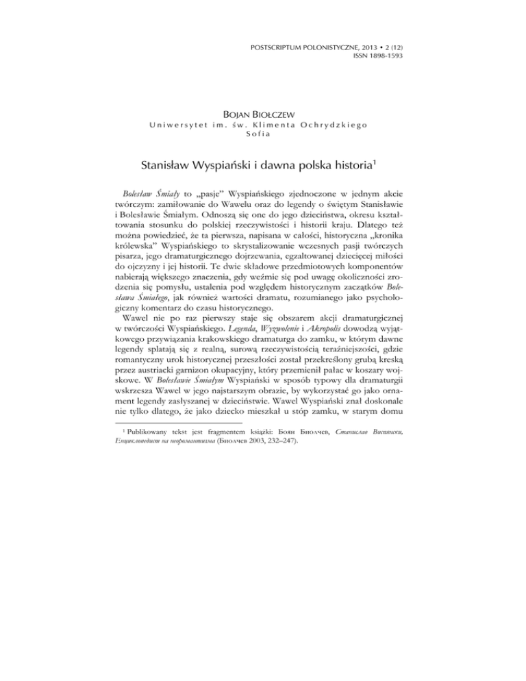 POSTSCRIPTUM POLONISTYCZNE, 2013 • 2 (12) ISSN 1898-1593 BOJAN BIOŁCZEW Uniwersytet im. św. Klimenta Ochrydzkiego Sofia Stanisław Wyspiański i dawna polska historia1 Bolesław Śmiały to „pasje” Wyspiańskiego zjednoczone w jednym akcie twórczym: zamiłowanie do Wawelu oraz do legendy o świętym Stanisławie i Bolesławie Śmiałym. Odnoszą się one do jego dzieciństwa, okresu kształtowania stosunku do polskiej rzeczywistości i historii kraju. Dlatego też można powiedzieć, że ta pierwsza, napisana w całości, historyczna „kronika królewska” Wyspiańskiego to skrystalizowanie wczesnych pasji twórczych pisarza, jego dramaturgicznego dojrzewania, egzaltowanej dziecięcej miłości do ojczyzny i jej historii. Te dwie składowe przedmiotowych komponentów nabierają większego znaczenia, gdy weźmie się pod uwagę okoliczności zrodzenia się pomysłu, ustalenia pod względem historycznym zaczątków Bolesława Śmiałego, jak również wartości dramatu, rozumianego jako psychologiczny komentarz do czasu historycznego. Wawel nie po raz pierwszy staje się obszarem akcji dramaturgicznej w twórczości Wyspiańskiego. Legenda, Wyzwolenie i Akropolis dowodzą wyjątkowego przywiązania krakowskiego dramaturga do zamku, w którym dawne legendy splatają się z realną, surową rzeczywistością teraźniejszości, gdzie romantyczny urok historycznej przeszłości został przekreślony grubą kreską przez austriacki garnizon okupacyjny, który przemienił pałac w koszary wojskowe. W Bolesławie Śmiałym Wyspiański w sposób typowy dla dramaturgii wskrzesza Wawel w jego najstarszym obrazie, by wykorzystać go jako ornament legendy zasłyszanej w dzieciństwie. Wawel Wyspiański znał doskonale nie tylko dlatego, że jako dziecko mieszkał u stóp zamku, w starym domu 1 Publikowany tekst jest fragmentem książki: Боян Биолчев, Станислав Виспянски, Енциклопедист на неоромантизма (Биолчев 2003, 232–247). 102 POSTSCRIPTUM POLONISTYCZNE, 2013 • 2 (12) przy ulicy Jana Długosza (co jest odzwierciedlone w poemacie U stóp Wawelu miał ojciec pracownię). W dziecięcym postrzeganiu wzniosłości górującego nad własnym domem zamku daje się odczuć niemal naukową pasję do oglądu jego unikatowej formy architektonicznej, precyzyjność niemal historyka sztuki w określaniu jego detali. Janina Stankiewiczowa, ciotka poety, która opiekowała się nim po śmierci jego matki, opowiadała, że nie mogła oderwać małego Wyspiańskiego od zamku i była zmuszona stać z nim godzinami przy pozornie najzwyklejszych miejscach. „I tak rozpoczęliśmy wędrówki na Wawel, z wolna od kaplicy do kaplicy, od pomnika do pomnika, od ołtarza do ołtarza. (…) On czytał w domu i przy pomnikach opisywał, aż doszliśmy do grobów królewskich” (Stankiewiczowa 1971, 8). Legendę o Bolesławie Śmiałym i biskupie św. Stanisławie Wyspiański poznaje dzięki uroczystościom na cześć świętego Stanisława, które zaczynały się 8 maja i trwały przez kilka dni. Być może zbieżność imion była przyczyną, dla której ciotka zabrała chłopca na Skałkę, gdzie poćwiartowano biskupa. W tym przypadku ważniejsze jest niezwykłe wrażenie, jakie robi na nim ta legenda. Na widok autentycznych miejsc przebudza się w nim silne poczucie więzi z legendą jest to pierwszy krok do ożywienia przypowieści, co jest częstym motywem w twórczości Wyspiańskiego. Charakterystyczna jest również reakcja małego chłopca przy sadzawce na szczycie Skałki, gdy widzi, jak ludzie czerpią z niej mętną wodę dla „zdrowia”. „W czym może im pomóc ta brudna woda?” pyta ciotkę. Już przy pierwszym spotkaniu z prostym mitem czuje w nim elementy przesądu i uprzedzenia, które w jego dziecięcej psychice wyrażają się w zrozumiałych kategoriach związku czystości ze zdrowiem. Ale być może właśnie dlatego, że głęboko ją przeżywa i cieleśnie wręcz doznaje, legenda zapada głęboko w świadomość chłopca i pozostaje w niej jako skryty katalizator tematu przez cały okres twórczości. Król Bolesław Śmiały to także przykład wpływu Słowackiego – a szczególnie jego utworu Król-Duch – na młodego Wyspiańskiego. Rzadko spotykana mieszanka legendy i historycznych faktów, zatopionych w romantycznej nastrojowości młodego państwa polskiego z XI w., urzeczywistniana przez stare krakowskie dworzyszcze oraz historyczne miejsca na Skałce, stają się u Wyspiańskiego fundamentalne dla kreacji wizerunku Bolesława Śmiałego nieustannego twórczego utrapienia pisarza (o czym świadczy również rapsod Bolesław Śmiały). Zainteresowanie baśniową nastrojowością epoki rodzi też w Wyspiańskim pragnienie zbudowania środkami plastyki dramaturgicznej jej rekwizytu w celu uzyskania efektu jej urzeczywistnionego oddziaływania i czarowności. Już jako uczeń w 1884 roku Wyspiański rysuje dwór BOJAN BIOŁCZEW: Stanisław Wyspiański i dawna polska historia 103 Bolesława Śmiałego [w Niepołomicach przyp. tłum.] (Estreicher 1971, 117). Później, jako wybitny dramaturg i artysta, pisząc dramat Bolesław Śmiały, Wyspiański stara się oddać w pełni, duchowo i wizualnie, zintegrowany jego wizerunek, gdy wraz z tekstem dramatu tworzy całą galerię szkiców z postaciami (w podobną galerię wyposażony jest również pierwszy jego dramat Legenda), co sprawia, że projekt jest niezwykle dokładny, niemal artystycznie pedantyczny, i jawi się wręcz jako scenografia do przedstawienia. Zachowało się wiele szkiców z najdokładniejszymi informacjami, graficznie wyrażonymi kierunkami ruchu aktorów na scenie, przez co Wyspiański tworzył nie tylko tekst i pomysł postaci, ale też wyrażał koncepcję wewnętrznej dynamiki całego spektaklu. To wszystko jednoznacznie wskazuje, że w okresie twórczości dojrzałej Wyspiańskiemu udało się osiągnąć kilka twórczych i biograficznych cel