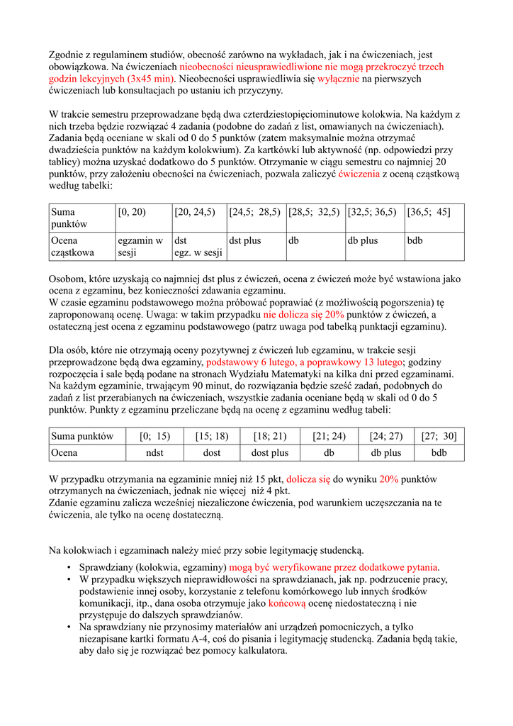 Zgodnie z regulaminem studiów, obecność zarówno na wykładach, jak i na ćwiczeniach, jest obowiązkowa. Na ćwiczeniach nieobecności nieusprawiedliwione nie mogą przekroczyć trzech godzin lekcyjnych (3x45 min). Nieobecności usprawiedliwia się wyłącznie na pierwszych ćwiczeniach lub konsultacjach po ustaniu ich przyczyny. W trakcie semestru przeprowadzane będą dwa czterdziestopięciominutowe kolokwia. Na każdym z nich trzeba będzie rozwiązać 4 zadania (podobne do zadań z list, omawianych na ćwiczeniach). Zadania będą oceniane w skali od 0 do 5 punktów (zatem maksymalnie można otrzymać dwadzieścia punktów na każdym kolokwium). Za kartkówki lub aktywność (np. odpowiedzi przy tablicy) można uzyskać dodatkowo do 5 punktów. Otrzymanie w ciągu semestru co najmniej 20 punktów, przy założeniu obecności na ćwiczeniach, pozwala zaliczyć ćwiczenia z oceną cząstkową według tabelki: Suma punktów [0, 20) [20, 24,5) [24,5; 28,5) [28,5; 32,5) [32,5; 36,5) Ocena cząstkowa egzamin w sesji dst dst plus egz. w sesji db db plus [36,5; 45] bdb Osobom, które uzyskają co najmniej dst plus z ćwiczeń, ocena z ćwiczeń może być wstawiona jako ocena z egzaminu, bez konieczności zdawania egzaminu. W czasie egzaminu podstawowego można próbować poprawiać (z możliwością pogorszenia) tę zaproponowaną ocenę. Uwaga: w takim przypadku nie dolicza się 20% punktów z ćwiczeń, a ostateczną jest ocena z egzaminu podstawowego (patrz uwaga pod tabelką punktacji egzaminu). Dla osób, które nie otrzymają oceny pozytywnej z ćwiczeń lub egzaminu, w trakcie sesji przeprowadzone będą dwa egzaminy, podstawowy 6 lutego, a poprawkowy 13 lutego; godziny rozpoczęcia i sale będą podane na stronach Wydziału Matematyki na kilka dni przed egzaminami. Na każdym egzaminie, trwającym 90 minut, do rozwiązania będzie sześć zadań, podobnych do zadań z list przerabianych na ćwiczeniach, wszystkie zadania oceniane będą w skali od 0 do 5 punktów. Punkty z egzaminu przeliczane będą na ocenę z egzaminu według tabeli: Suma punktów Ocena [0; 15) [15; 18) [18; 21) [21; 24) [24; 27) [27; 30] ndst dost dost plus db db plus bdb W przypadku otrzymania na egzaminie mniej niż 15 pkt, dolicza się do wyniku 20% punktów otrzymanych na ćwiczeniach, jednak nie więcej niż 4 pkt. Zdanie egzaminu zalicza wcześniej niezaliczone ćwiczenia, pod warunkiem uczęszczania na te ćwiczenia, ale tylko na ocenę dostateczną. Na kolokwiach i egzaminach należy mieć przy sobie legitymację studencką. • Sprawdziany (kolokwia, egzaminy) mogą być weryfikowane przez dodatkowe pytania. • W przypadku większych nieprawidłowości na sprawdzianach, jak np. podrzucenie pracy, podstawienie innej osoby, korzystanie z telefonu komórkowego lub innych środków komunikacji, itp., dana osoba otrzymuje jako końcową ocenę niedostateczną i nie przystępuje do dalszych sprawdzianów. • Na sprawdziany nie przynosimy materiałów ani urządzeń pomocniczych, a tylko niezapisane kartki formatu A-4, coś do pisania i legitymację studencką. Zadania będą takie, aby dało się je rozwiązać bez pomocy kalkulatora.