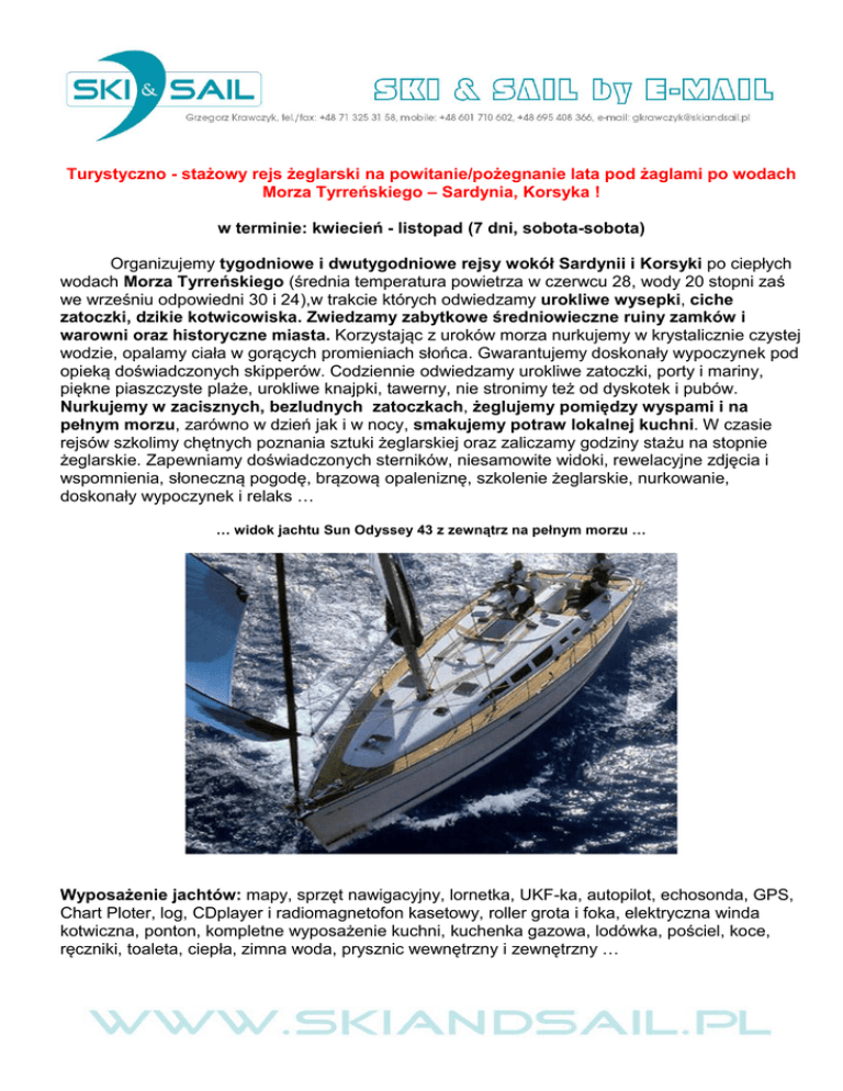 Turystyczno - stażowy rejs żeglarski na powitanie/pożegnanie lata pod żaglami po wodach Morza Tyrreńskiego – Sardynia, Korsyka ! w terminie: kwiecień - listopad (7 dni, sobota-sobota) Organizujemy tygodniowe i dwutygodniowe rejsy wokół Sardynii i Korsyki po ciepłych wodach Morza Tyrreńskiego (średnia temperatura powietrza w czerwcu 28, wody 20 stopni zaś we wrześniu odpowiedni 30 i 24),w trakcie których odwiedzamy urokliwe wysepki, ciche zatoczki, dzikie kotwicowiska. Zwiedzamy zabytkowe średniowieczne ruiny zamków i warowni oraz historyczne miasta. Korzystając z uroków morza nurkujemy w krystalicznie czystej wodzie, opalamy ciała w gorących promieniach słońca. Gwarantujemy doskonały wypoczynek pod opieką doświadczonych skipperów. Codziennie odwiedzamy urokliwe zatoczki, porty i mariny, piękne piaszczyste plaże, urokliwe knajpki, tawerny, nie stronimy też od dyskotek i pubów. Nurkujemy w zacisznych, bezludnych zatoczkach, żeglujemy pomiędzy wyspami i na pełnym morzu, zarówno w dzień jak i w nocy, smakujemy potraw lokalnej kuchni. W czasie rejsów szkolimy chętnych poznania sztuki żeglarskiej oraz zaliczamy godziny stażu na stopnie żeglarskie. Zapewniamy doświadczonych sterników, niesamowite widoki, rewelacyjne zdjęcia i wspomnienia, słoneczną pogodę, brązową opaleniznę, szkolenie żeglarskie, nurkowanie, doskonały wypoczynek i relaks … … widok jachtu Sun Odyssey 43 z zewnątrz na pełnym morzu … Wyposażenie jachtów: mapy, sprzęt nawigacyjny, lornetka, UKF-ka, autopilot, echosonda, GPS, Chart Ploter, log, CDplayer i radiomagnetofon kasetowy, roller grota i foka, elektryczna winda kotwiczna, ponton, kompletne wyposażenie kuchni, kuchenka gazowa, lodówka, pościel, koce, ręczniki, toaleta, ciepła, zimna woda, prysznic wewnętrzny i zewnętrzny … Dane techniczne czarterowanego jachtu Sun Odyssey 43: Rok budowy – 2005/2006 Długość całkowita – 13,21 m Szerokość całkowita – 4,20 m Zanurzenie – 2 m Wyporność – 9300 kg Silnik – Yanmar 75 KM Zbiornik wody – 400 l Zbiornik paliwa – 200 l Powierzchnia żagli – 92 m (Genua 53, Grot 39) Kabiny – 4 kabiny dwuosobowe + dwie toalety z WC Koje – 8 +2 (salon) rzut wnętrza jachtu … 4 kabiny 2 osobowe, salon, 2xwc, kuchnia … cc widok na salon, kuchnię i kabiny dziobowe … Planowana trasa* Sardynia/Korsyka (7dni sobota – sobota) : Północno-wschodnie wybrzeże Sardynii i południowe wybrzeże Korsyki): Portisco - Cala Coticcio - Palau - Isola di Budelli – Porto Vecchio - Bonifacio - Isola Piana La Maddalena - Mortorio - Porto Rotondo - Portisco - sześciodniowy rejs będący esencją krótkiego czarteru na Sardynii i Korsyce. Piękne zatoki, dzikie kotwicowiska, piaszczyste plaże, skaliste urwiska, mroczne jaskinie, atrakcyjne porty i mariny, ciche mariny, świeże francuskie sery, wykwintne wino, kawka na tarasie rezydencji Berlusconiego … Koszty i warunki płatności za rejs tygodniowy na osobę od: 350,00 Euro + 150,00 Euro zwrotnej kaucji za jacht Cena zawiera: koszt 7-mio dniowego jachtu Oceanis 411 lub innego tej samej klasy, 3-4 kabiny dwuosobowe + salon, 2 łazienki, usługi pilota, sternika, przewodnika, opłaty klimatyczne, ubezpieczenie NNW, KL, OC/R i OC/O – Allianz … Cena nie zawiera: opłat jachtowych (pościel, ręczniki – dla chętnych 15 Euro od osoby, sprzątania końcowego – obligatoryjnie 100 Euro za jacht, paliwo i woda – obligatoryjnie około 100 Euro za jacht, silnika do pontonu – opcjonalnie około 100 Euro), portowych (zależne od ilości odwiedzanych portów), wyżywienia, przelotu samolotem liii „EasyJet” na trasie Berlin Schoenefeld - Sardynia (Olbia) - Berlin Schoenefeld (koszt od osoby od 125 Euro - cena zależna od terminu rezerwacji i daty wylotu, im wczesniej tym taniej), transfer z i na lotnisko na Sardynii, dojazdu samochodami osobowymi lub busem i parkingu na lotnisku w Berlinie (z Wrocławia 300 km) … Rezerwacje: im wcześniej tym tańsze bilety lotnicze !!! Zaliczka: 200,00 Euro od osoby płatna przy dokonaniu rezerwacji … Prześlijcie proszę tą ofertę wszystkim Waszym znajomym aby powiększyć liczbę ewentualnych chętnych - możecie sami kompletować 6-8 osobowe załogi i dobrać dowolne terminy rejsów ! Pytania i zgłoszenia prosimy kierować: Biuro Turystyki Aktywnej i Obsługi Biznesu „Ski and Sail” Grzegorz Krawczyk Aleja Marcina Kromera 69/3, 51-163 Wrocław Konto bankowe: BPH S.A. o/Wrocław 81 1060 0076 0000 3260 0089 5711 [email protected] telefon: 0601-710-602 trasa rejsu może ulec zmienia ze względu na warunki pogodowe i żeglarskie, powyższa oferta nie stanowi oferty w rozumieniu art. 66 i następnych Kodeksu Cywilnego,