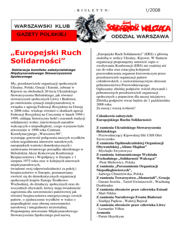 - B I UL E T Y N- „Europejski Ruch Solidarności” Deklaracja komitetu założycielskiego Międzynarodowego Stowarzyszenia Społecznego My, przedstawiciele organizacji społecznych Ukrainy, Polski, Gruzji i Estonii, zebrani w Kijowie na obchodach 20-lecia Ukraińskiego Stowarzyszenia Helsińskiego, jak również stowarzyszeń społecznych Litwy i Białorusi, po omówieniu sytuacji międzynarodowej w związku z agresją Federacji Rosyjskiej na Gruzję w 2008 roku, wiedząc również o skutkach agresji Federacji Rosyjskiej na Czeczenię w latach 1994 i 1999, oddając historyczny hołd i szacunek tradycji solidarności wobec zniewolonych narodów walczących o niepodległość, czego wyrazem było utworzenie w 1990 roku Centrum Koordynacyjnego „Warszawa-90”, wyrażając gotowość połączenia naszych wysiłków celem uzgodnienia interesów narodowych, europejskich wartości demokratycznych i zachowania światowego porządku określonego w Helsińskim Akcie Końcowym Konferencji Bezpieczeństwa i Współpracy w Europie z 1 sierpnia 1975 roku oraz w kolejnych umowach międzynarodowych, świadomi swej odpowiedzialności za pokój i bezpieczeństwo w Europie, postanawiamy zwrócić się do demokratycznych organizacji społecznych krajów Europy ŚrodkowoWschodniej, do działaczy społecznych oraz do wszystkich obywateli, którzy mają świadomość zagrożenia dla suwerenności państwowej jak również bezpieczeństwa energetycznego swoich państw, o zjednoczenie wysiłków w walce o niepodległość oraz obronę suwerenności narodowej i integralności terytorialnej. Proponujemy utworzenie Międzynarodowego Stowarzyszenia Społecznego pod nazwą 1/2008 „Europejski Ruch Solidarności” (ERS) z główną siedzibą w stolicy Ukrainy, Kijowie. W Statucie organizacji proponujemy umieścić zapis o zwoływaniu Konferencji (ERS) nie rzadziej niż raz do roku oraz rotacyjną kolejność przewodniczenia organem kierowniczym przez przedstawicieli organizacji państw członkowskich, z sześciomiesięcznym okresem pełnomocnictwa Przewodniczącego. Ogłaszamy zbiórkę podpisów wśród obywateli i pełnomocnych przedstawicieli organizacji społecznych z poparciem dla naszej inicjatywy. Zbiórka podpisów trwać będzie do 1 października 2008 roku. Za naszą i waszą wolność! Członkowie-założyciele Europejskiego Ruchu Solidarności: Z ramienia Ukraińskiego Stowarzyszenia Helsińskiego - Przewodniczący Kijowskiej filii USH Oleś Szewczenko Z ramienia Ogólnoukraińskiej Organizacji Obywatelskiej „Alians Majdan” - Mychajło Swystowycz Z ramienia Autonomicznego Wydziału Wschodniego „Solidarność Walcząca” - Piotr Hlebowicz, Polska Z ramienia „Porozumienia Organizacji Niepodległościowych”, - Jadwiga Chmielowska, Polska Z ramienia Towarzystwa „Memoriali”, Gruzja - Guram Soselia , Tarieł Gwiniaszwili , Wachtang Dzabiradze Z ramienia obrońców praw człowieka Estonii - Mart Niklus Z ramienia Narodowego Frontu Białorusi - Siarhjej Papkou , Walerij Bujwał Z ramienia obrońców praw człowieka Litwy - Leonardas Vilkas Armenia - Paruir Hayrikyan Ta siła fatalna Odkrywanie coraz to nowych kart ostatnich kilkudziesięciu lat może doprowadzić do wniosku, że niemal każde istotne wydarzenie polityczne odbywało się pod kontrolą władzy. Słaba i skłócona opozycja dawała się prowadzić za nos agentom i ludziom zmanipulowanym przez bezpiekę. Jeżeli światło dzienne ujrzą jednak nawet gorsze dokumenty i informacje niż te, które ostatnio do nas docierały, będzie to tylko połowa prawdy o Polsce. Bezpieka prowadziła grę z Polakami, grę, w której głównym decydentem była Moskwa. Pytanie, dlaczego tę grę musiała prowadzić? Dlaczego mając policję, czołgi i aparat propagandy nie była w stanie uczynić z Polaków posłusznej rzeszy wyznawców sowieckiej ideologii? Oczywiście po zniszczeniu zbrojnej opozycji były w Polsce znaczące punkty oporu, choćby Kościół katolicki. Nie tłumaczy to jednak ogromnego zaangażowania środków, gigantycznych operacji służb i skali represji. Czego bezpieka tak bardzo się bała, że wolała sterować wieloma działaniami opozycji, niż wszystko zakończyć jednym zdecydowanym posunięciem? Bała się siły gdzieś ukrytej w Polakach, która popychała nas do powstań i oporu. Która dawała zdolność do przetrwania klęsk i nadzieję zwycięstw. Ta siła kształtowała ludzi wielkich, jak Józef Piłsudski czy Jan Paweł II. Ale wpływała na każdego uczestnika historii. Nie da się odpowiedzieć na pytanie, kim jest Lech Wałęsa, zarówno bez poznania gry bezpieki, jak i wielkiej siły, która pchała go, gdy był na czele? Solidarności?. Niesamowita schizofrenia samego Wałęsy, jak i salonowych elit, które niedawno równały go z ziemią, by teraz wynosić niemal na ołtarze, wynika między innymi z tego, że tę postać w jednej osobie i w jednym momencie historycznym umieściły dwie śmiertelnie sobie wrogie siły. Sam zainteresowany, między dokumentami IPN a hołdami niedawnych jeszcze wrogów, może utracić do reszty poczucie tego, kim jest i w czym brał udział. Oczywiście jeżeli Wałęsa postanowi zagrozić któremuś z dzisiejszych wybrańców elit, szybko mu przypomną, że jest tylko facetem od rozbijania siekierą zegarków, a może nawet był agentem. Tomasz Sakiewicz ŻRÓDŁO: http://www.gazetapolska.pl Historycy związani z IPN napisali podręcznik dla maturzystów opisujący dzieje Polski od konferencji jałtańskiej do 2007 r. aut. Michał Korsun Instytut Lecha Wałęsy zlecił historykom związanym z IPN napisanie książki dla maturzystów. Książka ma opisywać dzieje Polski od konferencji jałtańskiej do 2007 r. Głównym jej celem jest poprawienie wizerunku Lecha Wałęsy po publikacji książki Sławomira Cenckiewicza i Piotra Gontarczyka „SB a Lech Wałęsa. Przyczynek do biografii", w której autorzy przedstawiają szereg dokumentów wytworzonych przez SB i UOP, pokazują