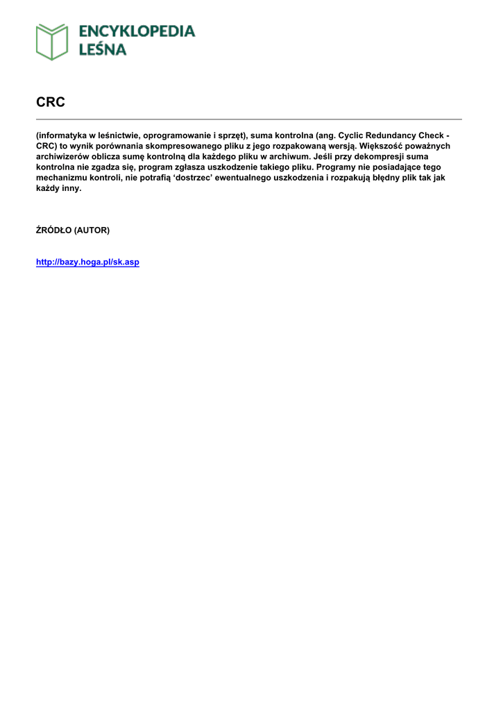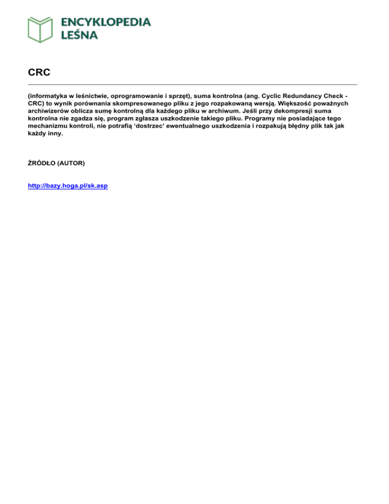 CRC (informatyka w leśnictwie, oprogramowanie i sprzęt), suma kontrolna (ang. Cyclic Redundancy Check CRC) to wynik porównania skompresowanego pliku z jego rozpakowaną wersją. Większość poważnych archiwizerów oblicza sumę kontrolną dla każdego pliku w archiwum. Jeśli przy dekompresji suma kontrolna nie zgadza się, program zgłasza uszkodzenie takiego pliku. Programy nie posiadające tego mechanizmu kontroli, nie potrafią ‘dostrzec’ ewentualnego uszkodzenia i rozpakują błędny plik tak jak każdy inny. ŹRÓDŁO (AUTOR) http://bazy.hoga.pl/sk.asp