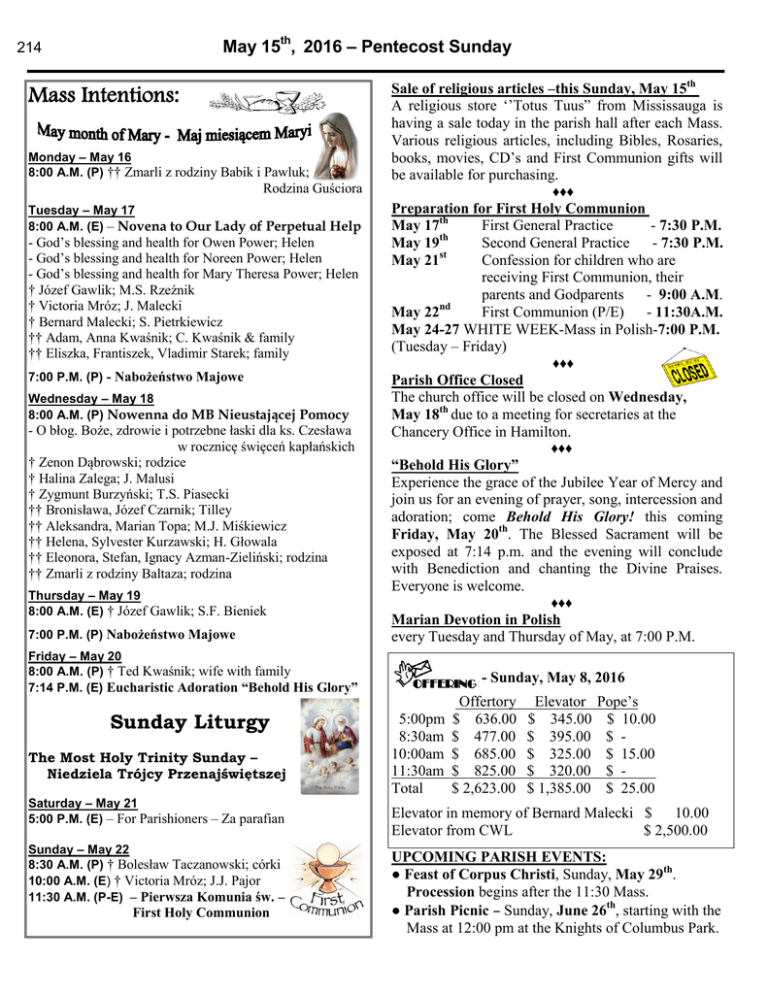 May 15th, 2016 – Pentecost Sunday 214 Mass Intentions: Monday – May 16 8:00 A.M. (P) †† Zmarli z rodziny Babik i Pawluk; Rodzina Guściora Tuesday – May 17 8:00 A.M. (E) – Novena to Our Lady of Perpetual Help - God’s blessing and health for Owen Power; Helen - God’s blessing and health for Noreen Power; Helen - God’s blessing and health for Mary Theresa Power; Helen † Józef Gawlik; M.S. Rzeźnik † Victoria Mróz; J. Malecki † Bernard Malecki; S. Pietrkiewicz †† Adam, Anna Kwaśnik; C. Kwaśnik & family †† Eliszka, Frantiszek, Vladimir Starek; family 7:00 P.M. (P) - Nabożeństwo Majowe Wednesday – May 18 8:00 A.M. (P) Nowenna do MB Nieustającej Pomocy - O błog. Boże, zdrowie i potrzebne łaski dla ks. Czesława w rocznicę święceń kapłańskich † Zenon Dąbrowski; rodzice † Halina Zalega; J. Malusi † Zygmunt Burzyński; T.S. Piasecki †† Bronisława, Józef Czarnik; Tilley †† Aleksandra, Marian Topa; M.J. Miśkiewicz †† Helena, Sylvester Kurzawski; H. Głowala †† Eleonora, Stefan, Ignacy Azman-Zieliński; rodzina †† Zmarli z rodziny Baltaza; rodzina Thursday – May 19 8:00 A.M. (E) † Józef Gawlik; S.F. Bieniek 7:00 P.M. (P) Nabożeństwo Majowe Sale of religious articles –this Sunday, May 15th A religious store ‘’Totus Tuus” from Mississauga is having a sale today in the parish hall after each Mass. Various religious articles, including Bibles, Rosaries, books, movies, CD’s and First Communion gifts will be available for purchasing. ♦♦♦ Preparation for First Holy Communion May 17th First General Practice - 7:30 P.M. th May 19 Second General Practice - 7:30 P.M. May 21st Confession for children who are receiving First Communion, their parents and Godparents - 9:00 A.M. nd May 22 First Communion (P/E) - 11:30A.M. May 24-27 WHITE WEEK-Mass in Polish-7:00 P.M. (Tuesday – Friday) ♦♦♦ Parish Office Closed The church office will be closed on Wednesday, May 18th due to a meeting for secretaries at the Chancery Office in Hamilton. ♦♦♦ “Behold His Glory” Experience the grace of the Jubilee Year of Mercy and join us for an evening of prayer, song, intercession and adoration; come Behold His Glory! this coming Friday, May 20th. The Blessed Sacrament will be exposed at 7:14 p.m. and the evening will conclude with Benediction and chanting the Divine Praises. Everyone is welcome. ♦♦♦ Marian Devotion in Polish every Tuesday and Thursday of May, at 7:00 P.M. Friday – May 20 8:00 A.M. (P) † Ted Kwaśnik; wife with family 7:14 P.M. (E) Eucharistic Adoration “Behold His Glory” Sunday Liturgy The Most Holy Trinity Sunday – Niedziela Trójcy Przenajświętszej Saturday – May 21 5:00 P.M. (E) – For Parishioners – Za parafian Sunday – May 22 8:30 A.M. (P) † Bolesław Taczanowski; córki 10:00 A.M. (E) † Victoria Mróz; J.J. Pajor 11:30 A.M. (P-E) – Pierwsza Komunia św. – First Holy Communion - Sunday, May 8, 2016 5:00pm 8:30am 10:00am 11:30am Total Offertory $ 636.00 $ 477.00 $ 685.00 $ 825.00 $ 2,623.00 Elevator $ 345.00 $ 395.00 $ 325.00 $ 320.00 $ 1,385.00 Pope’s $ 10.00 $ $ 15.00 $ $ 25.00 Elevator in memory of Bernard Malecki $ 10.00 Elevator from CWL $ 2,500.00 UPCOMING PARISH EVENTS: ● Feast of Corpus Christi, Sunday, May 29th. Procession begins after the 11:30 Mass. ● Parish Picnic – Sunday, June 26th, starting with the Mass at 12:00 pm at the Knights of Columbus Park. 214 15 maja 2016 r. – Niedziela Zesłania Ducha Świętego The Brant Haldimand Norfolk Catholic District School Board honours one student from each school at their annual Catholic Student Leadership Awards evening. Award recipients are being recognized for living out Catholic virtues at home, in school and in the community. Congratulations to: Monica Rembisz – St. Peter School Ariela Dabrowski – St. John’s College The Most Reverend Douglas Crosby, Bishop of the Diocese of Hamilton, presided over this prestigious event held last Wednesday, May 4th at Holy Trinity Catholic High School in Simcoe. The Board would like to express its sincerest appreciation to the families and parish for their role in the home-parish-school triad and the continued support of our Catholic education system. MIESIĄC MAJ POŚWIĘCONY MARYI! „Chwalcie łąki umajone” Nabożeństwa Majowe są odprawiane w każdy wtorek i czwartek maja o godz. 7:00 wieczorem. Różaniec wraz z Litanią do Matki Bożej odmawiają również członkinie Sodalicji Niewiast Różańcowych w każdą niedzielę maja o godz. 8:00 rano. Spotkajmy się z Maryją w Domu Bożym Jej Syna Jezusa Chrystusa, aby zanosić nasze modlitwy przez Jej wstawiennictwo, rozgłaszać Jej chwałę i wyśpiewać Litanię Loretańską. Niech przy Maryi zgromadzą się nasze dzieci, młodzież, dorośli. Podziękujmy za Jej matczyną opiekę i wstawiennictwo. SERDECZNIE ZAPRASZAMY WSZYSTKICH DO WSPÓLNEJ MODLITWY. 18 maja – 59. Rocznica Święceń Kapłańskich Ks. Czesława Chmurzyńskiego, CR Życzymy dużo zdrowia i opieki Bożej! Ważniejsze Wydarzenia Parafialne: Kiermasz religijny Sklep religijny „Totus Tuus” z Mississauga zaprasza w dzisiejszą niedzielę 15 maja po każdej Mszy św. do sali parafialnej na kiermasz książek i artykułów religijnych. Zakupić też można będzie akcesoria i upominki na Pierwszą Komunię św. ♦♦♦ Biuro Parafialne będzie nieczynne: w środę 18 maja - spotkanie dla sekretarek pracujących w Diecezji Hamilton. ♦♦♦ Adoracja Eucharystyczna „Behold His Glory” W najbliższy piątek 20 maja o godz. 7:14 wieczorem zapraszamy na comiesięczną adorację Najświętszego Sakramentu w języku angielskim. W modlitewny klimat wprowadzi nas pan Marcel Dion z duszpasterstwa Magnificat. Poprzez modlitwę, kontemplację i wspólny śpiew uwielbimy Chrystusa Eucharystycznego. ♦♦♦ ● Uroczystość Najświętszego Ciała i Krwi Chrystusa, Boże Ciało - niedziela 29 maja. Procesja bezpośrednio po Mszy św. o