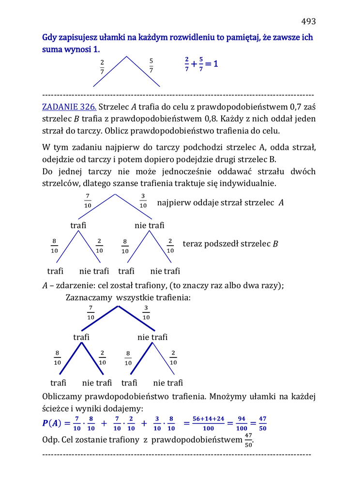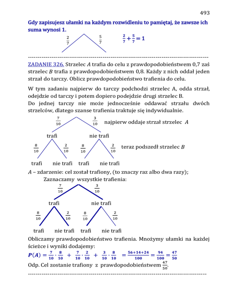 493 Gdy zapisujesz ułamki na każdym rozwidleniu to pamiętaj, że zawsze ich suma wynosi 1. + =1 -------------------------------------------------------------------------------------------ZADANIE 326. Strzelec trafia do celu z prawdopodobieństwem 0,7 zaś strzelec trafia z prawdopodobieństwem 0,8. Każdy z nich oddał jeden strzał do tarczy. Oblicz prawdopodobieństwo trafienia do celu. W tym zadaniu najpierw do tarczy podchodzi strzelec A, odda strzał, odejdzie od tarczy i potem dopiero podejdzie drugi strzelec B. Do jednej tarczy nie może jednocześnie oddawać strzału dwóch strzelców, dlatego szanse trafienia traktuje się indywidualnie. najpierw oddaje strzał strzelec trafi nie trafi teraz podszedł strzelec trafi nie trafi trafi nie trafi – zdarzenie: cel został trafiony, (to znaczy raz albo dwa razy); Zaznaczamy wszystkie trafienia: trafi trafi nie trafi nie trafi trafi nie trafi Obliczamy prawdopodobieństwo trafienia. Mnożymy ułamki na każdej ścieżce i wyniki dodajemy: Odp. Cel zostanie trafiony z prawdopodobieństwem . -------------------------------------------------------------------------------------------