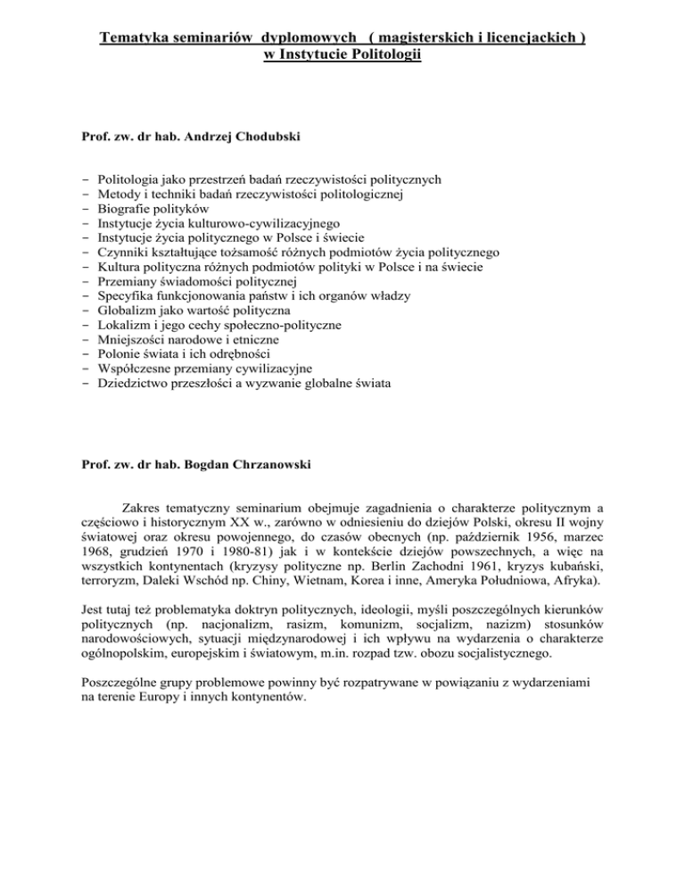 Tematyka seminariów dyplomowych ( magisterskich i licencjackich ) w Instytucie Politologii Prof. zw. dr hab. Andrzej Chodubski - Politologia jako przestrzeń badań rzeczywistości politycznych Metody i techniki badań rzeczywistości politologicznej Biografie polityków Instytucje życia kulturowo-cywilizacyjnego Instytucje życia politycznego w Polsce i świecie Czynniki kształtujące tożsamość różnych podmiotów życia politycznego Kultura polityczna różnych podmiotów polityki w Polsce i na świecie Przemiany świadomości politycznej Specyfika funkcjonowania państw i ich organów władzy Globalizm jako wartość polityczna Lokalizm i jego cechy społeczno-polityczne Mniejszości narodowe i etniczne Polonie świata i ich odrębności Współczesne przemiany cywilizacyjne Dziedzictwo przeszłości a wyzwanie globalne świata Prof. zw. dr hab. Bogdan Chrzanowski Zakres tematyczny seminarium obejmuje zagadnienia o charakterze politycznym a częściowo i historycznym XX w., zarówno w odniesieniu do dziejów Polski, okresu II wojny światowej oraz okresu powojennego, do czasów obecnych (np. październik 1956, marzec 1968, grudzień 1970 i 1980-81) jak i w kontekście dziejów powszechnych, a więc na wszystkich kontynentach (kryzysy polityczne np. Berlin Zachodni 1961, kryzys kubański, terroryzm, Daleki Wschód np. Chiny, Wietnam, Korea i inne, Ameryka Południowa, Afryka). Jest tutaj też problematyka doktryn politycznych, ideologii, myśli poszczególnych kierunków politycznych (np. nacjonalizm, rasizm, komunizm, socjalizm, nazizm) stosunków narodowościowych, sytuacji międzynarodowej i ich wpływu na wydarzenia o charakterze ogólnopolskim, europejskim i światowym, m.in. rozpad tzw. obozu socjalistycznego. Poszczególne grupy problemowe powinny być rozpatrywane w powiązaniu z wydarzeniami na terenie Europy i innych kontynentów. Prof. UG, dr Tadeusz Dmochowski - Stosunki międzynarodowe Daleki Wschód a polityka mocarstw Cywilizacyjna tożsamość Rosji Polityka zagraniczna Rosji Prof. zw. dr hab. Andrzej Gąsiorowski Historia stosunków międzynarodowych od 1918 roku do współczesności Problemy polityczne współczesnego świata Problematyka ideologii faszystowskich i realizacja Dzieje polityczne Polski 1918-1939, 1939-1945, 1945-1989, po 1989 roku Aparat przemocy i jego funkcje w państwach totalitarnych (gestapo, NKWD, UB, SB, Stasi) - Działania specjalne i ich rosnące znaczenie w polityce międzynarodowej - Dr Marek Ilnicki - system bezpieczeństwa państwa ( występujące i prognozowane zagrożenia, funkcjonowanie podmiotów odpowiedzialnych za przeciwdziałanie im oraz obowiązujące w tej materii regulacje prawne), - działalność służb granicznych i służb specjalnych oraz organów ochrony porządku publicznego w Polsce, - bezpieczeństwo komunikacji morskiej i lotniczej, - zwalczanie międzynarodowej przestępczości, w tym terroryzmu. Dr Katarzyna Kamińska-Moczyło - partie polityczne i systemy partyjne państw świata, - media i komunikowanie polityczne na świecie, - koncentracja mediów a wolność mediów i pluralizm informacji, - zachowania wyborcze kandydatów i wyborców, - paralelizm polityczny, - polityka i media Łotwy i Estonii, - polityka i media mniejszości narodowych na Łotwie i w Estonii. Dr Barbara Kijewska Komunikowanie polityczne w aspekcie medialnym Media masowe w systemie demokratycznym (analiza instytucji medialnych, zawartości i publiczności) Problematyka zaangażowania politycznego kobiet Udział kobiet w polityce (analiza ilościowa) Uwarunkowania obecności kobiet w polityce Obszary aktywności publicznej kobiet Zagadnienie równego traktowania (Gender mainstreaming) Prowadzący preferuje prace empiryczne. Dr Michał Kubiak – współzależności wzrostu gospodarczego i rozwoju społecznego, – proces starzenia się społeczeństw i jego konsekwencje, – zmiany na rynku pracy w kontekście przemian demograficznych, – problemy rynku pracy i polityka zatrudnienia, – uwarunkowania i funkcjonowanie systemów emerytalnych, – ekonomia społeczna, – warunki życia ludności, – rola organizacji pozarządowych w polityce społecznej, – polityka społeczna państwa wobec rodziny, – problemy ubóstwa i wykluczenia społecznego, – ewolucja i perspektywy państwa dobrobytu, – funkcjonowanie systemu pomocy społecznej w Polsce i w innych państwach, – problem bezdomności w Polsce, – systemy opieki zdrowotnej w wybranych państwach Unii Europejskiej, – procesy globalizacji i ich konsekwencje, – przyczyny i implikacje kryzysu gospodarczego, – polityka gospodarcza Unii Europejskiej, – doktryny ekonomiczne, – strategia i procesy transformacji gospodarczej w Polsce, – polityka budżetowa państwa. Prof. UG, dr hab. Andrzej Kubka Temat: Systemy polityczne Skandynawii 1. Państwo opiekuńcze (m.in. geneza, rozwój, problemy funkcjonowania) 2. Partie polityczne i systemy partyjne (m.in. poszczególne partie, „rodziny” partii, partie na arenach wyborczej, parlamentarnej, rządowej, zmiana systemów partyjnych) 3. Organizacje interesów i system korporatywizmu (m.in. poszczególne organizacje, relacje z ośrodkami władzy, mechanizmy decyzyjne w systemie korporatywizmu) 4. Środki masowego przekazu (m.in. prasa partyjna, systemy komunikacji politycznej) 5. Legislatywa 6. Egzekutywa 7. System administracji 8. System samorządu lokalnego 9. Główne nurty ideowe i kierunki myśli politycznej 10. Powiązania systemów politycznych Skandynawii z otoczeniem międzynarodowym. Dr Joanna Leska-Ślęzak - Media Informacja Komunikacja społeczna Polityka socjalna Przemiany cywilizacyjne, kulturowe Polonia świata Dr Sylwia Mrozowska Integracja europejska - historia integracji europejskiej zjednoczenia?) - procesy decyzyjne w UE - teoria integracji europejskiej - lobbing w UE - deficyt demokratyczny (perspektywy integracji; kryzys europejskiego - subsydiarność - polityka regionalna UE Teoria polityki − decydo
