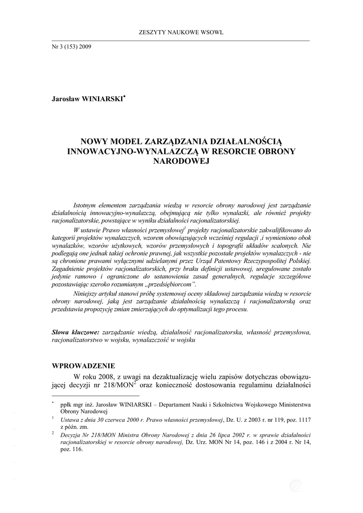 ZESZYTY NAUKOWE WSOWL Nr 3 (153) 2009 ISSN 1731-8157 Jarosław WINIARSKI NOWY MODEL ZARZĄDZANIA DZIAŁALNOŚCIĄ INNOWACYJNO-WYNALAZCZĄ W RESORCIE OBRONY NARODOWEJ Istotnym elementem zarządzania wiedzą w resorcie obrony narodowej jest zarządzanie działalnością innowacyjno-wynalazczą, obejmującą nie tylko wynalazki, ale również projekty racjonalizatorskie, powstające w wyniku działalności racjonalizatorskiej. W ustawie Prawo własności przemysłowej1 projekty racjonalizatorskie zakwalifikowano do kategorii projektów wynalazczych, wzorem obowiązujących wcześniej regulacji ,i wymieniono obok wynalazków, wzorów użytkowych, wzorów przemysłowych i topografii układów scalonych. Nie podlegają one jednak takiej ochronie prawnej, jak wszystkie pozostałe projektów wynalazczych - nie są chronione prawami wyłącznymi udzielanymi przez Urząd Patentowy Rzeczypospolitej Polskiej. Zagadnienie projektów racjonalizatorskich, przy braku definicji ustawowej, uregulowane zostało jedynie ramowo i ograniczone do ustanowienia zasad generalnych, regulacje szczegółowe pozostawiając szeroko rozumianym „przedsiębiorcom”. Niniejszy artykuł stanowi próbę systemowej oceny składowej zarządzania wiedzą w resorcie obrony narodowej, jaką jest zarządzanie działalnością wynalazczą i racjonalizatorską oraz przedstawia propozycję zmian zmierzających do optymalizacji tego procesu. Słowa kluczowe: zarządzanie wiedzą, działalność racjonalizatorska, własność przemysłowa, racjonalizatorstwo w wojsku, wynalazczość w wojsku WPROWADZENIE W roku 2008, z uwagi na dezaktualizację wielu zapisów dotychczas obowiązującej decyzji nr 218/MON2 oraz konieczność dostosowania regulaminu działalności - - 1 - - - 2 ppłk mgr inż. Jarosław WINIARSKI – Departament Nauki i Szkolnictwa Wojskowego Ministerstwa Obrony Narodowej Ustawa z dnia 30 czerwca 2000 r. Prawo własności przemysłowej, Dz. U. z 2003 r. nr 119, poz. 1117 z późn. zm. Decyzja Nr 218/MON Ministra Obrony Narodowej z dnia 26 lipca 2002 r. w sprawie działalności racjonalizatorskiej w resorcie obrony narodowej, Dz. Urz. MON Nr 14, poz. 146 i z 2004 r. Nr 14, poz. 116. NOWY MODEL ZARZĄDZANIA DZIAŁALNOŚCIĄ INNOWACYJNO - WYNALAZCZĄ… racjonalizatorskiej do aktualnej struktury organizacyjnej, a zwłaszcza zadań resortu obrony narodowej, wprowadzonych do regulaminu organizacyjnego MON3, zaistniała pilna konieczność uregulowania tej problematyki w resorcie obrony narodowej. W związku z tym, w kwietniu 2008 roku, Minister Obrony Narodowej podpisał decyzję nr 161/MON4, modyfikującą istniejące rozwiązania systemowe w tym obszarze. Najistotniejsze zmiany, w stosunku do dotychczas obowiązującej decyzji, obejmują także cały cykl życia projektów racjonalizatorskich: zmodyfikowano tryb zgłaszania projektów, rozszerzając go o uzasadnienie celowości realizacji projektu, zawierające analizę SWOT i dodanie oświadczenia twórców o niezgłoszeniu projektu w innej instytucji oraz o przekazaniu majątkowych praw autorskich podmiotowi przyjmującemu projekt do wdrożenia i rozpowszechnienia; ujednolicono tryb sporządzania opinii (ekspertyz) oraz wydawania postanowień w sprawie projektów racjonalizatorskich; uregulowano sprawę wynagradzania za projekty racjonalizatorskie, urealniając wartości przedstawione w tabelach obliczania wysokości wynagrodzenia; zmodyfikowano zasady finansowania działalności racjonalizatorskiej, poprzez włączenie do nich, poza wynagrodzeniami dla twórców i nagrodami dla zwycięzców konkursów racjonalizatorskich, także kosztów opinii/ekspertyz, wdrażania i rozpowszechniania projektów, szkoleń oraz nagród dla organizatorów działalności racjonalizatorskiej (nieetatowych inspektorów) i osób współuczestniczących we wdrażaniu projektów. Ponadto, zobowiązano również dowódców jednostek wojskowych do zgłaszania we właściwym terminie potrzeb finansowych w zakresie działalności racjonalizatorskiej do dowódców jednostek nadrzędnych. STAN AKTUALNY Z podsumowania działalności racjonalizatorskiej po pierwszym roku jej funkcjonowania w nowych uwarunkowaniach organizacyjno-prawnych wynika, że cieszy się ona stosunkowo dużym zainteresowaniem – na 520 złożonych wniosków racjonalizatorskich wdrożono 429 projektów. Tabelaryczne podsumowanie działalności racjonalizatorskiej i wynalazczej w resorcie obrony narodowej przedstawiono w Tabeli 1. Przyjęte do zastosowania projekty dotyczyły w głównej mierze organizacji szkolenia, techniki, uzbrojenia, doskonalenia systemów dowodzenia, działalności operacyjnej, wsparcia logistycznego, ochrony środowiska, modernizacji sprzętu i wydłużenia resursów międzyremontowych, poprawy warunków służby i pracy. - ANALIZA ZAGROŻEŃ Analiza funkcjonowania działalności racjonalizatorskiej w pierwszym roku obowiązywania aktualnej decyzji MON wskazuje, że obecny system posiada pewne - 3 - - - 4 Zarządzenie Nr 11/MON Ministra Obrony Narodowej z dnia 17 kwietnia 2008 r. zmieniające zarządzenie w sprawie regulaminu organizacyjnego Ministerstwa Obrony Narodowej, Dz. Urz. MON Nr 8, poz. 85. Decyzja Nr 161/MON Ministra Obrony Narodowej z dnia 9 kwietnia 2008 r. w sprawie działalności racjonalizatorskiej w resorcie obrony narodowej, Dz. Urz. MON Nr 7, poz. 80 i Nr 13, poz. 172. 145 Jarosław WINIARSKI niedoskonałości, determinujące potrzebę wprowadzenia zmian. Wprawdzie liczba zgłoszonych wniosków i wdrożonych projektów jest znaczna, to brak jest danych dotyczących jakości przyjętych rozwiązań oraz sposobów ich wykorzystania, zwłaszcza po upływie pewnego czasu od ich wdrożenia. Ponadto, istnieją realne zagrożenia związane z możliwością nieuczciwego postępowania przez twórców. Niewykluczone są również sytuacje, w których twórca zgłosi w jednostce wojskowej jako projekt racjonalizatorski rozwiązanie opracowane w ramach obowiązków służbowych, rozwiązanie już 