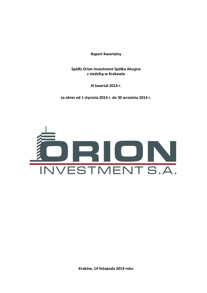 Raport Kwartalny Spółki Orion Investment Spółka Akcyjna z siedzibą w Krakowie III kwartał 2014 r. za okres od 1 stycznia 2014 r. do 30 września 2014 r. Kraków, 14 listopada 2014 roku Raport Kwartalny za III kwartał 2014 roku Spółki Orion Investment S.A. Spis treści 1. Podstawowe informacje o spółce. 2. Informacje o strukturze akcjonariatu emitenta. 3. Skrócone sprawozdanie finansowe za III kwartał 2014. 4. Stosowane metody i zasady rachunkowości. 5. Komentarz Zarządu na temat czynników i zdarzeń mających wpływ na osiągnięte i przyszłe wyniki finansowe. 6. Stanowisko Zarządu odnośnie realizowania publikowanych prognoz finansowych. 7. Opis stanu i realizacji działań i inwestycji wykazanych w dokumencie informacyjnym. 8. Informacje na temat aktywności, jaką w okresie objętym raportem emitent podejmował w obszarze rozwoju prowadzonej działalności. 9. Informacje dotyczące liczy osób zatrudnionych przez emitenta, w przeliczeniu na pełny etat. 10. Oświadczenie Zarządu Raport Kwartalny za III kwartał 2014 roku Spółki Orion Investment S.A. 1. Podstawowe informacje o spółce Dane organizacyjne Orion Investment S.A. powstała w wyniku uchwalenia statutu Spółki sporządzonego w dniu 29 listopada 2007 r., w formie aktu notarialnego (Rep. A nr 9462/2007) sporządzonego przed notariuszem Witoldem Krawczykiem w Kancelarii Notarialnej Witolda Krawczyka w Dąbrowie Górniczej przy ulicy 3 Maja 16. Spółka jest wpisana do Krajowego Rejestru Sądowego prowadzonego przez Sąd Rejonowy dla Krakowa - Śródmieścia, XI Wydział Gospodarczy Krajowego Rejestru Sądowego, pod numerem KRS 0000296656. Spółce nadano numer statystyczny REGON 2400787244. Siedziba Spółki mieści się w Krakowie przy ulicy Przemysłowej 13. Czas trwania Spółki jest nieoznaczony. Według statutu Spółki podstawowym przedmiotem jej działania jest: • kupno i sprzedaż nieruchomości na własny rachunek, • wynajem i zarządzanie nieruchomościami własnymi lub dzierżawionymi, • realizacja projektów budowlanych związanych ze wznoszeniem budynków, • zarządzanie nieruchomościami wykonywane na zlecenie. Obecnie Zarząd jest jednoosobowy: • Tadeusz Marszalik, Prezes Zarządu Rada Nadzorcza w trakcie okresu którego dotyczy raport składała z następujących członków: 1. Waldemar Gębuś – Przewodniczący Rady Nadzorczej 2. Jacek Marszalik – Wiceprzewodniczący Rady Nadzorczej 3. Sławomir Jarosz 4. Piotr Marszalik 5. Tomasz Kozieł Kapitał zakładowy Kapitał zakładowy Spółki wynosi 10 823 120 złotych i jest podzielony na 1 082 312 akcji o wartości nominalnej 10 złotych każda: a) 644 300 (sześćset czterdzieści cztery tysiące trzysta) akcji aportowych imiennych serii A, o numerach od 0000001 do 0644300, o wartości nominalnej 10,00 złotych (słownie: dziesięć złotych) każda, b) 171 270 (sto siedemdziesiąt jeden tysięcy dwieście siedemdziesiąt) akcji zwykłych na okaziciela serii B, o numerach od 0000001 do 0171270, o wartości nominalnej 10,00 złotych (słownie: dziesięć złotych) każda, c) 109 093 (sto dziewięć tysięcy dziewięćdziesiąt trzy) akcji zwykłych na okaziciela serii C, o numerach od 0000001 do 0109093, o wartości nominalnej 10,00 złotych (słownie: dziesięć złotych) każda, Raport Kwartalny za III kwartał 2014 roku Spółki Orion Investment S.A. d) 99 100 (dziewięćdziesiąt dziewięć tysięcy sto) akcji aportowych imiennych serii D, o numerach od 000001 do 099100, o wartości nominalnej 10,00 zł (słownie: dziesięć złotych) każda, e) 25 771 (dwadzieścia pięć tysięcy siedemset siedemdziesiąt jeden) akcji zwykłych na okaziciela serii E, o numerach od 000001 do 025771, o wartości nominalnej 10,00 zł (słownie: dziesięć złotych) każda, f) 32 778 (trzydzieści dwa tysiące siedemset siedemdziesiąt osiem) akcji zwykłych na okaziciela serii F, o numerach od 000001 do 032778, o wartości nominalnej 10,00 zł (słownie: dziesięć złotych) każda. Akcje serii A, B, C, D, E i F są notowane w alternatywnym systemie obrotu na rynku NewConnect. W dniu 19 lipca 2012 r. został złożony do Komisji Nadzoru Finansowego wniosek o zatwierdzenie prospektu emisyjnego Spółki, sporządzonego w związku z zamiarem ubiegania się o dopuszczenie i wprowadzenie do obrotu na rynku regulowanym Giełdy Papierów Wartościowych w Warszawie S.A.: • 644.300 Akcji zwykłych na okaziciela serii A, • 171. 270 Akcji zwykłych na okaziciela serii B, • 109.093 Akcji zwykłych na okaziciela serii C, • 99.100 Akcji zwykłych na okaziciela serii D, • 25.771 Akcji zwykłych na okaziciela serii E, • 32.778 Akcji zwykłych na okaziciela serii F, • do 200.000 Praw do Akcji serii G oraz • do 200.000 Akcji serii G. W kwietniu 2013 roku, na wniosek Zarządu Orion Investment S.A., Komisja Nadzoru Finansowego zawiesiła postępowanie w sprawie zatwierdzenia prospektu emisyjnego. Informacje o grupie kapitałowej Spółka realizuje swoje inwestycje w spółkach celowych, co jest niezbędne do prowadzenia racjonalnej i efektywnej polityki w zakresie kosztów operacyjnych oraz wiarygodnego rozliczenia zyskowności danej inwestycji. Działania takie są wymagane również z punktu widzenia instytucji finansujących, które nakłaniają przedsiębiorstwa zajmujące się projektami budowlanymi do stosowania tego typu konstrukcji celem zabezpieczenia interesów własnych oraz klientów. Orion Investment S.A. jest obecnie właścicielem pięciu spółek celowych. Spółki zależne od emitenta to: INF Orion Inwestycje Spółka z ograniczoną odpowiedzialnością Spółka komandytowo-akcyjna z siedzibą w Krakowie przy ul. Przemysłowej 13 REGON: 120882435 NIP: 676-239-48-39 KRS: 0000326836 Raport Kwartalny za III kwartał 2014 roku Spółki Orion Investment S.A. INF Orion Inwestycje Spółka z ograniczoną odpowiedzialnością z siedzibą w Krakowie przy ul. Przemysłowej 13 REGON: 120823533 NIP: 676-238-92-29 KRS: 0000316186 INF Orion Inw
