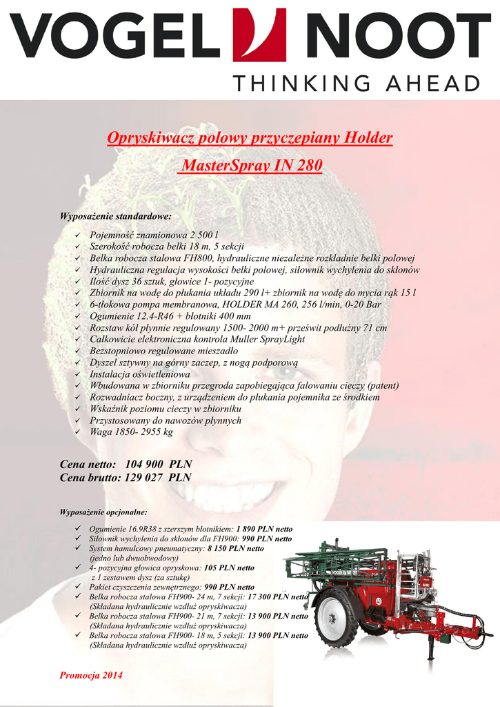 Opryskiwacz polowy przyczepiany Holder MasterSpray IN 280 Wyposażenie standardowe: Pojemność znamionowa 2 500 l Szerokość robocza belki 18 m, 5 sekcji Belka robocza stalowa FH800, hydrauliczne niezależne rozkładnie belki polowej Hydrauliczna regulacja wysokości belki polowej, siłownik wychylenia do skłonów Ilość dysz 36 sztuk, głowice 1- pozycyjne Zbiornik na wodę do płukania układu 290 l+ zbiornik na wodę do mycia rąk 15 l 6-tłokowa pompa membranowa, HOLDER MA 260, 256 l/min, 0-20 Bar Ogumienie 12.4-R46 + błotniki 400 mm Rozstaw kół płynnie regulowany 1500- 2000 m+ prześwit podłużny 71 cm Całkowicie elektroniczna kontrola Muller SprayLight Bezstopniowo regulowane mieszadło Dyszel sztywny na górny zaczep, z nogą podporową Instalacja oświetleniowa Wbudowana w zbiorniku przegroda zapobiegająca falowaniu cieczy (patent) Rozwadniacz boczny, z urządzeniem do płukania pojemnika ze środkiem Wskaźnik poziomu cieczy w zbiorniku Przystosowany do nawozów płynnych Waga 1850- 2955 kg Cena netto: 104 900 PLN Cena brutto: 129 027 PLN Wyposażenie opcjonalne: Ogumienie 16.9R38 z szerszym błotnikiem: 1 890 PLN netto Siłownik wychylenia do skłonów dla FH900: 990 PLN netto System hamulcowy pneumatyczny: 8 150 PLN netto (jedno lub dwuobwodowy) 4- pozycyjna głowica opryskowa: 105 PLN netto z 1 zestawem dysz (za sztukę) Pakiet czyszczenia zewnętrznego: 990 PLN netto Belka robocza stalowa FH900- 24 m, 7 sekcji: 17 300 PLN netto (Składana hydraulicznie wzdłuż opryskiwacza) Belka robocza stalowa FH900- 21 m, 7 sekcji: 13 900 PLN netto (Składana hydraulicznie wzdłuż opryskiwacza) Belka robocza stalowa FH900- 18 m, 5 sekcji: 13 900 PLN netto (Składana hydraulicznie wzdłuż opryskiwacza) Promocja 2014