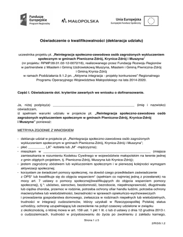 Oświadczenie o kwalifikowalności (deklaracja udziału) uczestnika projektu pt. „Reintegracja społeczno-zawodowa osób zagrożonych wykluczeniem społecznym w gminach Piwniczna-Zdrój, Krynica-Zdrój i Muszyna” (nr projektu: RPMP.09.01.02-12-0072/16), realizowanego przez Fundację Rozwoju Regionów w partnerstwie z Miastem i Gminą Uzdrowiskową Muszyna, Miastem i Gminą Piwniczna-Zdrój i Gminą Krynia-Zdrój w ramach Poddziałania 9.1.2 pn. „Aktywna integracja - projekty konkursowe” Regionalnego Programu Operacyjnego Województwa Małopolskiego na lata 2014-2020. Część I. Oświadczenie dot. kryteriów zawartych we wniosku o dofinansowanie. Ja, niżej podpisy(a) ___________________________________________ (imię i nazwisko) oświadczam, iż spełniam warunki udziału w projekcie pt. „Reintegracja społeczno-zawodowa osób zagrożonych wykluczeniem społecznym w gminach Piwniczna-Zdrój, Krynica-Zdrój i Muszyna” ponieważ: METRYKA ZGODNIE Z WNIOSKIEM - deklaruje udział w projekcie pt. „Reintegracja społeczno-zawodowa osób zagrożonych wykluczeniem społecznym w gminach Piwniczna-Zdrój, Krynica-Zdrój i Muszyna”; - płeć _________ („K” -kobieta lub „M” -mężczyzna); - mieszkam w _________________________________________________________ (miejsce zamieszkania w rozumieniu Kodeksu Cywilnego w województwie małopolskim na terenie jednej z gmin objętych projektem, tj. Piwniczna-Zdrój, Muszyna lub Krynica-Zdrój); - jestem zagrożony ubóstwem lub wykluczeniem społecznym i w pierwszej kolejności wymagam aktywizacji społecznej; - korzystam ze świadczeń pomocy społecznej, na dowód czego przedkładam zaświadczenie z OPS* lub kwalifikuje się do objęcia wsparciem* (spełniam co najmniej jedną z przesłanek) na mocy art. 7 ustawy o pomocy społecznej(kwalifikujących do objęcia wsparciem pomocy społecznej), tj.*: ubóstwo, sieroctwo, bezdomność, bezrobocie, niepełnosprawność, długotrwała lub ciężka choroba, przemoc w rodzinie, potrzeba ochrony ofiar handlu ludźmi, potrzeba ochrony macierzyństwa lub wielodzietności, bezradności w sprawach opiekuńczo-wychowawczych i prowadzenia gospodarstwa domowego, zwłaszcza w rodzinach niepełnych lub wielodzietnych, trudności w integracji cudzoziemców, którzy uzyskali w Rzeczypospolitej Polskiej status uchodźcy, ochronę uzupełniającą lub zezwolenie na pobyt czasowy udzielone w związku z okolicznością, o której mowa w art. 159 ust. 1 pkt 1 lit. c lub d ustawy z dnia 12 grudnia 2013 r. o cudzoziemcach, trudności w przystosowaniu do życia po zwolnieniu z zakładu karnego, Strona 1 z 5 2/R/3/9.1.2 - - - - - - alkoholizmu i narkomanii, zdarzenia losowego i sytuacji kryzysowej, klęski żywiołowej i ekologicznej) /* niepotrzebne skreślić/; jako osoba bezrobotna oświadczam i zapewniam, iż zastosowanie wobec mnie wyłącznie instrumentów i usług rynku pracy jest niewystarczające i istnieje konieczność zastosowania w pierwszej kolejności usług aktywnej integracji o charakterze społecznym (jeśli dotyczy); jestem osobą niepełnosprawną w stopniu znacznym lub umiarkowanym/niepełnosprawność sprzężona/intelektualna/zaburzenie psychiczne, na dowód czego przedkładam orzeczenie lub dokument potwierdzający stan zdrowia*- TAK/NIE*; jestem osobą zakwalifikowaną do III profilu pomocy zgodnie z Ustawą o promocji zatrudnienia (…)- TAK/NIE*; jestem osobą niesamodzielną wymagającą opieki lub wsparcia - TAK/NIE*; pozostaje bez pracy - TAK/NIE*; jestem członkiem rodziny objętej procedurą Niebieskiej - TAK/NIE*; otrzymuję pomocy społecznej ze względu na alkoholizm w rodzinie - TAK/NIE*; jestem osobą wielokrotnie wykluczoną społecznie - TAK/NIE*; jestem osobą korzystającą z PO PŻ 2014-2020 (dot. osób i rodzin)- TAK/NIE* /jeżeli tak proszę o podanie działań, który były lub są realizowane w ramach PO PŻ _____________________________________________________________________________ ____________________________________________________________________________/; jestem osobą zagrożoną ubóstwem lub wykluczeniem społecznym (dot. osób lub rodzin) w związku z rewitalizacją obszarów zdegradowanych, o których mowa w Wytycznych MIiR w zakresie rewitalizacji w programach operacyjnych na lata 2014-2020 - TAK/NIE*; wyrażam zgodę na ocenę w procesie rekrutacji moich barier mentalnych w takich obszarach jak brak motywacji, bierność, apatia, wycofanie, brak świadomości potrzeb (+1 pkt.); w przypadku zarejestrowania w PUP w załączeniu przedstawiam zaświadczenie potwierdzające mój status jako osoby bezrobotnej; wyrażam zgodę na wpisanie mnie na listę podstawową lub rezerwową uczestników projektu; poznałem(am) i akceptuję zasady projektu pt. „Reintegracja społeczno-zawodowa osób zagrożonych wykluczeniem społecznym w gminach Piwniczna-Zdrój, Krynica-Zdrój i Muszyna”; zostałem(am) poinformowany(a) o źródle finansowania projektu pt. „Reintegracja społecznozawodowa osób zagrożonych wykluczeniem społecznym w gminach Piwniczna-Zdrój, KrynicaZdrój i Muszyna”; wezmę udział we wszystkich zaplanowanych dla mnie formach wsparcia; zobowiązuje się podpisać w dniu pierwszych zajęć umowę o uczestnictwo w projekcie; zobowiązuje się poddać ewaluacji i monitoringowi oraz przekazać informacje o mojej sytuacji po ukończeniu projektu oraz zobowiązuje się dostarczyć do Fundacji Rozwoju Regionów dokumenty potwierdzające moją sytuacje społeczno-zatrudnieniową; Opis definicji użytych w niniejszym dokumencie znajduje się w dokumentacji konkursowej mieszczącej się pod adresem:http://www.rpo.malopolska.pl/skorzystaj/nabory/poddzialanie-9-1-2-aktywna-integracja---projekty-konkursowe---rpmp-09-01-02-ip-01-12-010-16. Personel projektu służy pomocą w zakresie wypełniania formularza oraz wyjaśnienia zagadnień związanych z kwalifikowalnością uczestników projektu. Strona 2 z 5 2/R/3/9.1.2 * nie potrzebne skreślić Część II. O