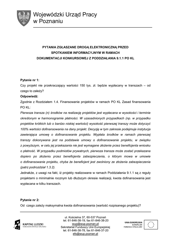 Wojewódzki Urząd Pracy w Poznaniu PYTANIA ZGŁASZANE DROGĄ ELEKTRONICZNĄ PRZED SPOTKANIEM INFORMACYJNYM W RAMACH DOKUMENTACJI KONKURSOWEJ Z PODDZIAŁANIA 9.1.1 PO KL Pytanie nr 1: Czy projekt nie przekraczający wartości 150 tys. zł. będzie wypłacany w transzach – od czego to zależy? Odpowiedź: Zgodnie z Rozdziałem 1.4. Finansowanie projektów w ramach PO KL Zasad finansowania PO KL: Pierwsza transza (n) środków na realizację projektów jest wypłacana w wysokości i terminie określonym w harmonogramie płatności. W uzasadnionych przypadkach (np. w przypadku projektów krótkich lub o bardzo niskiej wartości) wysokość pierwszej transzy może dotyczyć 100% wartości dofinansowania na dany projekt. Decyzję w tym zakresie podejmuje instytucja zawierająca umowę o dofinansowanie projektu. Wypłata środków w ramach pierwszej transzy dokonywana jest na podstawie umowy o dofinansowanie projektu, w związku z powyższym, w celu jej przekazania nie jest wymagane złożenie przez beneficjenta wniosku o płatność. W przypadku podmiotów prywatnych, pierwsza transza może zostać przekazana dopiero po złożeniu przez beneficjenta zabezpieczenia, o którym mowa w umowie o dofinansowanie projektu, chyba że beneficjent jest zwolniony ze złożenia zabezpieczenia (patrz podrozdział 1.3.2). Jednakże, z uwagi na fakt, iż projekty realizowane w ramach Poddziałania 9.1.1 są z reguły projektami o minimalnie rocznym lub dłuższym okresie realizacji, kwota dofinansowania jest wypłacana w kilku transzach. Pytanie nr 2: Od czego zależy maksymalna kwota dofinansowania (wartość rozpisanego projektu)? ul. Kościelna 37, 60-537 Poznań tel. 61-846-38-19, fax 61-846-38-20 [email protected] Sekretariat Funduszy Unii Europejskiej tel. 61-846-38-78, fax 61-846-37-20 [email protected] Odpowiedź: Dla przedmiotowego konkursu nie wyznaczono maksymalnej wartości projektu, jednakże nie może ona przekroczyć wartości dostępnej alokacji. Wobec powyższego, kwota dofinansowania zależy od zapisów we wniosku o dofinansowanie realizacji projektu. Wartość projektu jest każdorazowo uzależniona od potrzeb edukacyjnych dzieci z terenu realizacji projektu i jest indywidualna dla każdego projektu. Natomiast każdy wydatek musi wpisywać się w realizację celów projektu, oraz zostać skalkulowany w sposób racjonalny kosztowo. Ponadto, po opublikowaniu listy rankingowej, a przed podpisaniem umowy o dofinansowanie projektu prowadzone są negocjacje pomiędzy IP a Beneficjentem, w sytuacji, gdy IP uzna, że koszty zawarte we wniosku są zawyżone, to zgodnie z Zasadami dokonywania wyboru projektów w ramach PO KL: Negocjacje budżetu powinny prowadzić do ustalenia wydatków na poziomie racjonalnym i efektywnym, w szczególności do zapewnienia zgodności ze stawkami rynkowymi nie tylko pojedynczych wydatków, ale również łącznej wartości usług / towarów uwzględnionych w budżecie projektu lub całej wartości projektu. Zmniejszenie wartości projektu ustalone w wyniku negocjacji nie może wynosić więcej niż 25%. W przypadku, gdy zmniejszenie wartości projektu ustalone w wyniku negocjacji jest wyższe niż 25% IOK odstępuje od podpisania umowy o dofinansowanie projektu z danym projektodawcą. Pytanie nr 3: Czy wkład własny musi być przedstawiony na początku w formie gotówkowej, czy można go rozpisać w projekcie? Odpowiedź: Zgodnie z Rozdziałem 1.3.3. Wkład własny Zasad finansowania PO KL: Wkład własny może być wnoszony w formie: finansowej; niepieniężnej (np. w formie świadczeń wykonywanych przez wolontariuszy) – szczegółowe zasady wnoszenia wkładu niepieniężnego zawarte są w Wytycznych w zakresie kwalifikowania wydatków w ramach PO KL; dodatków lub wynagrodzeń wypłacanych przez stronę trzecią, np. w formie wynagrodzeń uczestników projektu tj. pracowników przedsiębiorstw w projektach objętych regułami pomocy publicznej, nauczycieli w ramach Działania 9.4 PO KL lub pracowników jednostek samorządu terytorialnego w ramach Działania 5.2. Wkład w formie finansowej i niepieniężnej niekoniecznie musi być wnoszony przez beneficjenta. Może być wnoszony także przez partnera i uczestników projektu, np. w formie ul. Kościelna 37, 60-537 Poznań tel. 61-846-38-19, fax 61-846-38-20 [email protected] Sekretariat Funduszy Unii Europejskiej tel. 61-846-38-78, fax 61-846-37-20 [email protected] symbolicznych opłat pobieranych od uczestników projektu (lub np. od rodziców dzieci w Poddziałaniu 9.1.1), o ile przedmiotowe środki zostały uwzględnione w zatwierdzonym wniosku o dofinansowanie projektu jako wkład własny. Natomiast w ramach niniejszego konkursu Wnioskodawca zgodnie z zapisami SzOP PO KL jest zobowiązany do wniesienia wkładu własnego w wysokości 15% wartości projektu. Wnosząc wkład własny projektodawca winien pamiętać, aby w nazwach pozycji zawrzeć informację, iż dotyczą one wkładu własnego z podaniem, czy cała pozycja dotyczy wkładu własnego, czy tylko w części. Równocześnie, wartość wkładu własnego wykazana w szczegółowym budżecie projektu musi pokrywać się z wartością wynikającą z budżetu ogólnego projektu. W przypadku, jeżeli Projektodawca pierwotnie wnosi wkład własny w formie pieniężnej, a na etapie realizacji projektu planuje dokonać zmiany na inną dozwoloną formę wkładu własnego, to winien on złożyć zmiany w projekcie, które będą każdorazowo indywidualnie analizowane przez Instytucję Pośredniczącą PO KL. Pytanie nr 4: Zgodnie z waszymi sugestiami mam pytanie zasadnicze, kto może uczestniczyć tak naprawdę w projekcie dofinansowanym z EFS? O dofinansowanie projektu ubiegać mogą się wszystkie podmioty – z wyłączeniem osób fizycznych (nie dotyczy osób prowadzących działalność gospodarczą lub oświatową na podstawie przepisów odrębnych), które jednocześnie spełniają kryteria określone w punktach 4.1.1, 4.2.1 i 4.3.1. Czy normalna osoba f