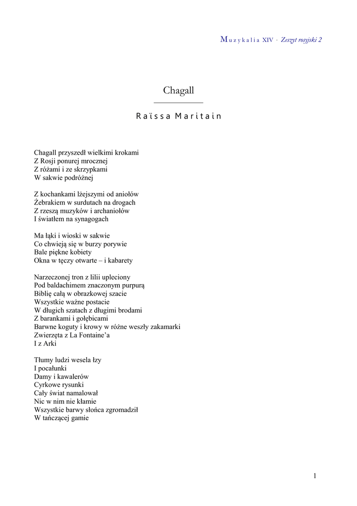Mu z y k a l i a XIV · Zeszyt rosyjski 2 Chagall Raïssa Maritain Chagall przyszedł wielkimi krokami Z Rosji ponurej mrocznej Z różami i ze skrzypkami W sakwie podróżnej Z kochankami lżejszymi od aniołów Żebrakiem w surdutach na drogach Z rzeszą muzyków i archaniołów I światłem na synagogach Ma łąki i wioski w sakwie Co chwieją się w burzy porywie Bale piękne kobiety Okna w tęczy otwarte – i kabarety Narzeczonej tron z lilii upleciony Pod baldachimem znaczonym purpurą Biblię całą w obrazkowej szacie Wszystkie ważne postacie W długich szatach z długimi brodami Z barankami i gołębicami Barwne koguty i krowy w różne weszły zakamarki Zwierzęta z La Fontaine’a I z Arki Tłumy ludzi wesela łzy I pocałunki Damy i kawalerów Cyrkowe rysunki Cały świat namalował Nic w nim nie kłamie Wszystkie barwy słońca zgromadził W tańczącej gamie 1 Mu z y k a l i a XIV · Zeszyt rosyjski 2 I jest Chrystus ukrzyżowany Na zatraconym świecie W przestrzeni jak z kości słoniowej U jego stóp świecznik zapalony Sześć świec – przez zapomnienie A w niebie kilkoro ludzi zrozpaczonych Którzy patrzą na ziemię Na linii horyzontu Ogień wszystko zajmuje Biedni Żydzi biegną w popłochu Nikt ich nie potrzebuje Nie mają miejsca na ziemi Nawet pod głowę kamieni Żydzi tułacze prawdziwi Muszą więc mieszkać w niebie Martwi i żywi Razem z przyjaciółmi Chagalla Którym coś tu być nie pozwala Toteż w chmurach wciąż przebywają Rabini zamyśleni Skrzypkowie na śniegu Co na strunach swych serc przygrywają Przełożyła: Maria Żurowska OD TŁUMACZA Raïssa Maritain (z domu Ołmasow) urodziła się w 1883 r., w Rosji, w rodzinie żydowskiej, która w 1893 r. wyemigrowała do Paryża. Raïssa podjęła studia na Sorbonie, na wydziale filozofii, gdzie poznała swojego przyszłego męża, Jacquesa Maritaina. Raïssa i Jacques pobrali się w 1904 r., a w 1906 r. przyjęli chrzest w Kościele katolickim. Ich dom w Meudon stał się ogniskiem życia duchowego i przyjacielskich spotkań, otwartym dla znajomych i nieznajomych, artystów, intelektualistów, z Francji i z innych krajów , wierzących i niewierzących. W rozmowach z nimi podejmowało się wszelkie możliwe tematy artystyczne, naukowe, polityczne, moralne i religijne. Na początku 1940 r. Maritainowie wyjechali do Kanady, a następnie do Nowego Jorku, gdzie pozostali do końca wojny. Raïssa uczestniczyła w pracy nad wszystkimi publikacjami Jacquesa, sama ogłosiła drukiem „Wielkie Przyjaźnie”, „Chagall, czyli burza zaczarowana” (wydanie polskie :„Więź”, wrzesień 2011 r.), Wiersze (wydanie polskie: „Więź”, kwiecień 2012 r.). Jej „Dziennik” (wydanie polskie: „Więź”, kwiecień 2012), opublikowany już pośmiertnie, stał się świadectwem jej życia mistycznego, starannie ukrywanego za życia nawet przed najbliższymi. Zmarła w 1960 r. Maria Żurowska 2
