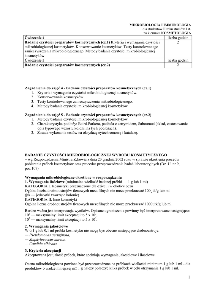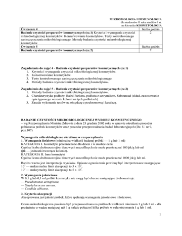 MIKROBIOLOGIA I IMMUNOLOGIA dla studentów II roku studiów I st. na kierunku KOSMETOLOGIA Ćwiczenie 4 Badanie czystości preparatów kosmetycznych (cz.1) Kryteria i wymagania czystości mikrobiologicznej kosmetyków. Konserwowanie kosmetyków. Testy kontrolowanego zanieczyszczenia mikrobiologicznego. Metody badania czystości mikrobiologicznej kosmetyków Ćwiczenie 5 Badanie czystości preparatów kosmetycznych (cz.2) liczba godzin 2 liczba godzin 2 Zagadnienia do zajęć 4 - Badanie czystości preparatów kosmetycznych (cz.1) 1. Kryteria i wymagania czystości mikrobiologicznej kosmetyków. 2. Konserwowanie kosmetyków. 3. Testy kontrolowanego zanieczyszczenia mikrobiologicznego. 4. Metody badania czystości mikrobiologicznej kosmetyków. Zagadnienia do zajęć 5 - Badanie czystości preparatów kosmetycznych (cz.2) 1. Metody badania czystości mikrobiologicznej kosmetyków. 2. Charakterystyka podłoży: Baird-Parkera, podłoża z cetrymidem, Sabouraud (skład, zastosowanie opis typowego wzrostu kolonii na tych podłożach). 3. Zasada wykonania testów na oksydazę cytochromową i katalazę. BADANIE CZYSTOŚCI MIKROBIOLOGICZNEJ WYROBU KOSMETYCZNEGO – wg Rozporządzenia Ministra Zdrowia z dnia 23 grudnia 2002 roku w sprawie określenia procedur pobierania próbek kosmetyków oraz procedur przeprowadzania badań laboratoryjnych (Dz. U. nr 9, poz.107) Wymagania mikrobiologiczne określone w rozporządzeniu 1. Wymagania ilościowe (minimalna wielkość badanej próbki — 1 g lub 1 ml) KATEGORIA I. Kosmetyki przeznaczone dla dzieci i w okolice oczu Ogólna liczba drobnoustrojów tlenowych mezofilnych nie może przekraczać 100 jtk/g lub ml (jtk — jednostki tworzące kolonie). KATEGORIA II. Inne kosmetyki Ogólna liczna drobnoustrojów tlenowych mezofilnych nie może przekraczać 1000 jtk/g lub ml. Bardzo ważna jest interpretacja wyników. Opisane ograniczenia powinny być interpretowane następująco: 102 — maksymalny limit akceptacji to 5 x 102, 103 — maksymalny limit akceptacji to 5 x 103. 2. Wymagania jakościowe W 0,1 g lub 0,1 ml próbki kosmetyku nie mogą być obecne następujące drobnoustroje: — Pseudomonas aeruginosa, — Staphylococcus aureus, — Candida albicans. 3. Kryteria akceptacji Akceptowana jest jakość próbek, które spełniają wymagania jakościowe i ilościowe. Ocena mikrobiologiczna powinna być przeprowadzona na próbkach wielkości minimum 1 g lub 1 ml - dla produktów o wadze mniejszej niż 1 g należy połączyć kilka próbek w celu otrzymania 1 g lub 1 ml. 1 Należy rozcieńczyć lub rozpuścić 1 ml lub 1 g wyrobu w mianowanym rozcieńczalniku neutralizującym w celu otrzymania rozcieńczenia 1:10. W przypadku substancji słabo wilgotniejących można dodać odpowiedni związek powierzchniowo czynny, np. 0,1% polisorbatu 80. Jeżeli konieczne jest uzyskanie kolejnych dziesiętnych rozcieńczeń, (aby osłabić aktywność przeciwdrobnoustrojową produktu lub uzyskać liczbę kolonii od 10 do 100 w celu łatwego zliczenia) należy użyć roztworu wyjściowego, stosując ten sam rozcieńczalnik neutralizujący Określenie ogólnej liczby żywych drobnoustrojów tlenowych mezofilnych powinno być prowadzone według następujących zasad: a) należy zachować ostrożność i unikać zanieczyszczenia produktu drobnoustrojami, które mogą być wykryte w próbce, b) eliminacja każdej przeciwdrobnoustrojowej właściwości produktu w czasie analizy powinna być dokonana przez rozcieńczenie, zobojętnienie lub filtrację, c) określenie ogólnej liczby żywych drobnoustrojów tlenowych mezofilnych prowadzi się, stosując techniki wylewania płytek, techniki posiewów powierzchniowych lub filtracji, d) identyfikacja określonych mikroorganizmów jest prowadzona przy użyciu selektywnych podłoży hodowlanych Ćwiczenia praktyczne Badania ilościowe - oznaczanie ogólnej liczby żywych drobnoustrojów tlenowych mezofilnych w wyrobach kosmetycznych – techniką płytek lanych, 1 ml rozcieńczeń 10-1, 10-2, 10-3 1. Przygotowanie szeregu rozcieńczeń badanego wyrobu kosmetycznego: - 1 ml kosmetyku wprowadzić jałowo do probówki z 9 ml rozcieńczalnika, mieszać – rozc. 10-1 - 1 ml rozc. 10-1 wprowadzić jałowo do probówki z 9 ml rozcieńczalnika, mieszać – rozc. 10-2 - 1 ml rozc. 10-2 wprowadzić jałowo do probówki z 9 ml rozcieńczalnika, mieszać – rozc. 10-3 2. Oznaczanie ogólnej liczby bakterii − po 1 ml każdego rozcieńczenia kosmetyku wprowadzić jałowo na 3 kolejne, sterylne szalki Petriego, − zalać upłynnionym agarem z hydrolizatem kazeiny i soi, wymieszać podłoże z inokulum, − inkubować w temp. 30-35°C, przez 3 dni − po okresie inkubacji policzyć wyrosłe kolonie − obliczyć liczbę jednostek tworzących kolonie (jtk) w 1 ml wyrobu kosmetycznego 3. Oznaczanie ogólnej liczby grzybów − po 1 ml każdego rozcieńczenia kosmetyku wprowadzić jałowo na 3 kolejne, sterylne szalki Petriego, − zalać upłynnionym podłożem Sabouraud, wymieszać podłoże z inokulum, − inkubować w temp. 20-25°C, przez 5 dni − po okresie inkubacji policzyć wyrosłe kolonie − obliczyć liczbę jednostek tworzących kolonie (jtk) w 1 ml wyrobu kosmetycznego Warunki inkubacji Oznaczenie Podłoże Ogólna liczba bakterii agar z hydrolizatem 30-35°C, 3 dni kazeiny i soi Ogólna liczba grzybów Sabouraud Liczba wyrosłych kolonii rozc. 10 -1 rozc. 10 -2 -3 rozc. 10 Liczba jtk/1 ml badanego wyrobu kosmetycznego 20-25°C, 5 dni 2 Badania jakościowe - wykrywanie obecności określonych drobnoustrojów w wyrobach kosmetycznych A Wykrywanie obecności Pseudomonas aeruginosa Wykrywanie tego mikroorganizmu przeprowadza się stosując podłoże z cetrymidem (posiew powierzchniowy; 0,1 ml kosmetyku nierozcieńczonego; inkubacja: 37°C, 24 godz.) - na podłożu tym typowe kolonie P. aeruginosa są płaskie, przejrzyste, żółto-zielonkawe do niebieskich. Należy przeprowadzić co najmniej następujące testy potwierdzające: - barw