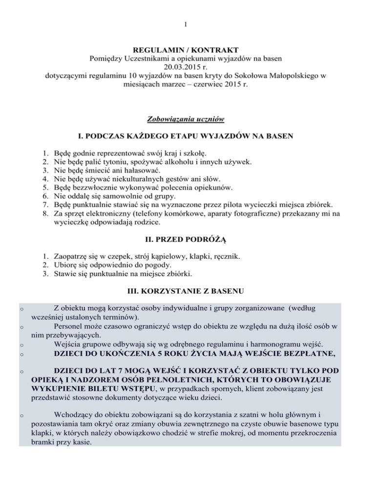 1 REGULAMIN / KONTRAKT Pomiędzy Uczestnikami a opiekunami wyjazdów na basen 20.03.2015 r. dotyczącymi regulaminu 10 wyjazdów na basen kryty do Sokołowa Małopolskiego w miesiącach marzec – czerwiec 2015 r. Zobowiązania uczniów I. PODCZAS KAŻDEGO ETAPU WYJAZDÓW NA BASEN 1. 2. 3. 4. 5. 6. 7. 8. Będę godnie reprezentować swój kraj i szkołę. Nie będę palić tytoniu, spożywać alkoholu i innych używek. Nie będę śmiecić ani hałasować. Nie będę używać niekulturalnych gestów ani słów. Będę bezzwłocznie wykonywać polecenia opiekunów. Nie oddalę się samowolnie od grupy. Będę punktualnie stawiać się na wyznaczone przez pilota wycieczki miejsca zbiórek. Za sprzęt elektroniczny (telefony komórkowe, aparaty fotograficzne) przekazany mi na wycieczkę odpowiadają rodzice. II. PRZED PODRÓŻĄ 1. Zaopatrzę się w czepek, strój kąpielowy, klapki, ręcznik. 2. Ubiorę się odpowiednio do pogody. 3. Stawie się punktualnie na miejsce zbiórki. III. KORZYSTANIE Z BASENU o o o o Z obiektu mogą korzystać osoby indywidualne i grupy zorganizowane (według wcześniej ustalonych terminów). Personel może czasowo ograniczyć wstęp do obiektu ze względu na dużą ilość osób w nim przebywających. Wejścia grupowe odbywają się wg odrębnego regulaminu i harmonogramu wejść. DZIECI DO UKOŃCZENIA 5 ROKU ŻYCIA MAJĄ WEJŚCIE BEZPŁATNE, o DZIECI DO LAT 7 MOGĄ WEJŚĆ I KORZYSTAĆ Z OBIEKTU TYLKO POD OPIEKĄ I NADZOREM OSÓB PEŁNOLETNICH, KTÓRYCH TO OBOWIĄZUJE WYKUPIENIE BILETU WSTĘPU, w przypadkach spornych, klient zobowiązany jest przedstawić stosowne dokumenty dotyczące wieku dzieci. o Wchodzący do obiektu zobowiązani są do korzystania z szatni w holu głównym i pozostawiania tam okryć oraz zmiany obuwia zewnętrznego na czyste obuwie basenowe typu klapki, w których należy obowiązkowo chodzić w strefie mokrej, od momentu przekroczenia bramki przy kasie. 2 o o o o o o o o o • • • o o o o o o o Pasek POBIERANY jest w kasie po wykupieniu biletu wstępu i zwracany zaraz do okienka kasowego po opuszczeniu strefy mokrej. Wykorzystywanie paska w inny sposób będzie traktowane jako złamanie regulaminów i taka osoba, zostanie pociągnięta do opłaty karnej w wysokości 50zł. Opłata za pierwsze 60 minut pobytu w hali basenowej ( bilet jednorazowy ) pobierana jest z góry i nie podlega zwrotowi. Po przekroczeniu czasu podstawowego 60 minut dopłaty naliczane są wg cennika. Zdanie paska w kasie jest równoznaczne z rozliczeniem się i opuszczeniem strefy mokrej obiektu. Opłata za czas pobytu w bloku odnowy rozpoczyna się po odczytaniu paska na czytniku bramki obrotowej wejściowej, a zakończa naliczanie czasu w chwili przystawienia paska do czytnika bramki wyjściowej w pomieszczeniu bloku odnowy. W czasie przebywania w bloku odnowy czas pobytu w hali basenowej jest zatrzymany. Opłata za saunę podlega dopłacie przy wyjściu wg cennika. Dokonywanie innych czynności przy bramce wejściowej do bloku odnowy, od podanych wyżej, będzie traktowane jako łamaniem regulaminów i może doprowadzić do opuszczenia hali basenowej, bez możliwości zwrotu poniesionych kosztów . Uprawnienia do wstępu ulgowego klient nabywa po okazaniu stosownych dokumentów. Za niewykorzystany bilet wstępu oraz w przypadku wydalenia klienta z obiektu z jego winy , uiszczone opłaty nie są zwracane. Korzystanie z szafek ubraniowych w szatniach głównych umożliwia pasek wydawany w kasie. Przed skorzystaniem z szafki ubraniowej w przebieralniach należy dokładnie zapoznać się z instrukcją jej obsługi, szczególnie w zakresie otwierania i zamykania, tzn. zgodności numeru na pasku z numerem szafki ubraniowej. Zmiana bielizny w strój kąpielowy lub odwrotnie, odbywa się w kabinach przebieralni znajdujących się w szatniach damskich i męskich. Wstęp na halę basenową możliwy jest tylko w stroju kąpielowym tzn. a. czepek kąpielowy b. kobiety- strój kąpielowy jednoczęściowy lub dwuczęściowy bez metalowych elementów c. mężczyźni- kąpielówki przylegające do ciała bez kieszeni i metalowych elementów Dzieci do lat trzech mogą przebywać w wodzie wyłącznie w specjalnych pielucho-majtkach. Przed wejściem na halę basnową , każda osoba jest zobowiązana do umycia całego ciała pod natryskiem z użyciem środka myjącego oraz przejścia stopami przez brodzik dezynfekcyjny. Korzystający z WC zobowiązani są bezwzględnie, przed wejściem do hali basenowej, ponownie umyć ciało pod prysznicem,. W basenie sportowym obowiązuje ruch prawostronny wzdłuż torów. Korzystający ze zjeżdżalni, wanny z hydromasażem oraz z bloku odnowy podlegają odrębnym regulaminom na w/w urządzenia. Indywidualne zajęcia nauki pływania mogą być prowadzone tylko przez osoby posiadające stosowne umowy z administracją obiektu. Uprawnieni do korzystania z szatni rodzinnej osoby z dziećmi do lat 2 W hali basenowej wyznaczone są następujące strefy, do których , po uwzględnieniu swoich umiejętności, należy dostosować własne plany aktywności. 3 o o o o o o o o o o o o o o o o o o o o o o o o o o o • • • strefa nieumiejących pływać – basen rekreacyjny o głębokości od 0,90m do 1,20m; wanna z hydromasażem; hamownia przy zjeżdżalni, brodzik o głębokości od 0,10m do 0,40m. strefa umiejących pływać – basen sportowy o głębokości od 1,20m do 1,80m Głębokość w poszczególnych strefach podane są w postaci tablic informacyjnych na kratach przelewowych kanałów niecek basenowych lub w ich pobliżu. Osoby nie umiejące pływać mogą korzystać wyłącznie ze strefy nieumiejących pływać. Zabrania się przebywania na terenie obiektu osobom obcym i niezatrudnionych po godzinach otwarcia. Zabrania się wstępu do obiektu osobom po spożyciu alkoholu oraz innych środków odurzających. Zabrania się pozostawiania dzieci bez opieki ! Całkowity zakaz obowiązuje w obiekcie: palenia tytoniu, wnoszenia, spożywania, spr