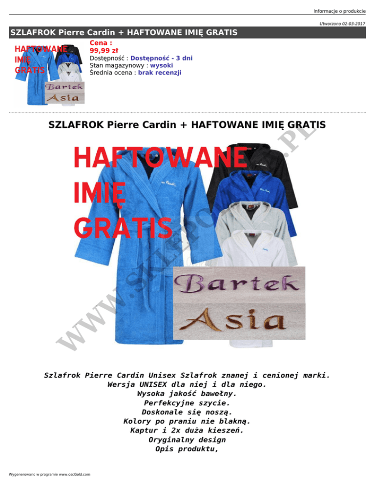 Informacje o produkcie Utworzono 02-03-2017 SZLAFROK Pierre Cardin + HAFTOWANE IMIĘ GRATIS Cena : 99,99 zł Dostępność : Dostępność - 3 dni Stan magazynowy : wysoki Średnia ocena : brak recenzji W W W .S K LE P O LI W IA .P L SZLAFROK Pierre Cardin + HAFTOWANE IMIĘ GRATIS Szlafrok Pierre Cardin Unisex Szlafrok znanej i cenionej marki. Wersja UNISEX dla niej i dla niego. Wysoka jakość bawełny. Perfekcyjne szycie. Doskonale się noszą. Kolory po praniu nie blakną. Kaptur i 2x duża kieszeń. Oryginalny design Opis produktu, Wygenerowano w programie www.oscGold.com W W W .S K LE P O LI W IA .P L Szlafrok renomowanej znanej i cenionej marki Pierre Cardin z kapturem i paskiem. Zaprojektowany z myślą o osobach lubiących i ceniących stylowe produkty najwyższej klasy. Wyprodukowany z wysokiej jakości 100% bawełny która jest miła i przyjemna w dotyku. Doskonale nadaje się na prezent dla ukochanej osoby. Specyfikacja produktuNormy: spełnia normy UE Typ: uniwersalny unisexMateriał: bawełna 100% Kolor: Biały Uniwersalny Unisex. 100% bawełna Na innych naszych aukcjach inne kolory i rozmiary. Informacje o produkcie IDEALNY NA PREZENT DODATKOWO GRATIS HAFTOWANE IMIĘ. NA KAŻDYM SZLAFROKU WYKONUJEMY METODĄ HAFTU KOMPUTEROWEGO IMIĘ PODANE PRZEZ PAŃSTWA PO ZAKUPIE. W PRZYPADKU NIE PODANIA IMIENIA JAKIE MA BYĆ WYSZYTE W FORMULARZU OPCJI WYSYŁKI - SZLAFROK ZOSTANIE WYSŁANY BEZ HAFTU Z IMIENIEM. W W W .S K LE P O LI W IA .P L HAFTOWANE IMIĘ GRATIS ! DOSTĘPNE KOLORY Wygenerowano w programie www.oscGold.com L IA .P O LI W W W W .S K LE P 1. BIAŁY 2. NIEBIESKI O LI W IA .P L Informacje o produkcie W W W .S K LE P 3. GRANATOWY 4. CZARNY Wygenerowano w programie www.oscGold.com L IA .P O LI W LE P TANIEJ NIE KUPISZ NIE ZWLEKAJ . K Dostępne opcje SZLAFROK Pierre Cardin + HAFTOWANE IMIĘ GRATIS W W W .S » Rozmiar: L, XL, M. » Kolor: biały, granatowy, niebieski, czarny.
