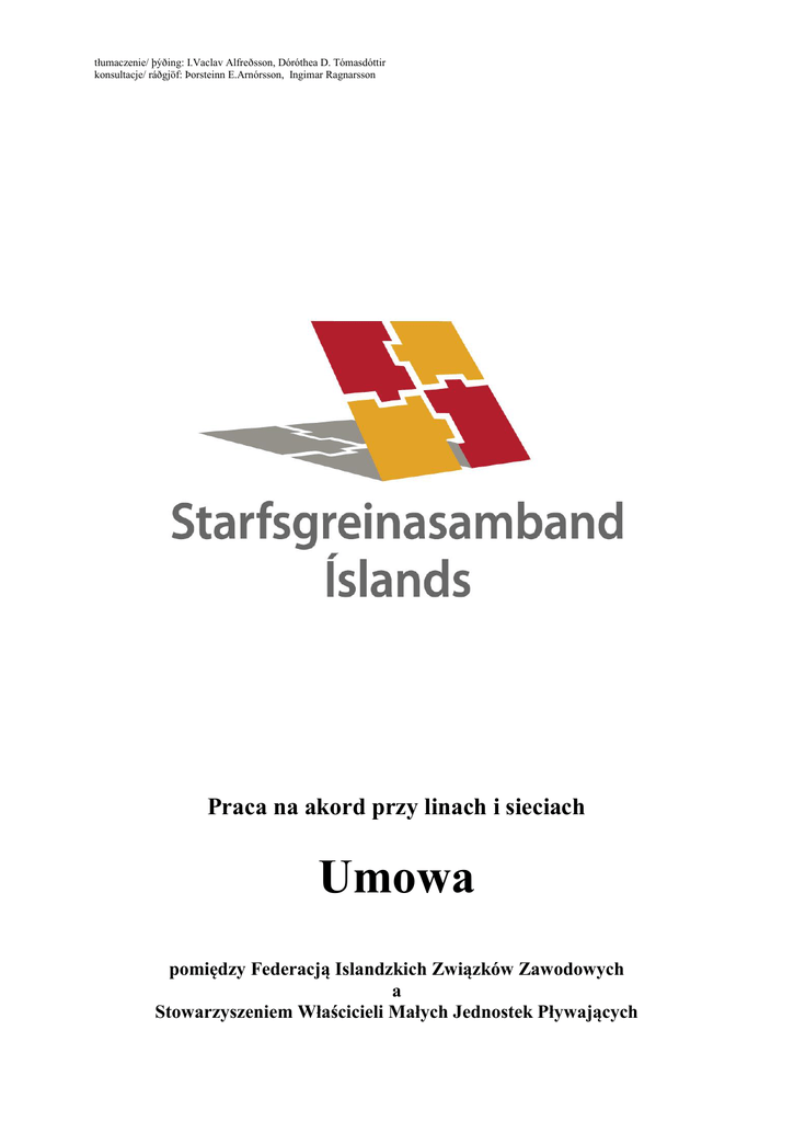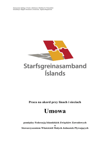 tłumaczenie/ þýðing: I.Vaclav Alfreðsson, Dóróthea D. Tómasdóttir konsultacje/ ráðgjöf: Þorsteinn E.Arnórsson, Ingimar Ragnarsson Praca na akord przy linach i sieciach Umowa pomiędzy Federacją Islandzkich Związków Zawodowych a Stowarzyszeniem Właścicieli Małych Jednostek Pływających Art. 1 Zakres obowiązywania Niniejsza umowa obowiązuje w stosunku do pracowników zatrudnionych przy układaniu lin z hakami (uppstokkun*) lub przy zakładaniu przynęty (beita*) i pracujących na lądzie, gdyż w stosunku do osób otrzymujących wynagrodzenie proporcjonalnie do wielkości połowów obowiązują ustalenia zawarte w umowach dotyczących marynarzy. Od chwili wejścia w życie niniejszej umowy rozpoczynają się rozmowy w sprawie odnowienia umowy zbiorowej dotyczącej stron, zgodnej z wcześniejszą umową zawartą pomiędzy SA a członkami ASÍ z dnia 21 grudnia 2013 r. Zgodnie z postanowieniem zawartym w niniejszej umowie zostanie wypłacona jednorazowo dla każdego pracownika będącego zatrudnionym w styczniu 2014 r. oraz nadal zatrudnionego dnia 1 lutego 2014 r. kwota 14.600 kr., biorąc pod uwagę zatrudnienie w pełnym wymiarze godzin. Wypłata powinna być proporcjonalna do wymiaru zatrudnienia. uppstokkun* – ułożenie/ponowne nastawienie (przyp. tłumacza) beita* – zakładać przynętę (przyp. tłumacza) Art. 2 Stawki wynagrodzeń a) Zakładanie i krojenie przynęty Pracownikowi zatrudnionemu przy zakładaniu przynęty na lądzie należy płacić wynagrodzenie za każdą beczkę (bjóð*) zgodnie z poniższą tabelą: 420 x 6,13 = 450 x 6,13 = 500 x 6,13 = 540 x 6,13 = 2.576 kr. 2.759 kr. 3.066 kr. 3.311 kr. z krojeniem przynęty z krojeniem przynęty z krojeniem przynęty z krojeniem przynęty Jeśli lina byłaby dłuższa, to należy wypłacać 10% dodatku za każdy hak. Część wynagrodzenia przeznaczana na urlop (orlof) nie jest uwzględniona w powyższych stawkach. Wyżej wymienione stawki określają wynagrodzenie za zakładanie przynęty i za jej krojenie, bez innychprac przy jednostce pływającej. bjóð *–beczka, pojemnik (przyp. tłumacza) b) Zakładanie przynęty bez jej krojenia Pracownikowi zatrudnionemu przy zakładaniu przynęty na lądzie należy płacić wynagrodzenie za każdą beczkę (bjóð) zgodnie z poniższą tabelą: 420 x 5,61 = 450 x 5,61 = 500 x 5,61 = 540 x 5,61 = 2.357 kr. 2.525 kr. 2.806 kr. 3.030 kr. bez krojenia przynęty bez krojenia przynęty bez krojenia przynęty bez krojenia przynęty Jeśli lina byłaby dłuższa to należy wypłacać 10% dodatku za każdy hak. Część wynagrodzenia przeznaczana na urlop (orlof) nie jest uwzględniona w powyższych stawkach. Wyżej wymienione stawki określają wynagrodzenie za zakładanie przynęty i za jej krojenie, bez innych prac przy jednostce pływającej. c) Układanie liny z hakami (uppstokkun) Za układanie liny z hakami (uppstokkun) ma być wypłacane 74% stawki za zakładanie przynęty - stawka została określona w punkcie a) niniejszego artykułu. Wynagrodzenie wypłacane za układanie liny ma być obliczane odpowiednio do długości liny w beli, w podobny sposób, jak przy stawkach za zakładanie przynęty (beita). Część wynagrodzenia przeznaczana na urlop (orlof) nie jest uwzględniona w powyższych stawkach. 420 haków na linie w beczce 450 haków na linie w beczce 500 haków na linie w beczce 540 haków na linie w beczce układanie liny układanie liny układanie liny układanie liny 1.906 kr. 2.042 kr. 2.269 kr. 2.450 kr. d) Określenie zakresu czynności wykonywanych w ramach pracy Zezwala się na zlecanie pracownikowi wykonywania prac w celu zadbania o właściwy stan liny, np. układanie liny; zezwala się także na zlecanie prac pomocniczych na terenie zakładu pracy. Powyższe dotyczy sytuacji, kiedy pracownik nie wypracował przewidzianej normy w zakresie zakładania przynęty/układania liny z hakami, która to norma zdefiniowana jest jako podstawa gwarantująca wypłacanie comiesięcznych wynagrodzeń. Zakłada się, że tego typu prace odbywają się w czasie zmiany dziennej. e) Praca w dni wolne Kiedy pracownik jest wezwany do pracy w dni wolne, zgodnie z art. 2.3.2 zawartym w głównej umowie zbiorowej, to za taką pracę dolicza się 80% dodatku do wynagrodzenia. Taki sam dodatek jest wypłacany za pracę w te niedziele, kiedy została już wypracowana cała obowiązkowa ilość pracy w danym miesiącu kalendarzowym. Art. 3 Pracownicy na lądzie Osobno należy negocjować z pracownikami, którzy zatrudnieni są przy rozładunku jednostek pływających, przy umieszczaniu surowca przeznaczonego na przynętę do miejsca przechowywania, przy rozplątywaniu lub doprowadzaniu do porządku sprzętu do łowienia z powodu uwarunkowań zewnętrzych oraz zajmującymi się innymi pracami. Pracodawcy powinni zadbać, aby na miejscu pracy znajdowała się apteczka z niezbędnymi lekarstwami oraz materiałami opatrunkowymi. Pracownicy powinni mieć zapewniony odpowiedni dostęp do toalety, umywalni oraz pomieszczenia, gdzie mogą napić się kawy lub herbaty oraz przechowywać odzież ochronną. Art. 4 Wymiar zatrudnienia Pracownik układający linę lub zakładający przynętę na określoną ilość bel (bjóð) na dzień zgodnie z poniższym wyszczególnieniem uważany jest za zatrudnionego w pełnym wymiarze godzin przy zakładaniu przynęty. Jeśli pracownik jest zatrudniony do zakładania przynęty na inną niż wyszczególniona poniżej ilość bel, to jego wymiar zatrudnienia proporcjonalnie się zmniejsza. Za pracę w pełnym wymiarze godzin zgodnie z definicją zawartą w tej umowie uważa się pracę przy zakładaniu przynęty przez 14 dni każdego miesiąca. Zakładanie przynęty oraz jej krojenie: 420 haków na linie w beczce = 6,55 beczek na dzień 450 haków na linie w beczce = 6,11 beczek na dzień 500 haków na linie w beczce = 5,50 beczek na dzień 540 haków na linie w beczce = 5,09 beczek na dzień Zakładanie przynęty bez jej krojenia: 420 