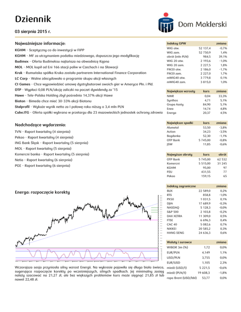 Dziennik 03 sierpnia 2015 r. Najważniejsze informacje: Indeksy GPW WIG otw. WIG zam. obrót (mln PLN) WIG 20 otw. WIG 20 zam. FW20 otw. FW20 zam. mWIG40 otw. mWIG40 zam. KGHM - Sceptyczny co do inwestycji w FIPP KGHM - MF za utrzymaniem podatku miedziowego, dopuszcza jego modyfikację Budimex - Oferta Budimeksu najtańsza na obwodnicę Kępna MOL - MOL kupił od Eni 166 stacji paliw w Czechach i na Słowacji Kruk - Rumuńska spółka Kruka została partnerem International Finance Corporation LC Corp - Walne zdecydowało o programie skupu akcji własnych CI Games - Chce wypowiedzieć umowę dystrybutorowi swoich gier w Ameryce Płn. i Płd. DTP - Wypłaci 0,08 PLN/akcję zaliczki na poczet dywidendy za '15 Hawe - Tele-Polska Holding zbył pośrednio 14,37% akcji Hawe Bioton - Bimeda chce mieć 30-33% akcji Biotonu Stalprofil - Wykaże wynik netto za I połowę roku niższy o 3,4 mln PLN Cube.ITG - Oferta spółki wybrana w przetargu dla 23 mazowieckich jednostek ochrony zdrowia Największe wzrosty kurs zmiana 0,04 4,71 84,90 14,74 20,37 33,3% 5,1% 5,1% 4,8% 4,5% kurs zmiana 53,50 34,23 52,30 5 745,00 11,85 -3,8% -3,5% -1,1% -0,8% -0,6% Alumetal Action Bogdanka OTP Bank JSW TVN - Raport kwartalny (4 sierpnia) Pekao - Raport kwartalny (4 sierpnia) ING Bank Śląsk - Raport kwartalny (5 sierpnia) -0,7% 1,4% 39,1% -1,0% 1,8% -1,7% 1,7% 0,1% 1,0% NWR Synthos Grupa Azoty Enea Energa Największe spadki Nadchodzące wydarzenia: zmiana 52 137,4 52 750,9 984,5 2 193,6 2 227,5 2 186,0 2 227,0 3 779,8 3 815,0 MOL - Raport kwartalny (5 sierpnia) Komercni banka - Raport kwartalny (5 sierpnia) Najwyższe obroty Netia - Raport kwartalny (6 sierpnia) OTP Bank Komercni KGHM PZU Pekao PGE - Raport kwartalny (6 sierpnia) kurs obrót 5 745,00 5 515,00 95,00 431,55 159,15 62 532 31 245 97 77 65 Indeksy zagraniczne Energa: rozpoczęcie korekty 26.0 25.5 25.0 24.5 24.0 23.5 23.0 22.5 22.0 21.5 21.0 20.5 20.0 19.5 19.0 18.5 18.0 17.5 17.0 16.5 BUX RTS PX50 DJIA NASDAQ S&P 500 DAX XETRA FTSE CAC 40 NIKKEI HANG SENG zmiana 22 589,0 858,8 1 031,5 17 689,9 5 128,3 2 103,8 11 309,0 6 696,3 5 082,6 20 585,2 24 636,3 0,2% -1,0% 0,1% -0,3% -0,0% -0,2% 0,5% 0,4% 0,7% 0,3% 0,6% 16.0 15.5 15.0 14.5 Waluty i surowce 0,0% EUR/PLN 4,149 1,1% USD/PLN 3,755 0,0% EUR/USD 1,105 2,3% Wczorajsza sesja przyniosła silny wzrost Energii. Na wykresie pojawiła się długa biała świeca, miedź (USD/t) 5 221,5 sugerująca rozpoczęcie korekty po wcześniejszych, silnych spadkach. Jej minimalny zasięg miedź (PLN/t) 19 608,3 należy szacować na 21,27 zł, ale bez większych problemów kurs może sięgnąć 21,85 zł lub ropa Brent (USD/bbl) 53,77 nawet 22,48 zł. -0,6% 100 WIBOR 3m (%) zmiana 1,72 14.0 90 80 70 60 50 40 30 20 10 0 2014 February March April May June July Augus t Septem ber October Novem ber Decem ber 2015 February March April May June July Augus t -1,8% 0,0% Dziennik 03 sierpia 2015 r. Najważniejsze informacje: KGHM Sceptyczny co do inwestycji w FIPP KGHM poinformował, że jest coraz bardziej sceptyczny co do zaangażowania w Fundusz Inwestycji Polskich Przedsiębiorstw, mający m.in. wspierać polskie górnictwo węgla. KGHM potwierdził również, że celem wydobycia w Sierra Gorda na ten rok jest 110 tys. miedzi, ale zaznaczył, że cel wydobycia molibdenu jest zagrożony. Spółka nie planuje w tym roku odpisów aktywów pomimo znaczącego spadku cen miedzi. (Reuters) KGHM MF za utrzymaniem podatku miedziowego, dopuszcza jego modyfikację Ministerstwo Finansów jest za utrzymaniem podatku miedziowego, ale dopuszcza jego modyfikację poinformował Mateusz Szczurek, minister finansów. (PAP) Budimex Oferta Budimeksu najtańsza na obwodnicę Kępna Oferta Budimeksu za 66 mln PLN okazała się najtańsza w przetargu na budowę obwodnicy Kępna w ciągu drogi krajowej nr S-11. W przetargu złozonych zostało 10 ofert. Drugą pod względem ceny ofertę złożyła Skanska za 71,85 mln PLN. Każdy z wykonawców zaproponował 28-miesięczny termin wykonania zamówienia i 10 lat gwarancji. (PAP) MOL MOL kupił od Eni 166 stacji paliw w Czechach i na Słowacji MOL zakończył proces przejęcia od Eni 125 stacji paliw w Czechach i 41 na Słowacji oraz sieci dystrybucji Agip w tych krajach. W wyniku transakcji MOL posiada 316 stacji paliw w Czechach oraz 253 na Słowacji. (PAP) Kruk Rumuńska spółka Kruka została partnerem International Finance Corporation Amerykańska organizacja International Finance Corporation wybrała rumuńską spółkę Kruka na partnera operacyjnego w potencjalnym projekcie inwestycyjnym, polegającym na utworzeniu spółki celowej. Celem jest podjęcie negocjacji w zakresie zakupu niezabezpieczonych wierzytelności detalicznych. (PAP) LC Corp Walne zdecydowało o programie skupu akcji własnych NWZ LC Corp podjęło w piątek uchwałę ws. udzielania zarządowi upoważnienia do skupu akcji własnych. Zgodnie z projektem uchwał na walne, liczba akcji nabywanych na podstawie upoważnienia wraz z innymi akcjami własnymi posiadanymi przez spółkę nie będzie wyższa niż 89.511.662. (PAP) CI Games Chce wypowiedzieć umowę dystrybutorowi swoich gier w Ameryce Płn. i Płd. CI Games chce wypowiedzieć umowę zawartą z Bandai Namco Games America, której przedmiotem była dystrybucja gier Enemy Front i Lords of the Fallen w Ameryce Północnej, Środkowej i Południowej. (PAP) DTP Wypłaci 0,08 PLN/akcję zaliczki na poczet dywidendy za '15 Zarząd DTP zdecydował, by do akcjonariuszy trafiło 2,86 mln zł zaliczki na poczet dywidendy za 2015 r., co daje 0,08 PLN na akcję. Dzień dywidendy ustalono na 24 sierpnia, a dzień wypłaty zaliczki na 31 sierpnia 2015 r. (PAP) Hawe Tele-Polska Holding zbył pośrednio 14,37% akcji Hawe Tele-Polska Holding podpisał umowę sprzedaży 100% udziałów spółki Trinitybay Investments, zbywając tym samym pośrednio, 14,37% akcji Hawe. Kupującym jest spółka prawa cypryjskiego Misami Limited. (PAP) Bioton Bimeda chce mieć 30-33% akcji Biotonu Bioton poinfor